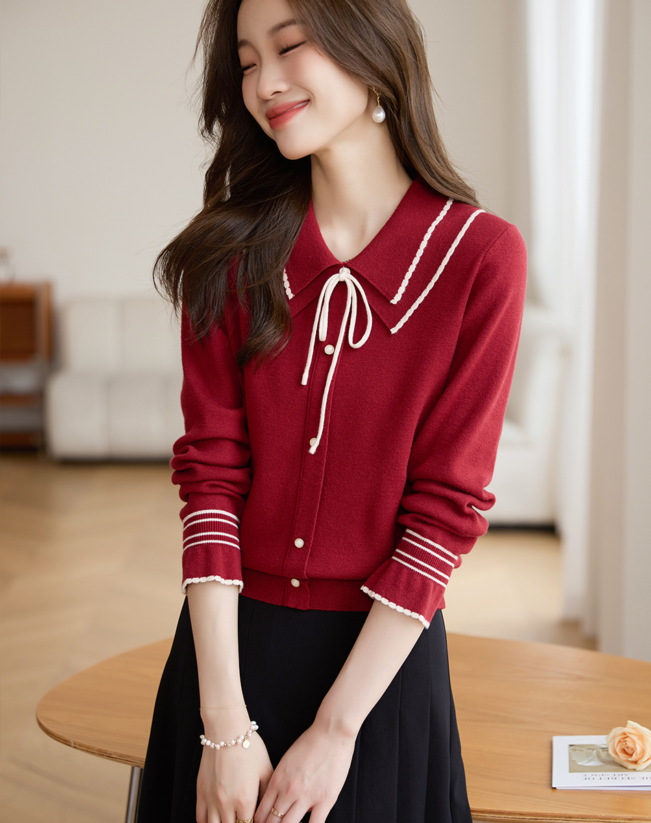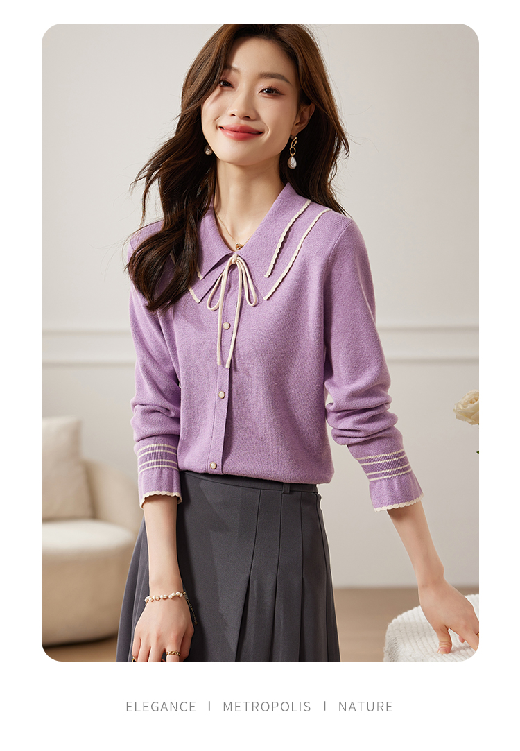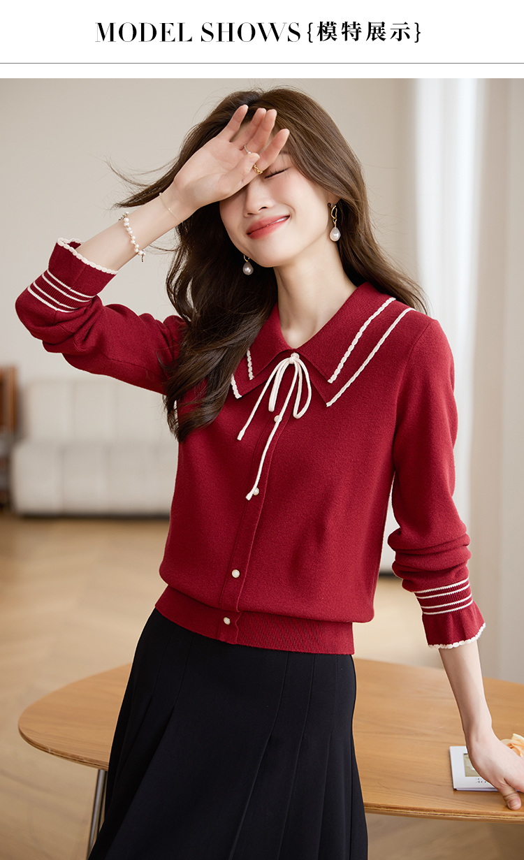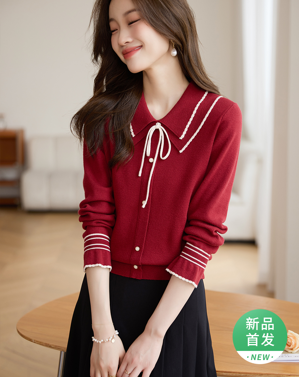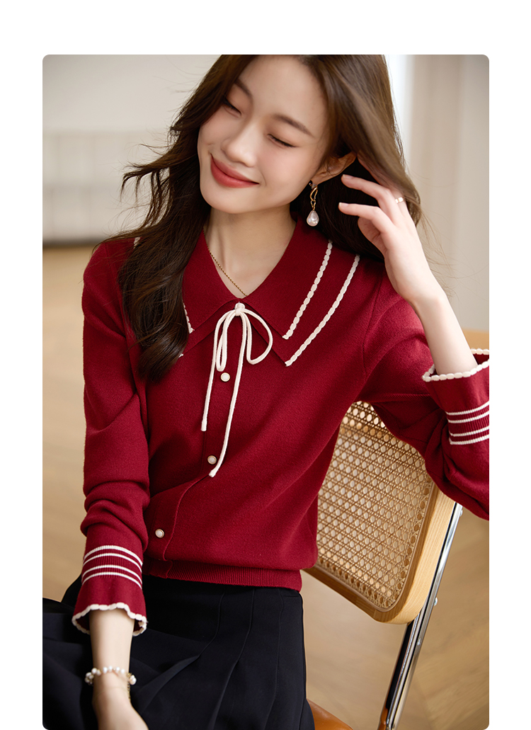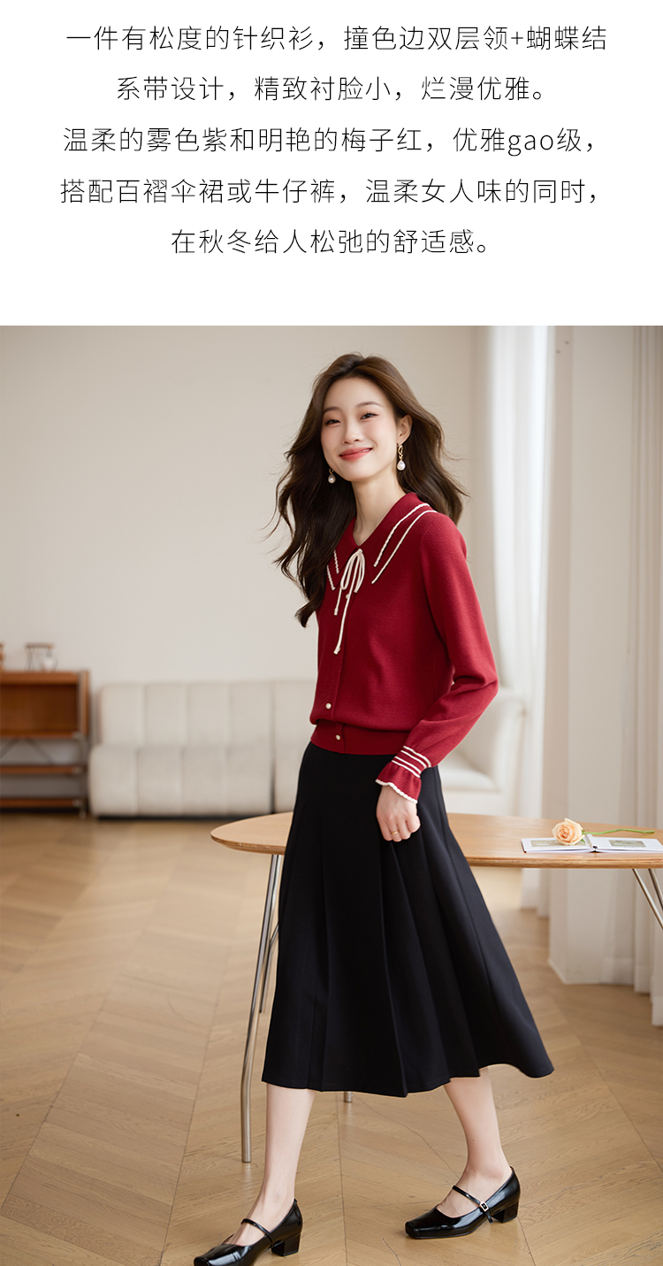 【专属特惠】熙世界2025秋季新款优雅气质撞色飘带翻领针织衫女