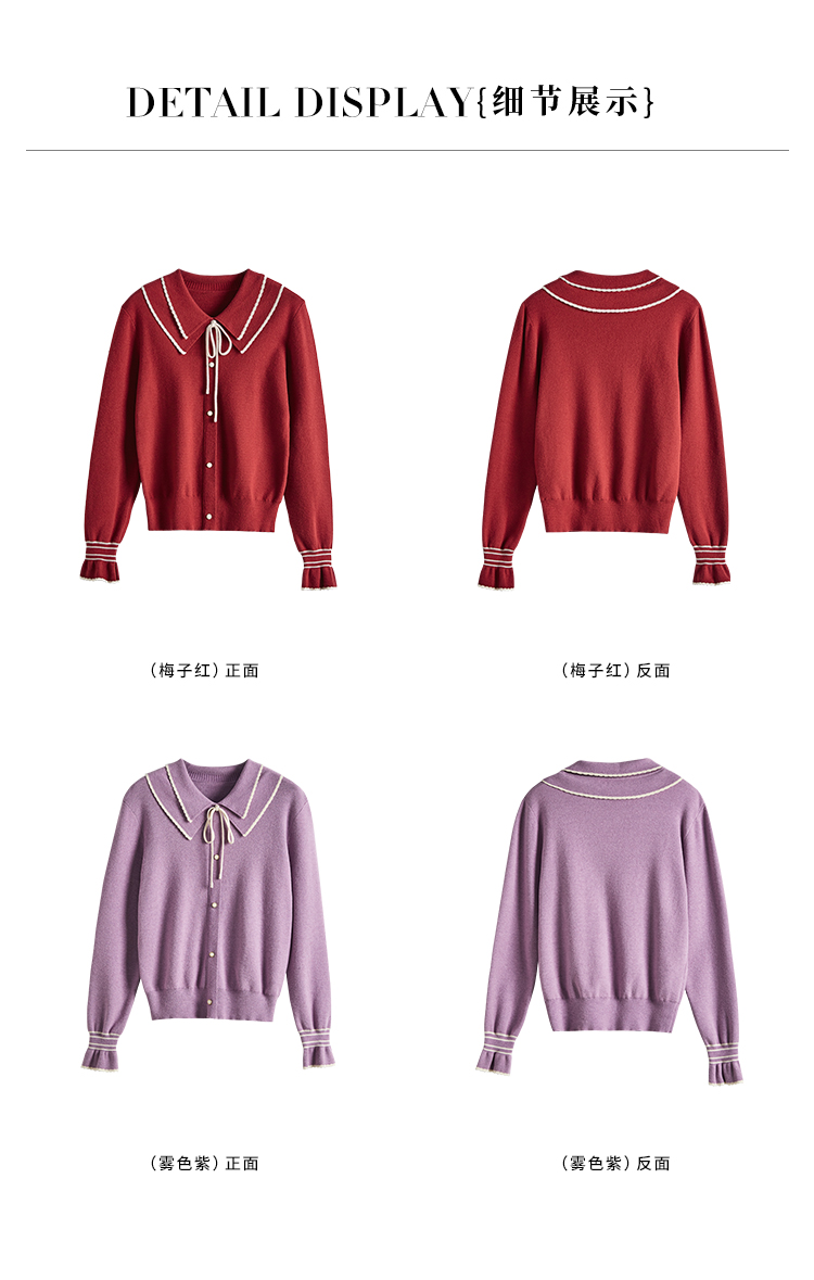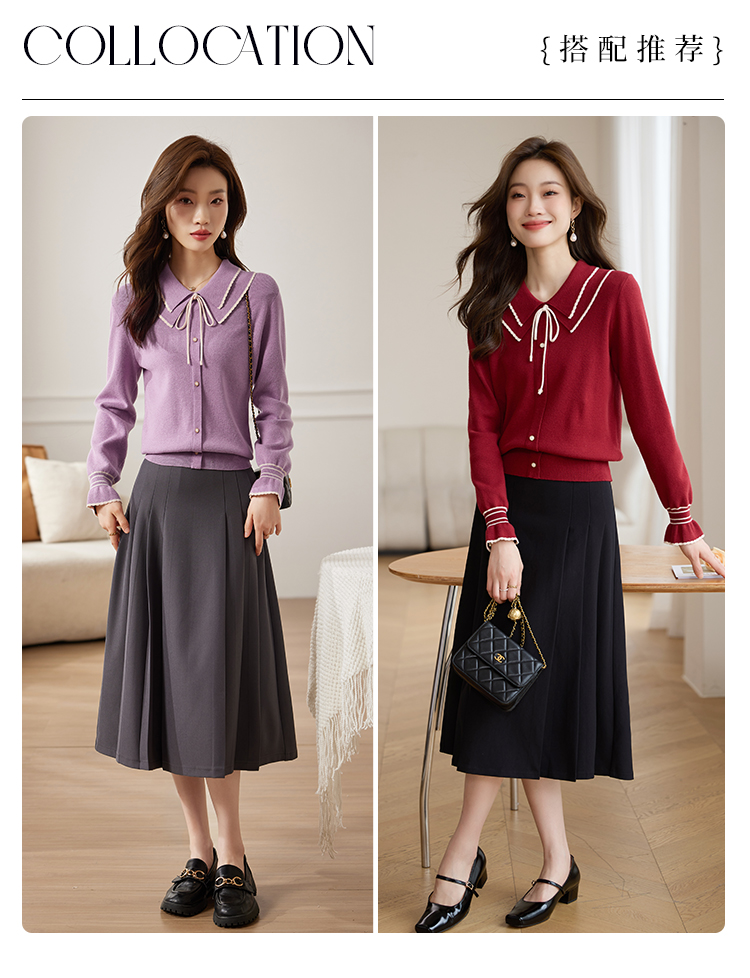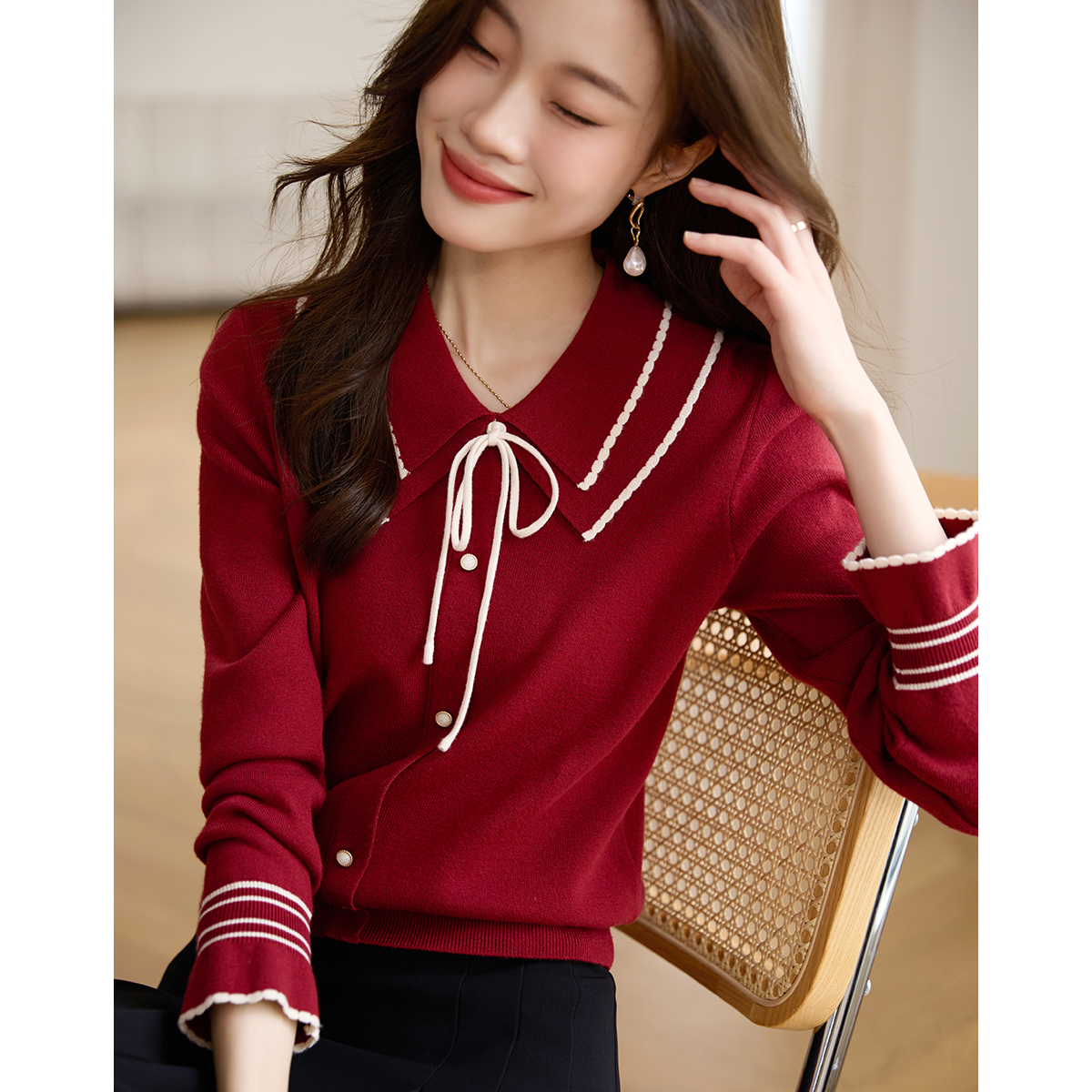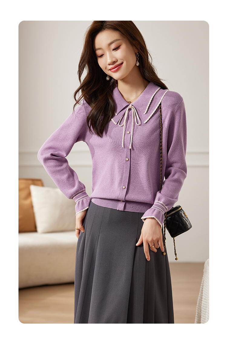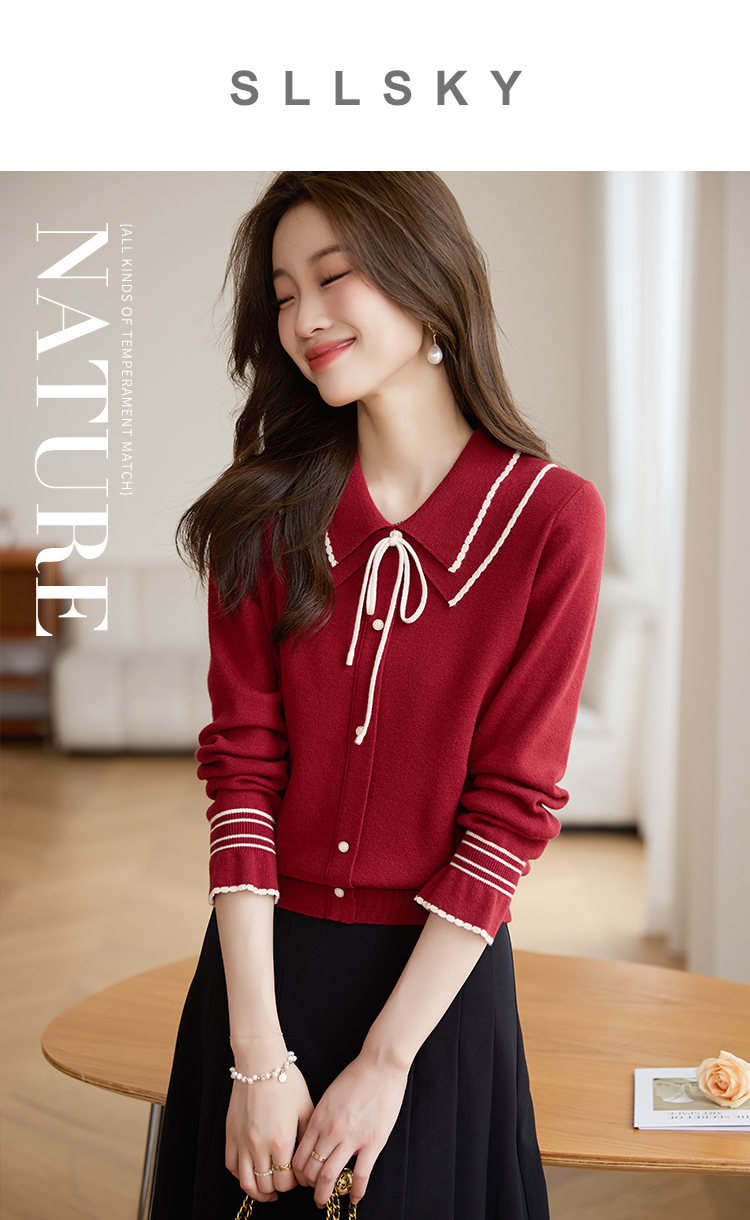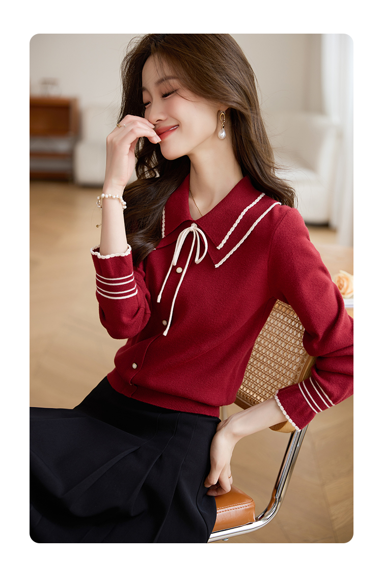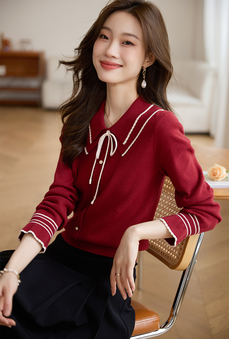 【专属特惠】熙世界2025秋季新款优雅气质撞色飘带翻领针织衫女