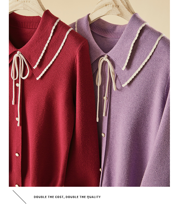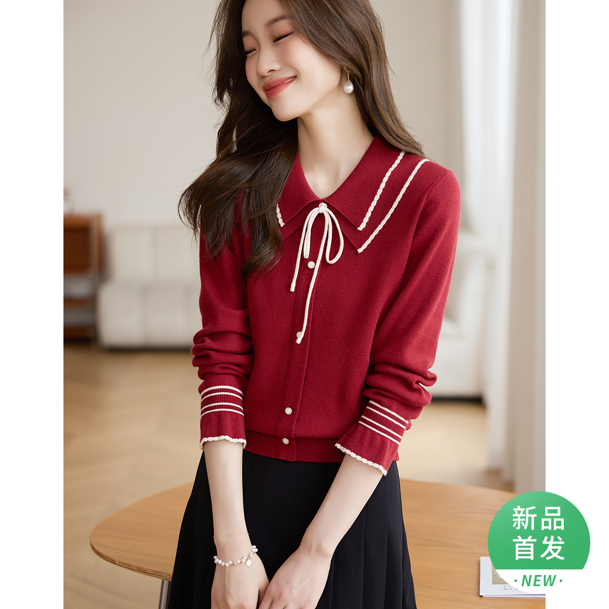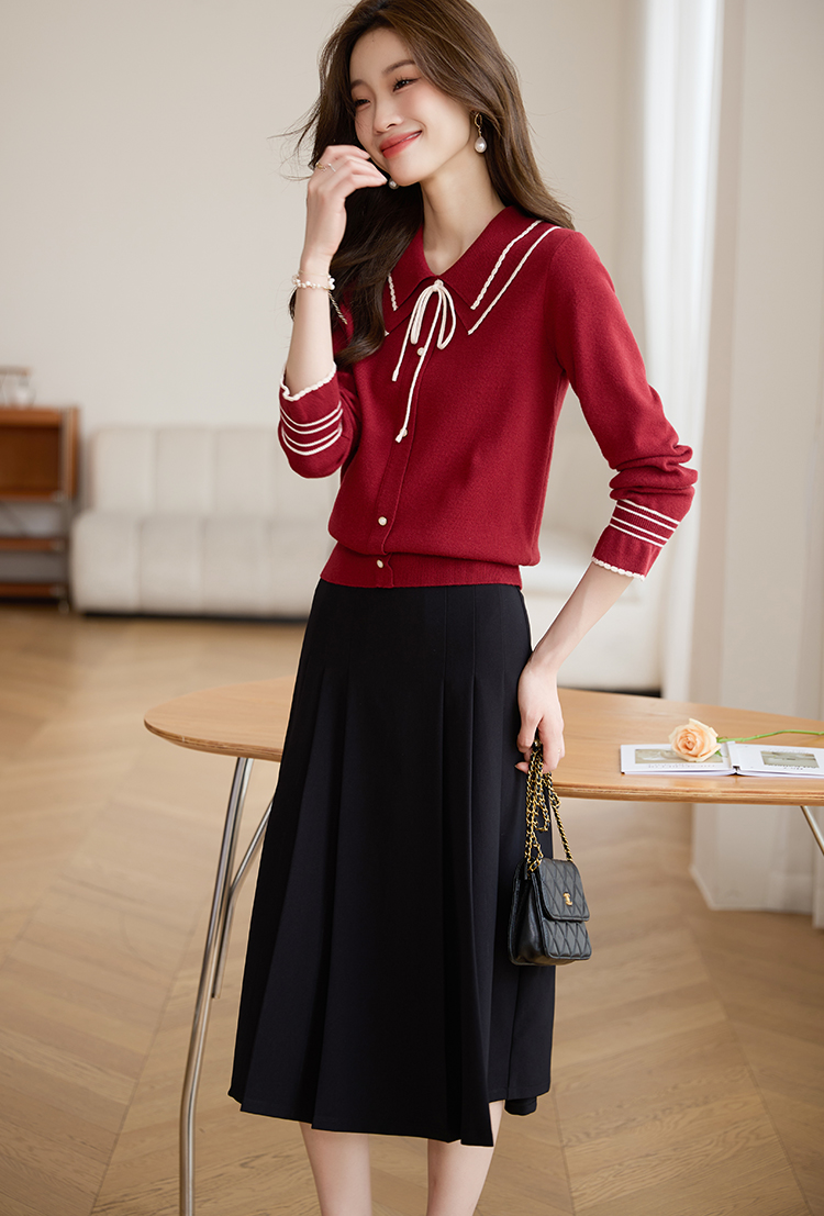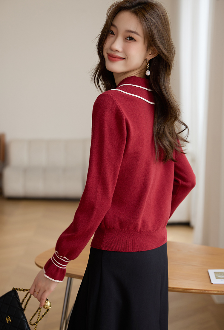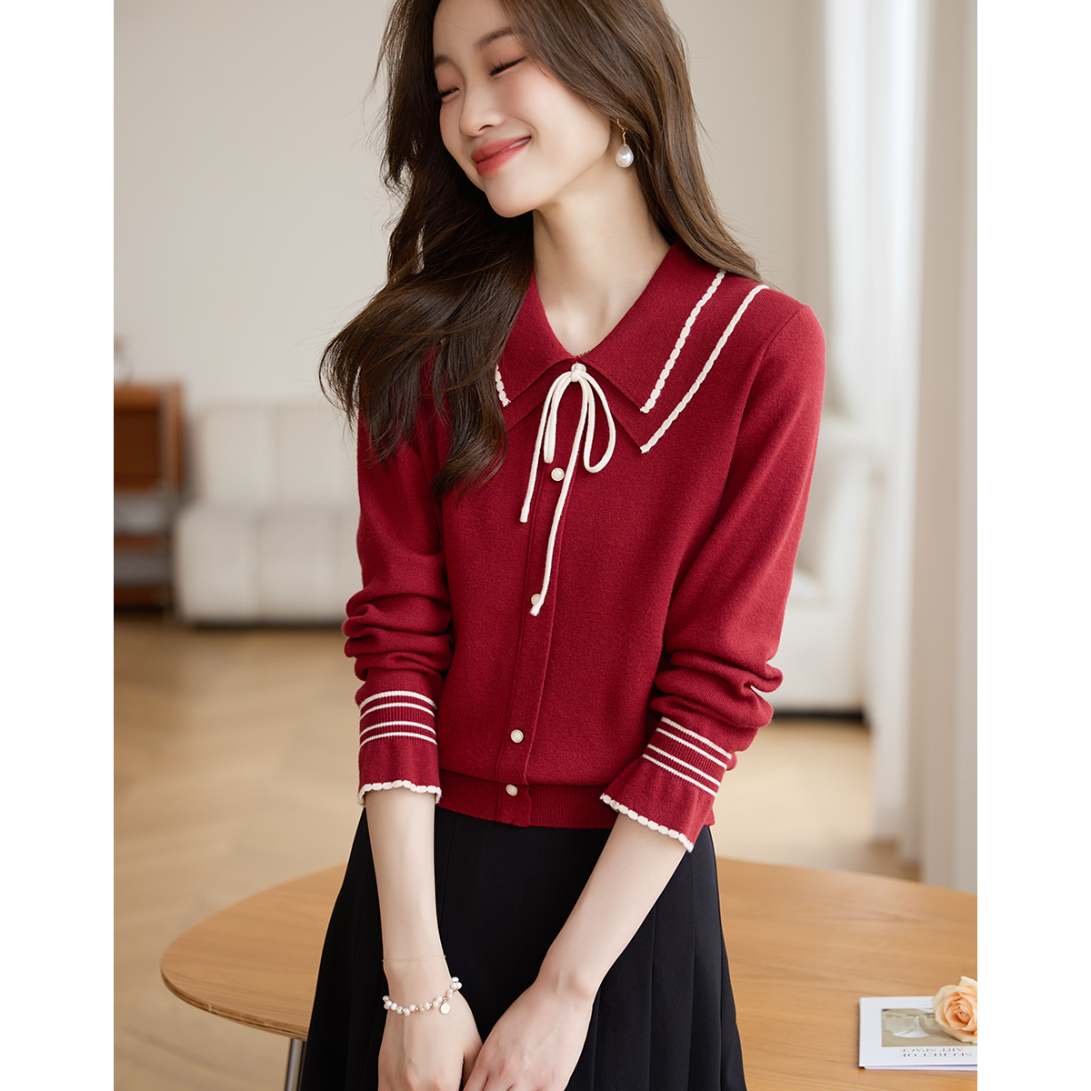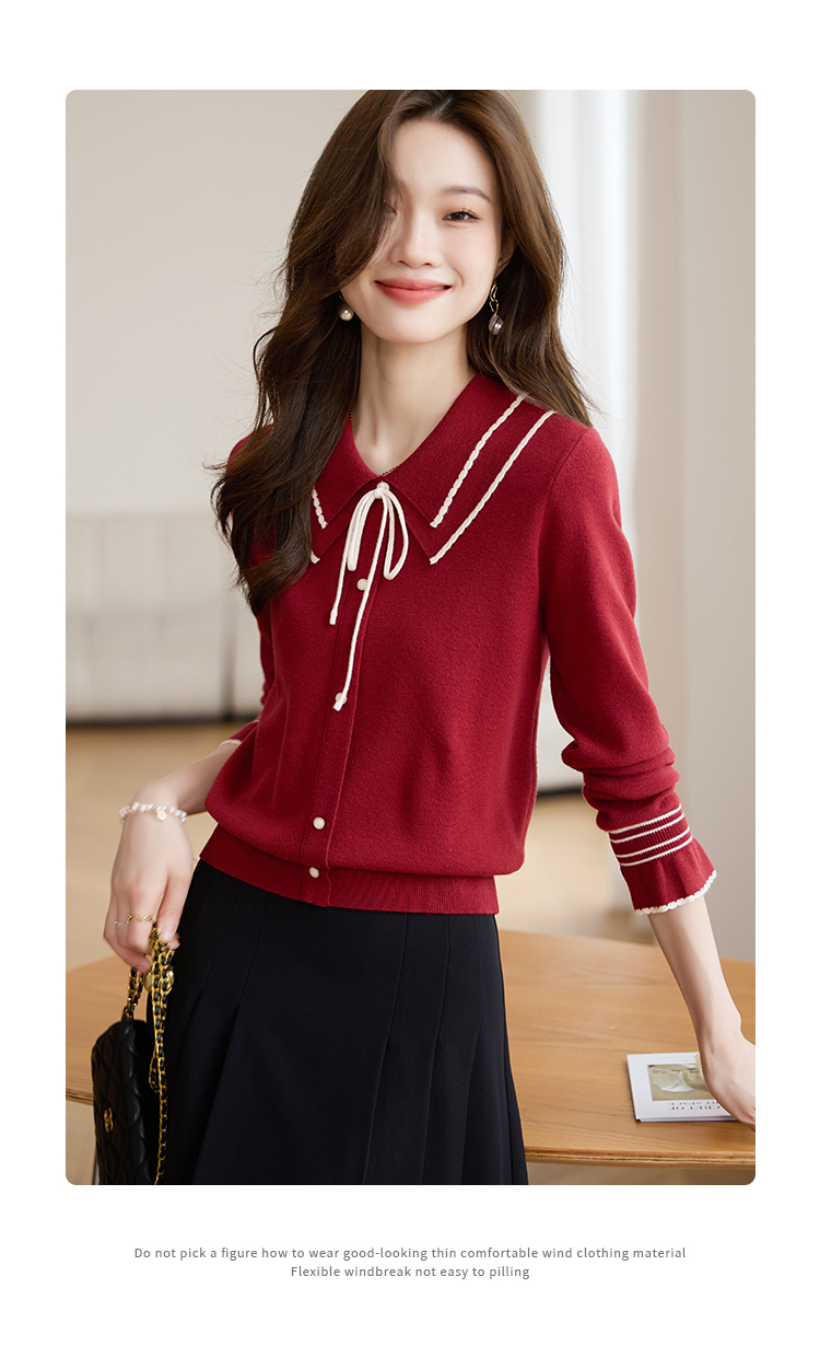 【专属特惠】熙世界2025秋季新款优雅气质撞色飘带翻领针织衫女