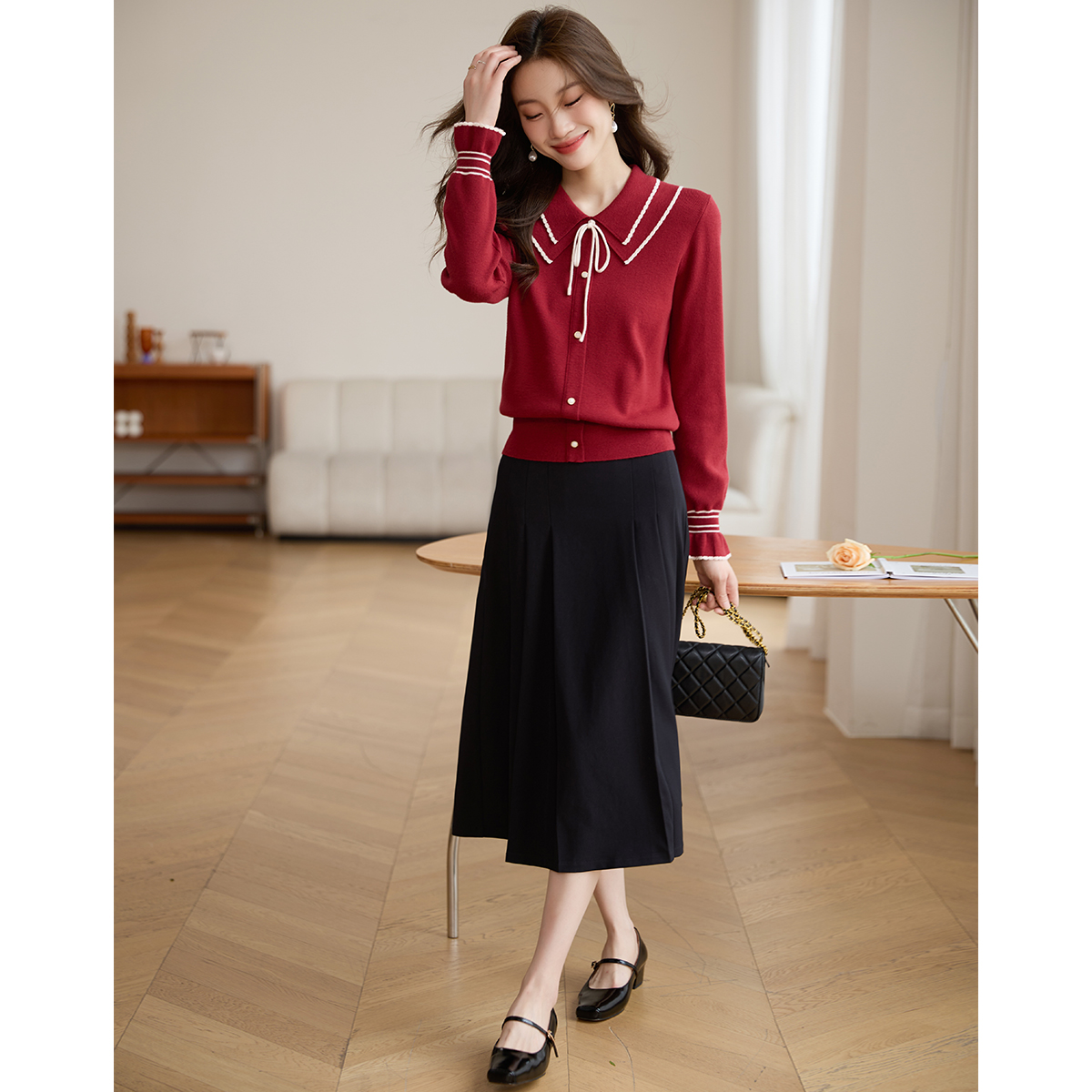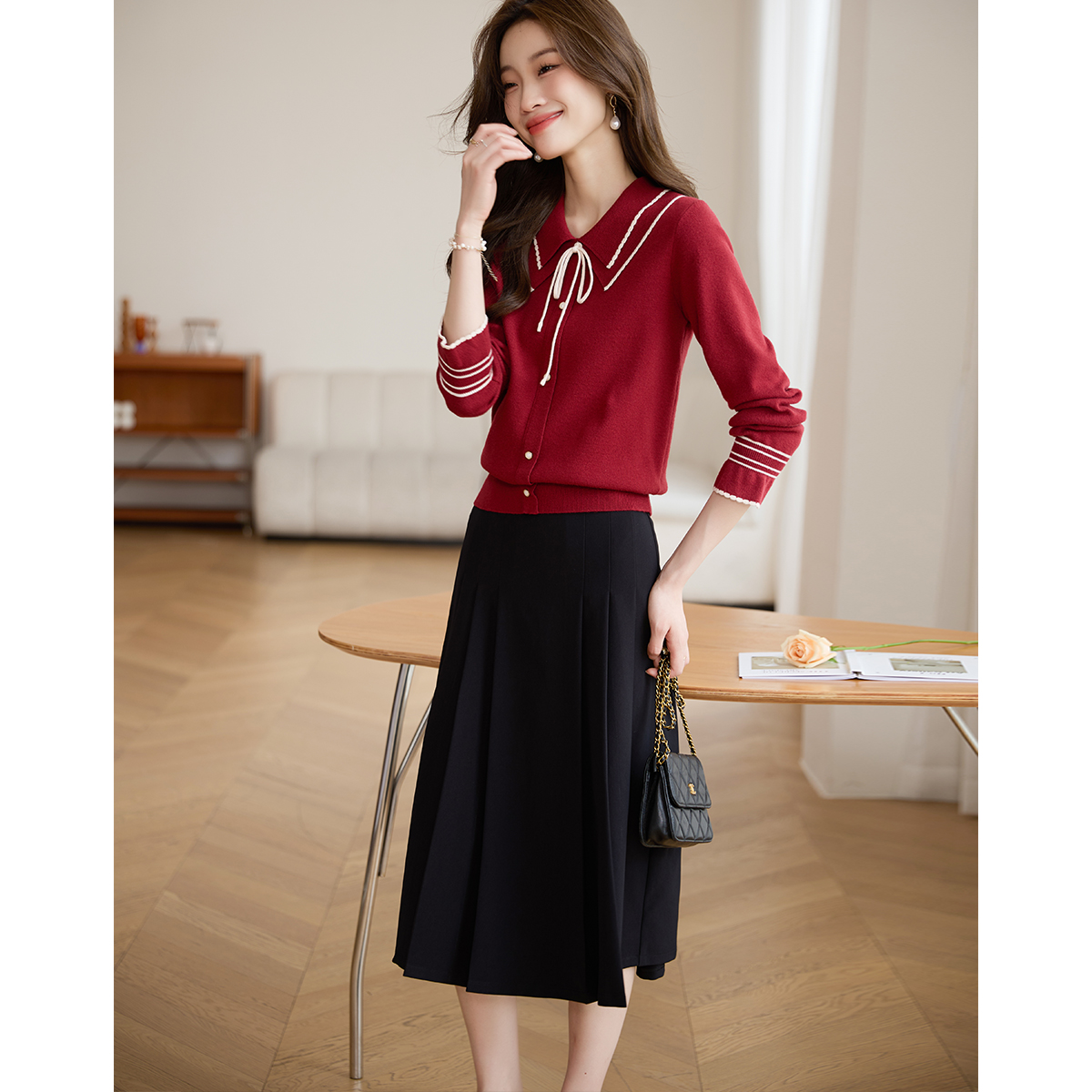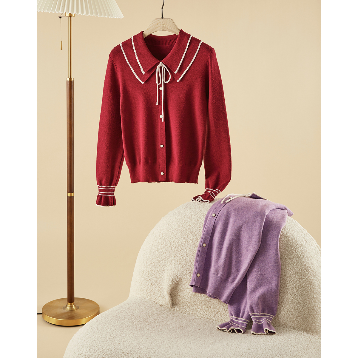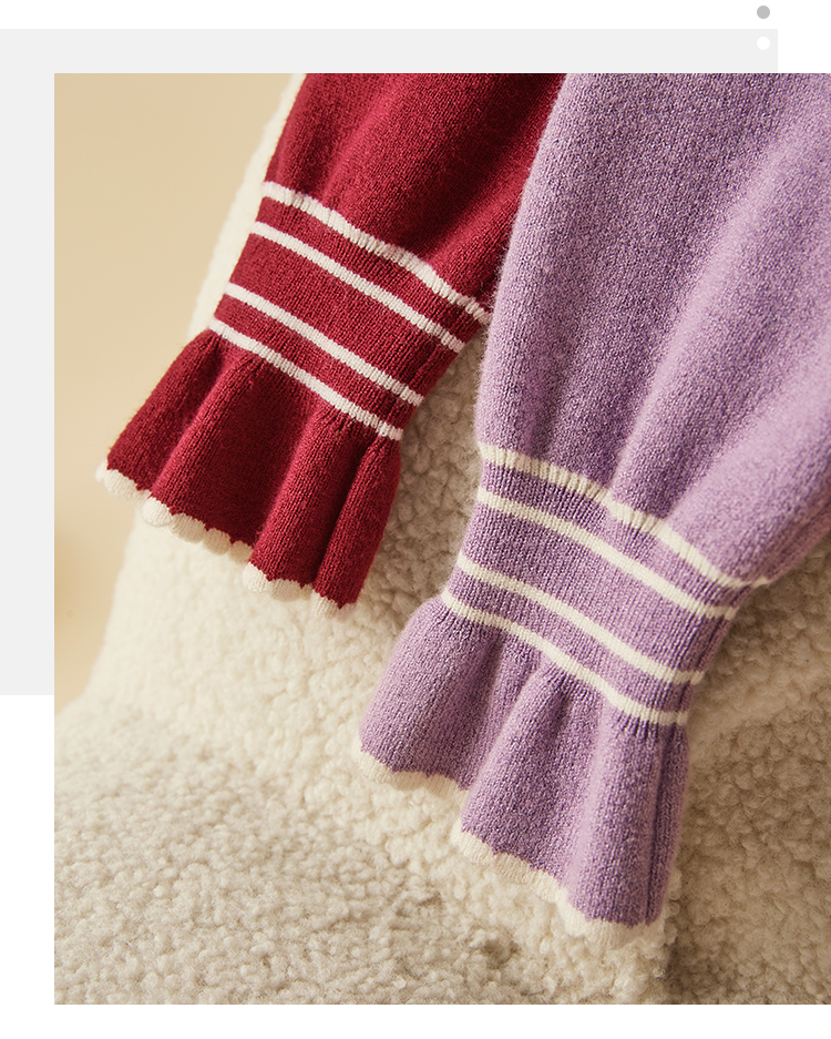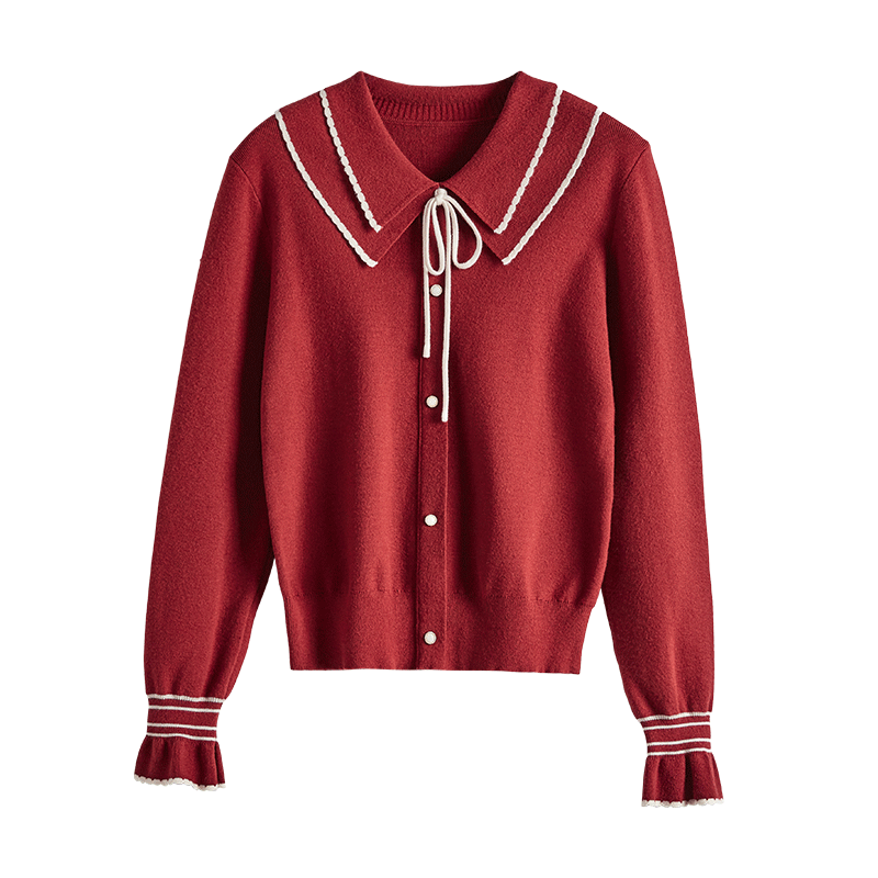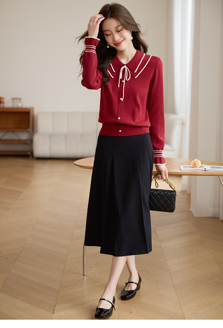 【专属特惠】熙世界2025秋季新款优雅气质撞色飘带翻领针织衫女