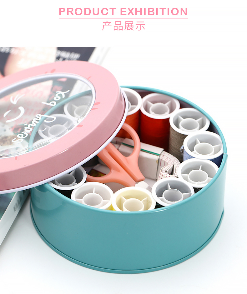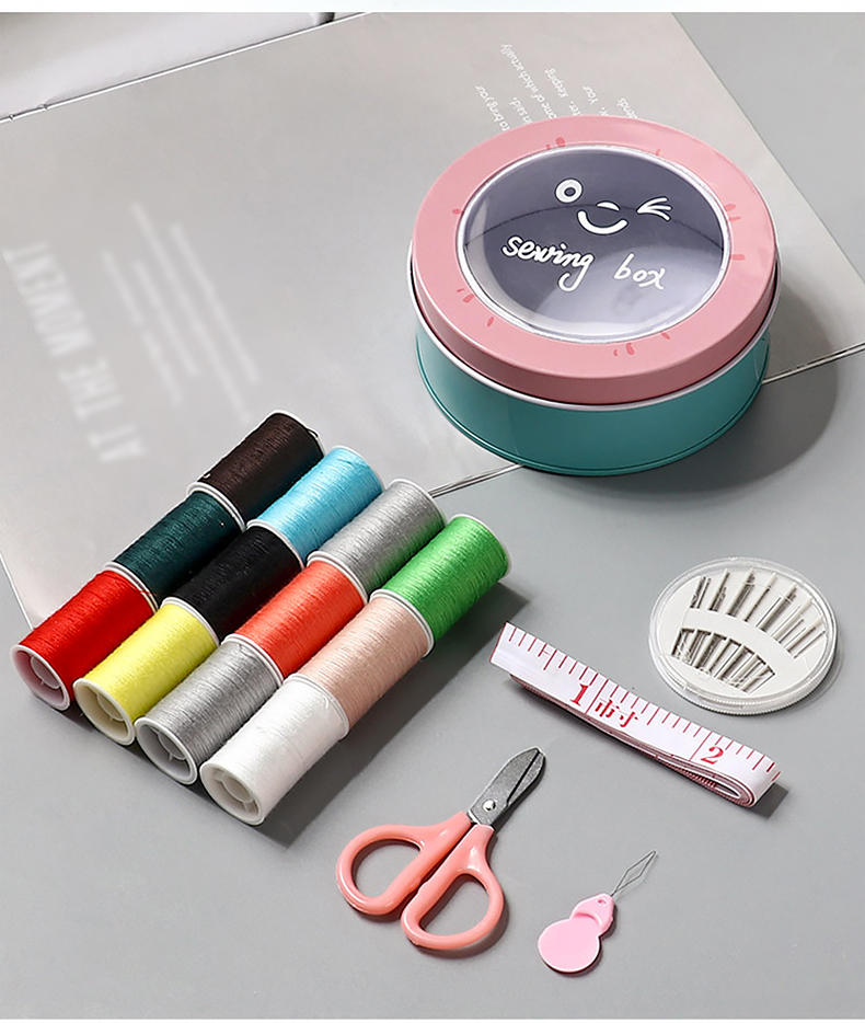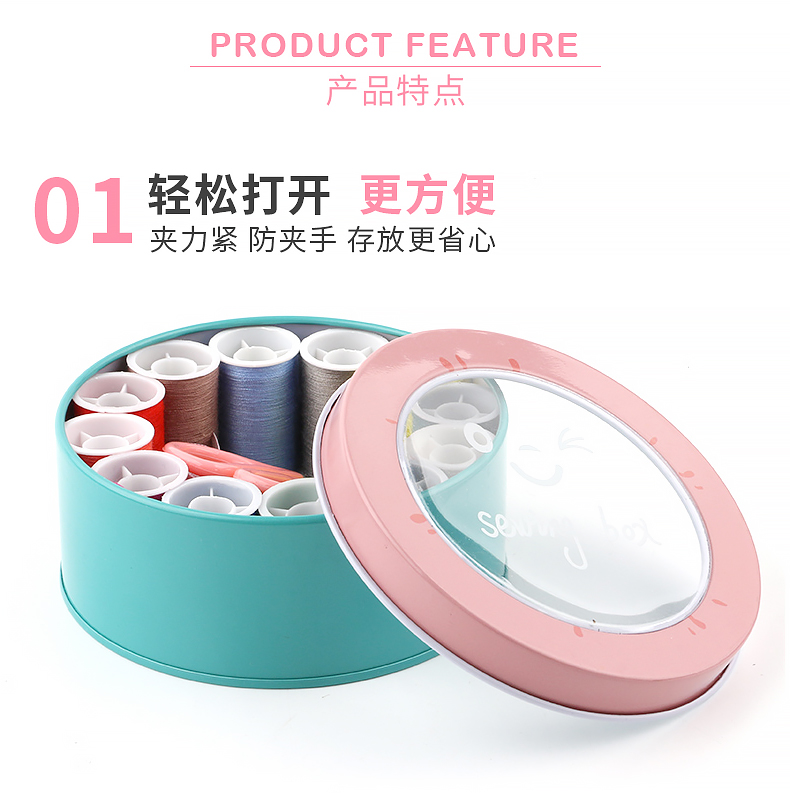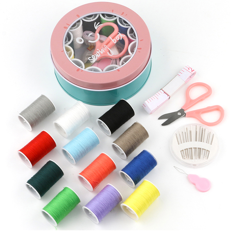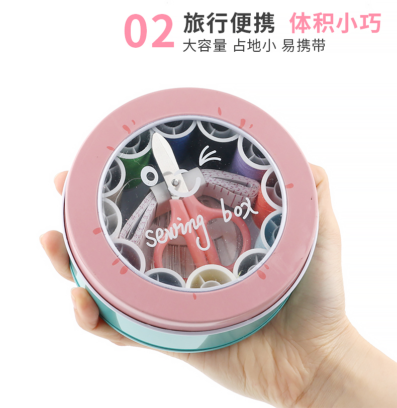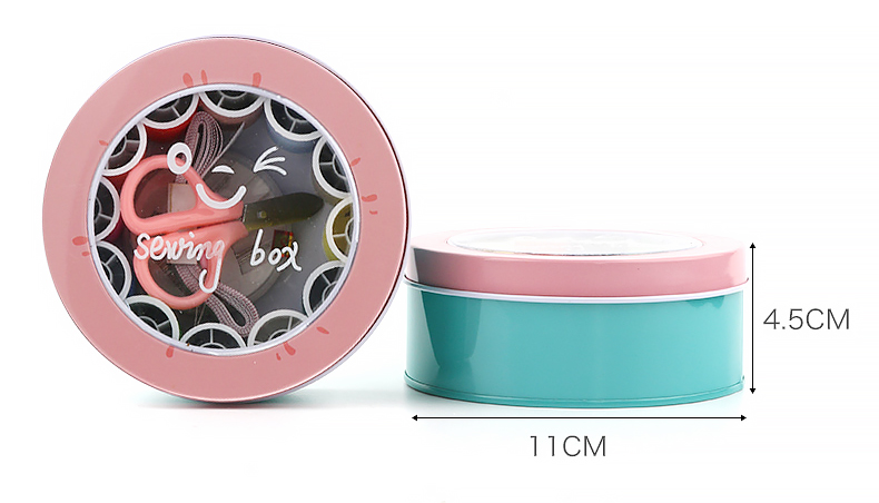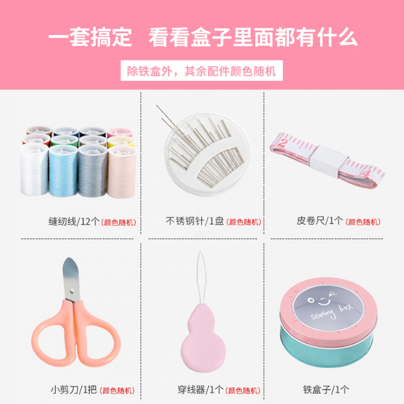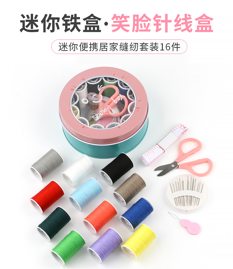 班哲尼 针线盒套装 旅游用品多用途旅行便携缝纫缝补工具套装收纳包圆形开窗缤纷铁盒针线盒 粉色16件套