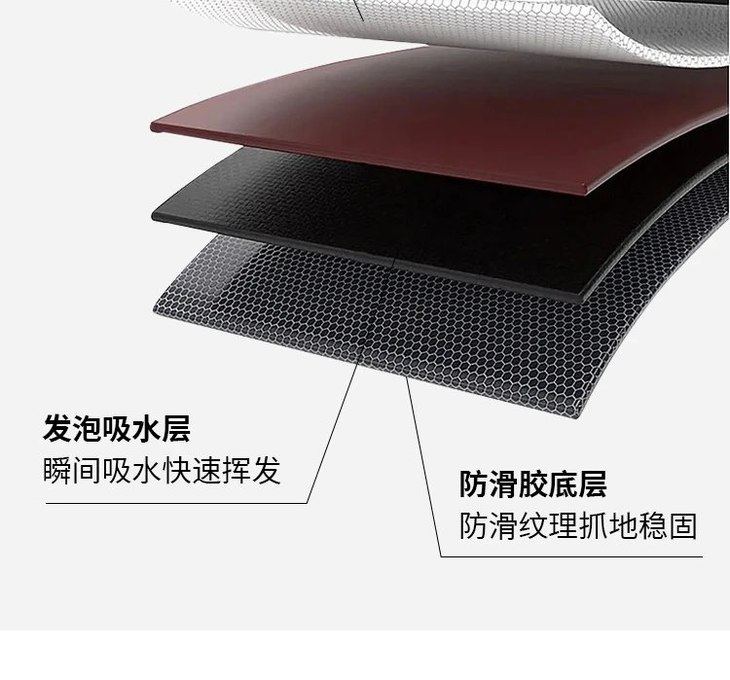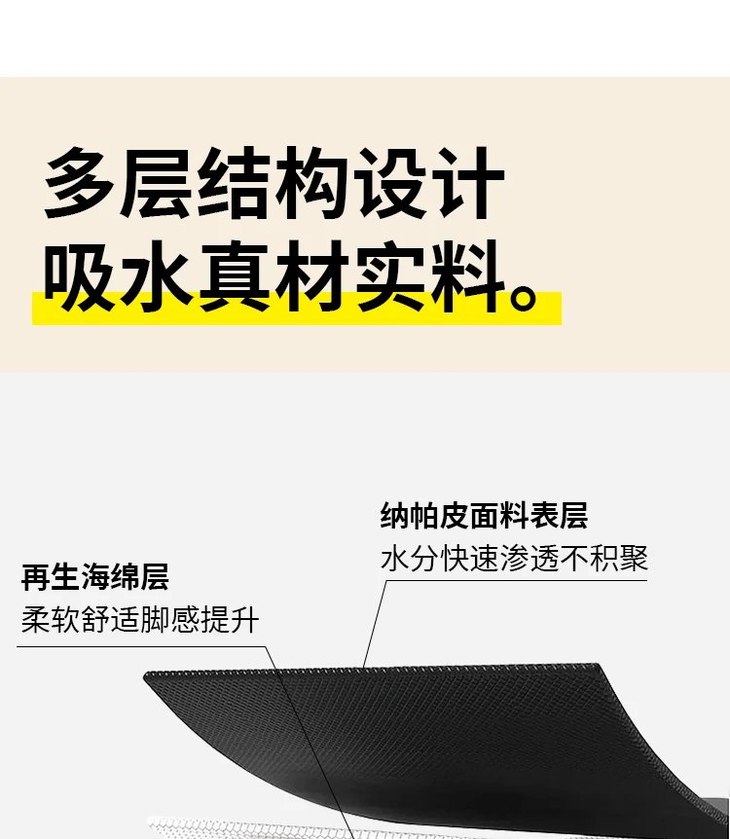 发泡吸水层:瞬间吸水快速挥发, 脚过即干