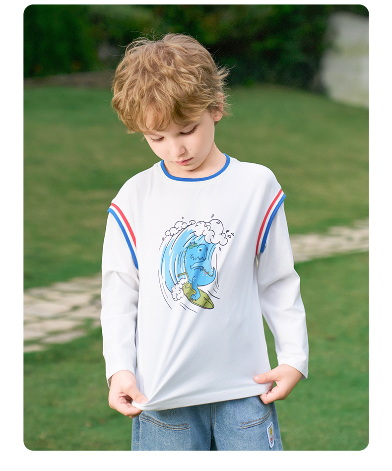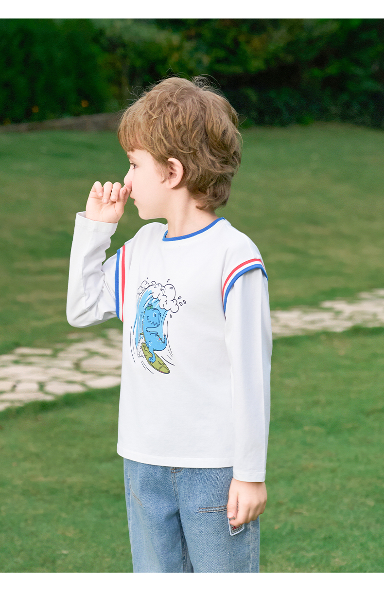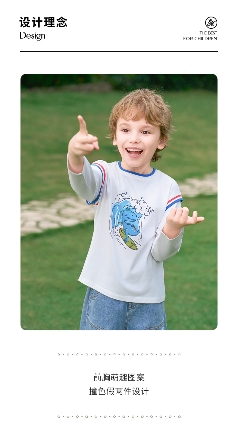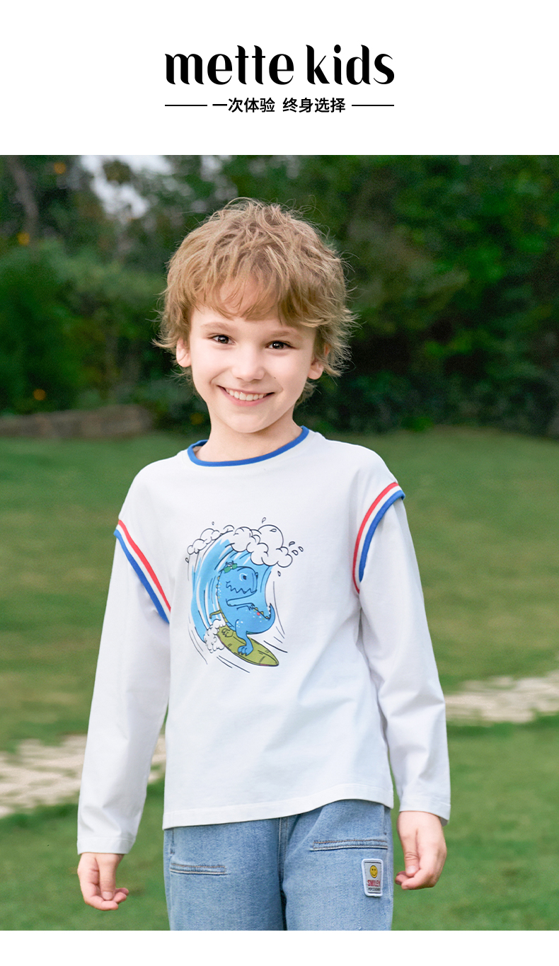 mettekids男童长袖t恤2024新款春秋休闲假两件儿童时尚拼接打底衫
