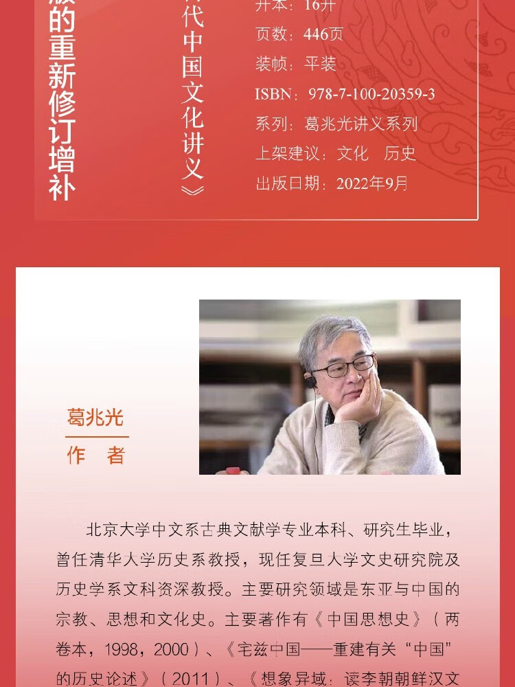该书是对《古代中国文化讲义》的重订增补,葛兆光老师对内容精益求精,做了大量的增补修订,呈现更为丰富和生动的历史、文化图景。