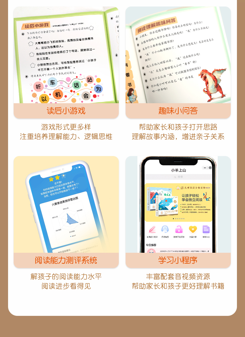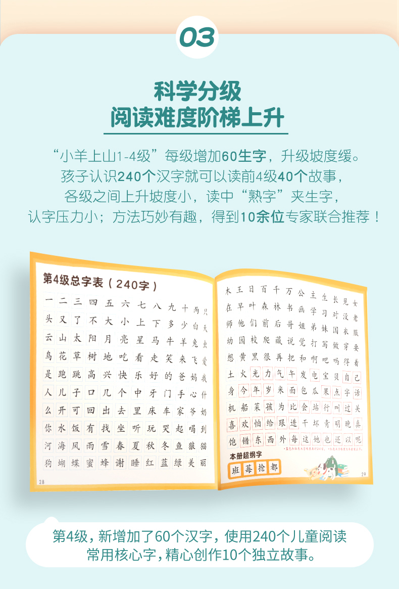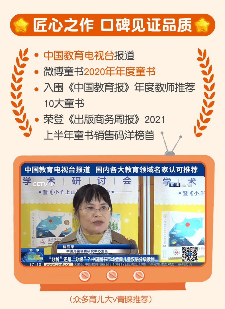 这套《小羊上山儿童汉语分级读物》结合风靡国内外的分级阅读理念,按照儿童自主阅读发展规律,用简单易懂、生动有趣的小故事,为孩子们提供科学有效的分级阅读计划与具体内容,帮助孩子们在识字的同时养成自主阅读的好习惯!