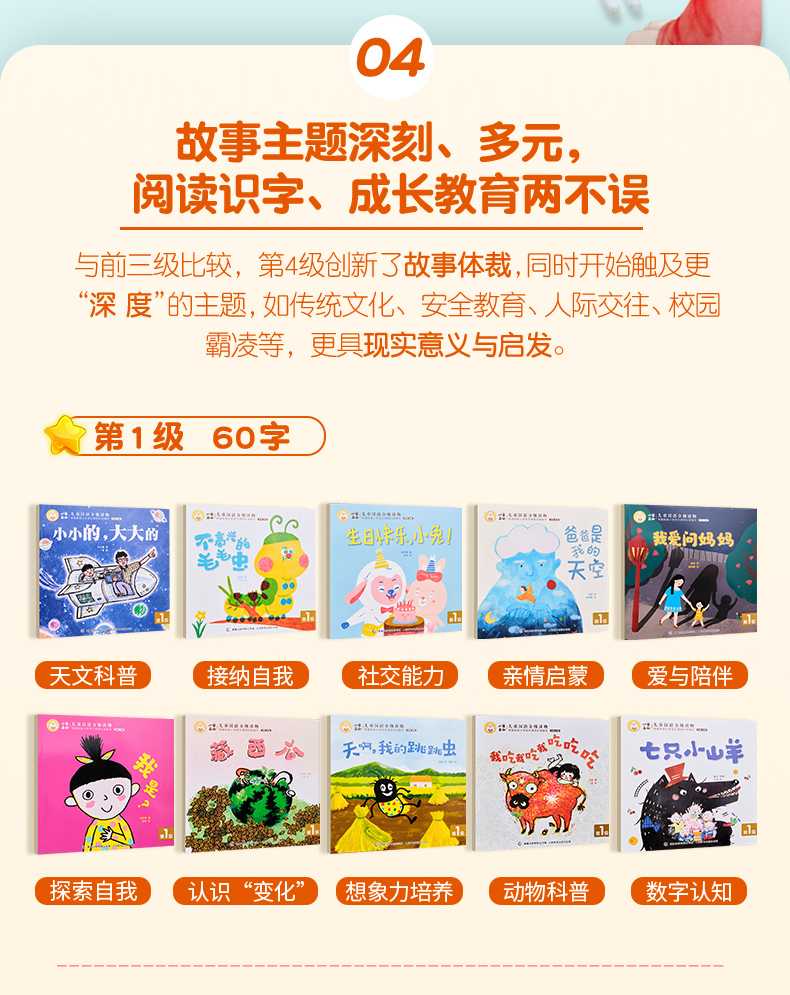 Ø 各册图书使用的词汇都是儿童阅读常用字和核心高频词,与小学语文课本相衔接。