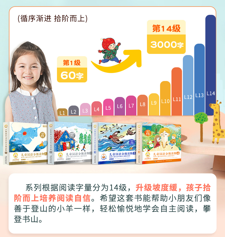 分级阅读是目前比较流行的阅读模式,它的好处是根据儿童发展水平定制阅读。在逐渐递进的阅读过程中,培养儿童的自主阅读能力。我推荐的这套《小羊上山儿童汉语分级读物》具有真正的零起点,分级合理,文学性、艺术性与功能性并举等三大特点,让儿童能轻松上路,从而爱上阅读,养成良好的阅读习惯。
