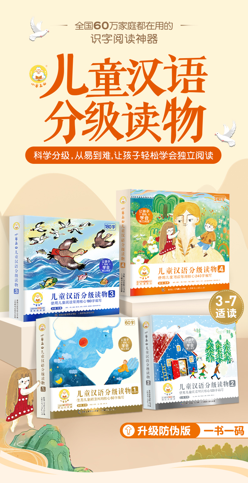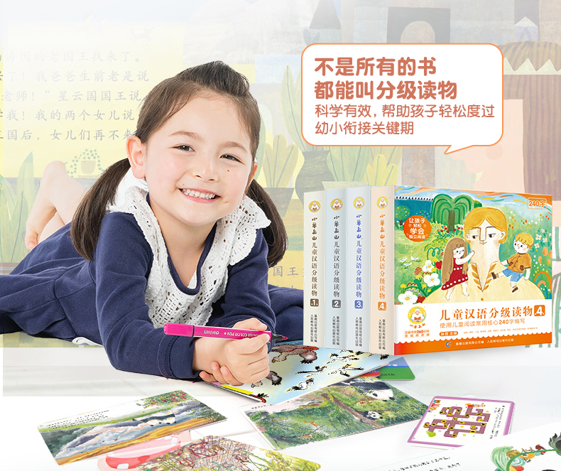 Ø 很强的专业性:真正零起点,孩子认240个汉字就可以读前4级40个故事,认识十几个汉字就可以实现“整体认读”;用生活、学习中的常用汉字来设定各级字表,与小学语文课本相衔接;各级之间上升坡度小,读中“熟字”夹生字,认字压力小,方法巧妙有趣。