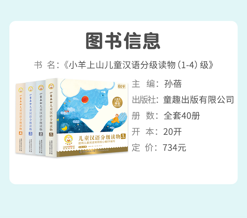《小羊上山儿童汉语分级读物》这套读物成功地实现了让孩子从零识字开始阅读,在饶有趣味的阶梯阅读中扩展孩子的文字量。使用这套读物,您会发现孩子自主阅读的历程如此轻松、自然。