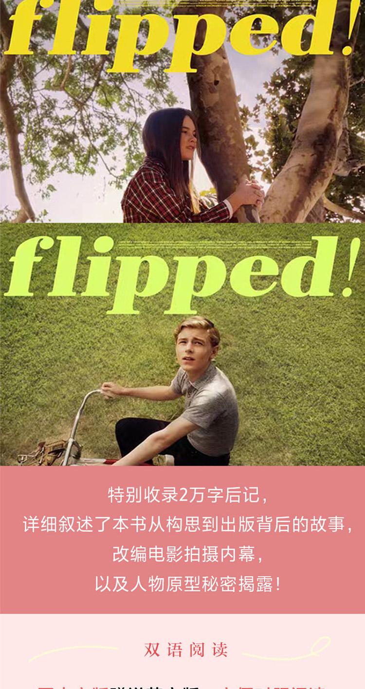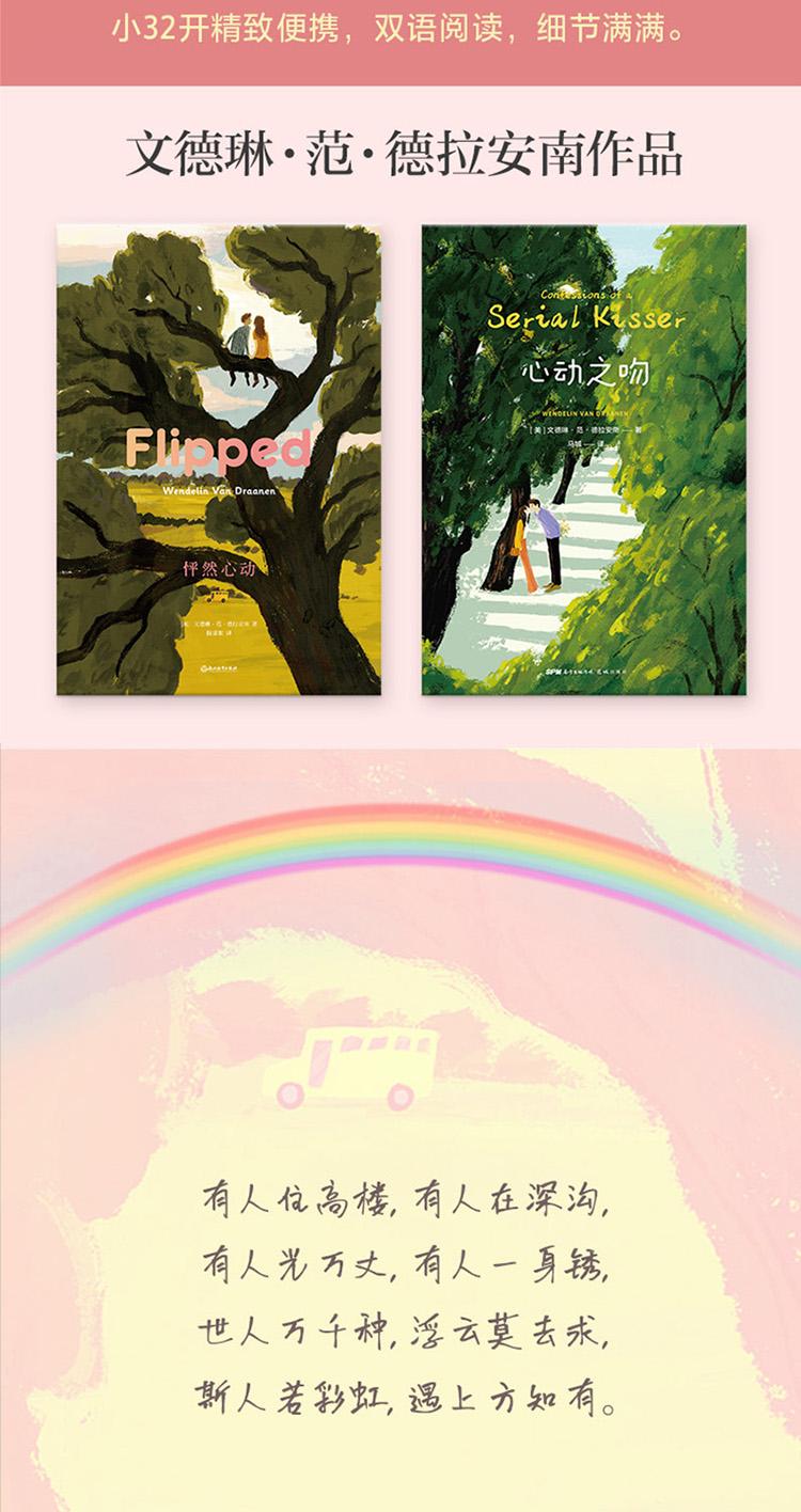 ★全球3000万读者初恋,拿下总计58个文学奖项,盛销20年不衰,中文版豆瓣9.2分 。★改编电影位列豆瓣电影总榜TOP24,150万人打出9.1分高分。让王俊凯、肖战、龚俊、杨幂、罗晋、翟潇闻、陈柏霖、汪卓成韩寒、张皓宸、卢思浩陈柏霖怦然心动的初恋故事。★特别收录2万字后记,详细叙述了本书从构思到出版背后的故事,改编电影拍摄内幕,以及人物原型秘密揭露!★双语阅读:中英双语两册呈现,英语学习者和爱好者阅读范本,词汇简单,句式常用,对初学者友好,非常适合作为首本英语原版书阅读。买中文版赠送英文版,方便对照阅读。★超插画师卤猫绘制中文版封面,日本樱花艺术特种纸印刷,品质呈现坐在树上看花落和夕阳的美好瞬间。英文版封面采用经典原版装帧,意大利星梦珊瑚纸印刷,梦幻呈现如梦似幻的初恋时光。★特别附赠疗愈插画师舒然绘制7张彩虹插画明信片,祝福阅读此书的读者都能遇到彩虹版绚烂的另一半。