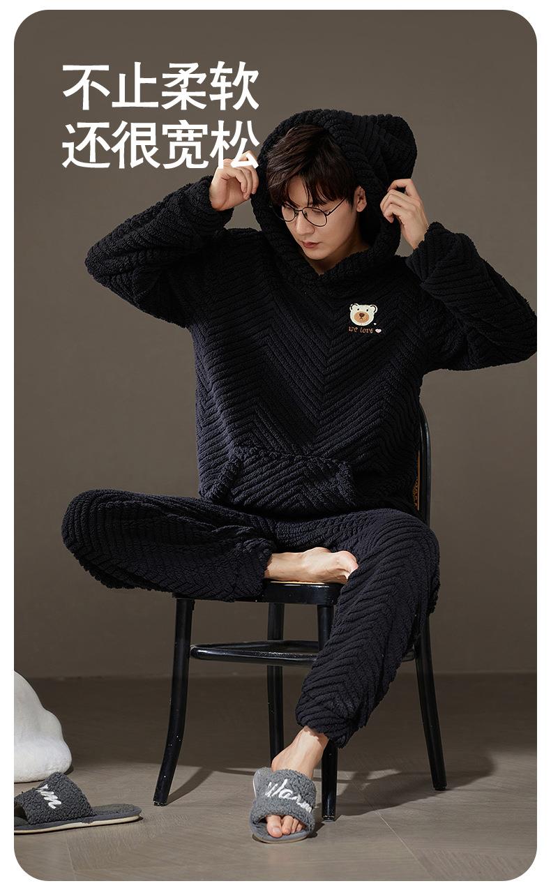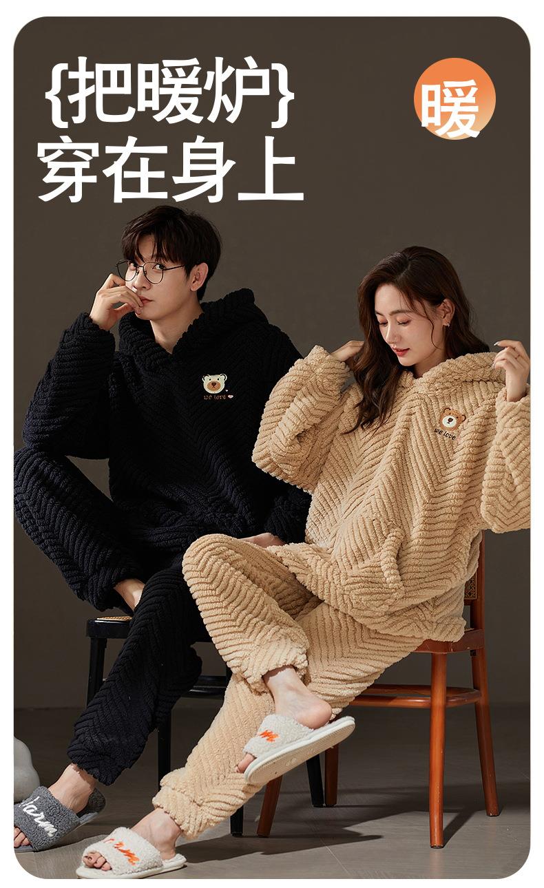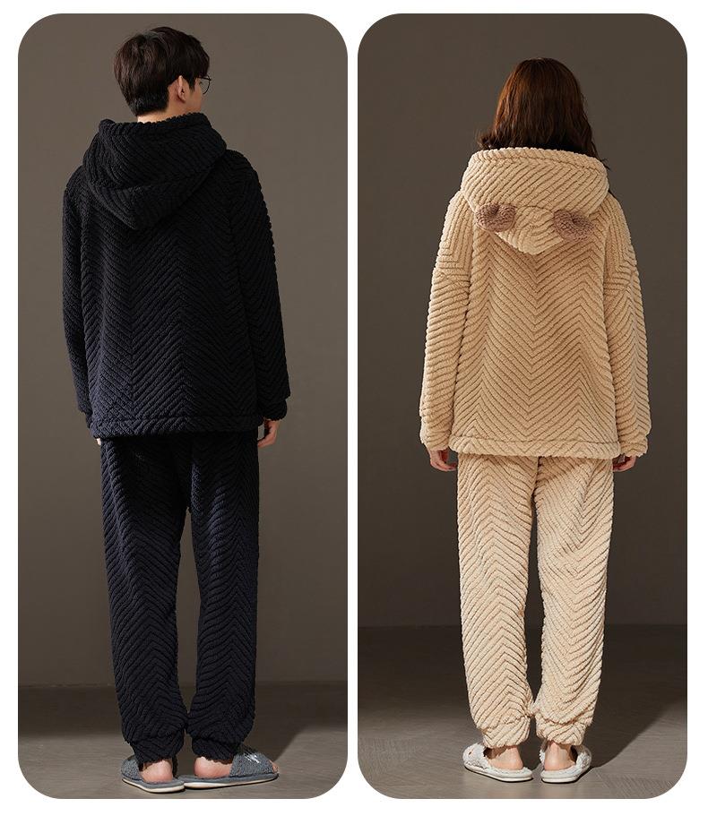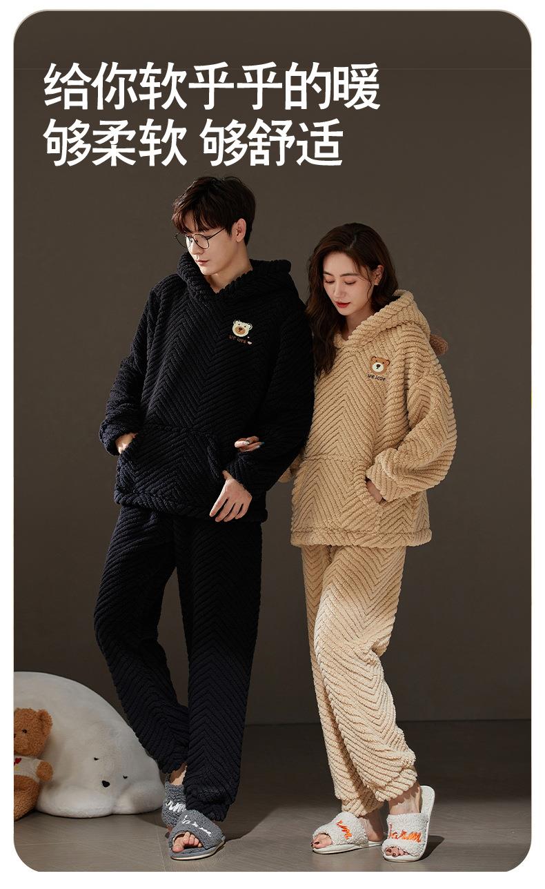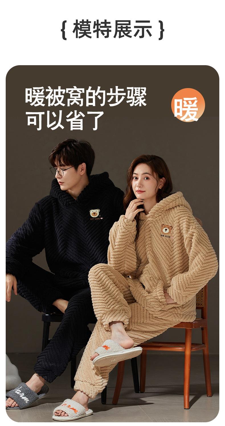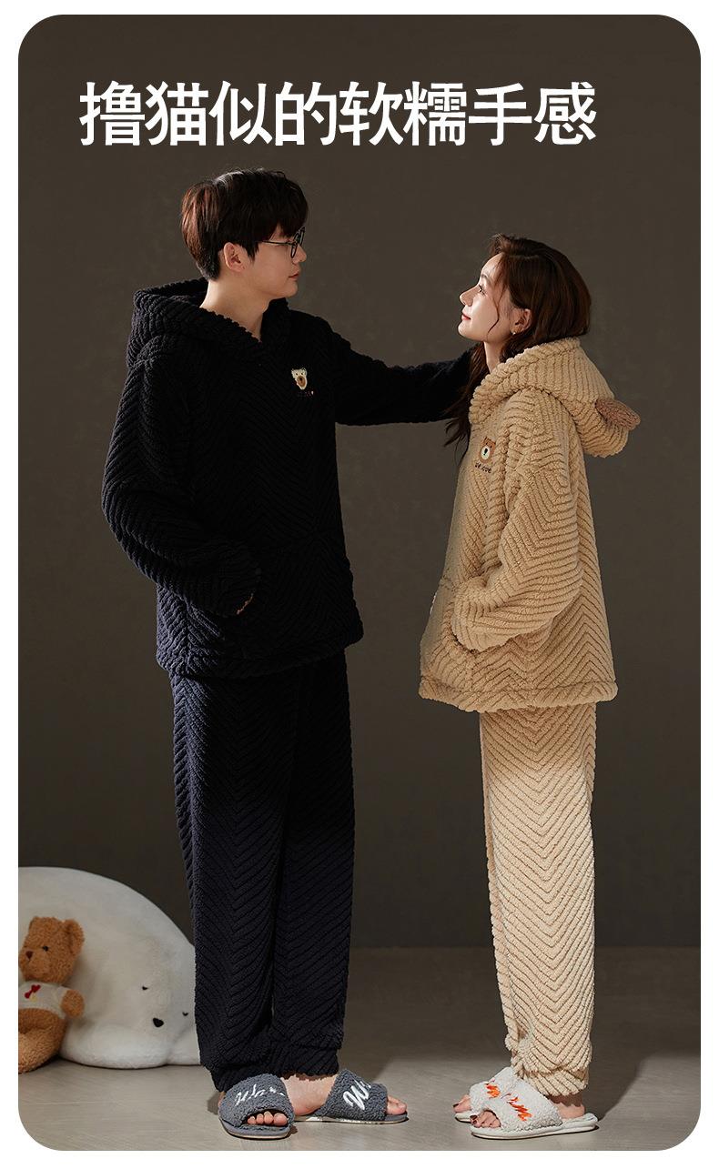 冬季法兰绒情侣睡衣加厚保暖连帽珊瑚绒男士女士休闲可外穿家居服