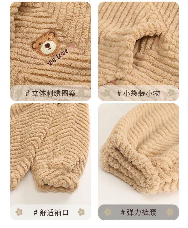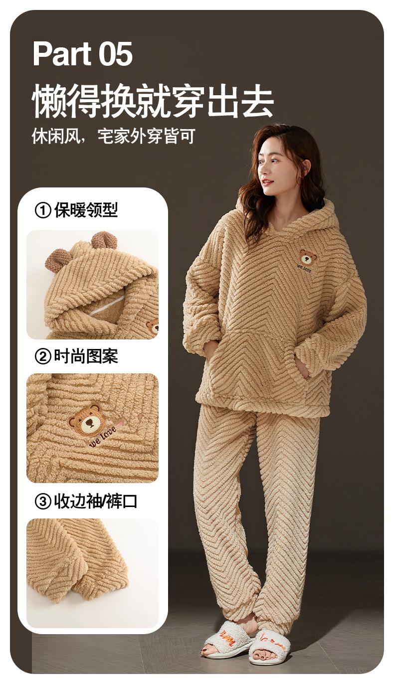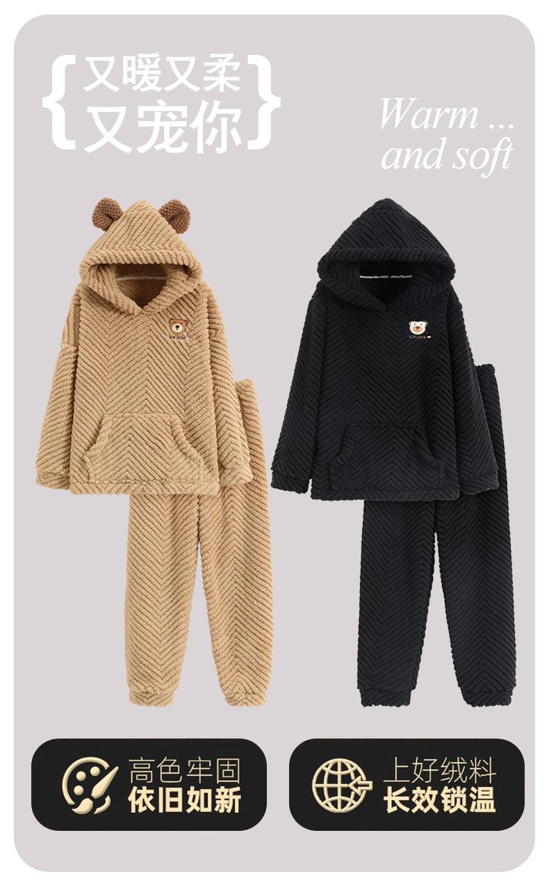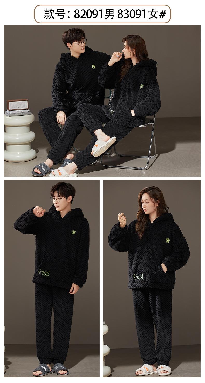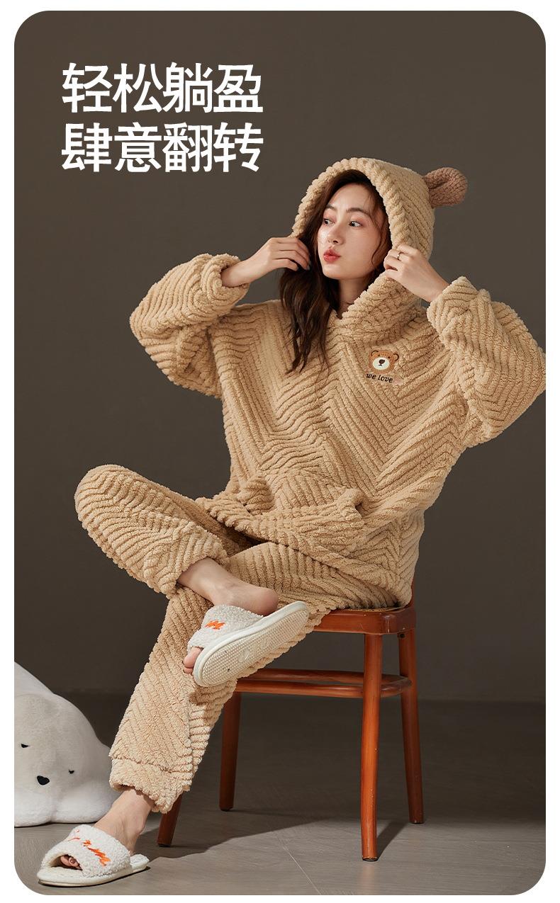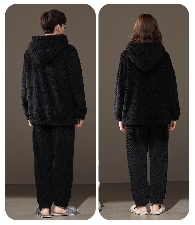 冬季法兰绒情侣睡衣加厚保暖连帽珊瑚绒男士女士休闲可外穿家居服