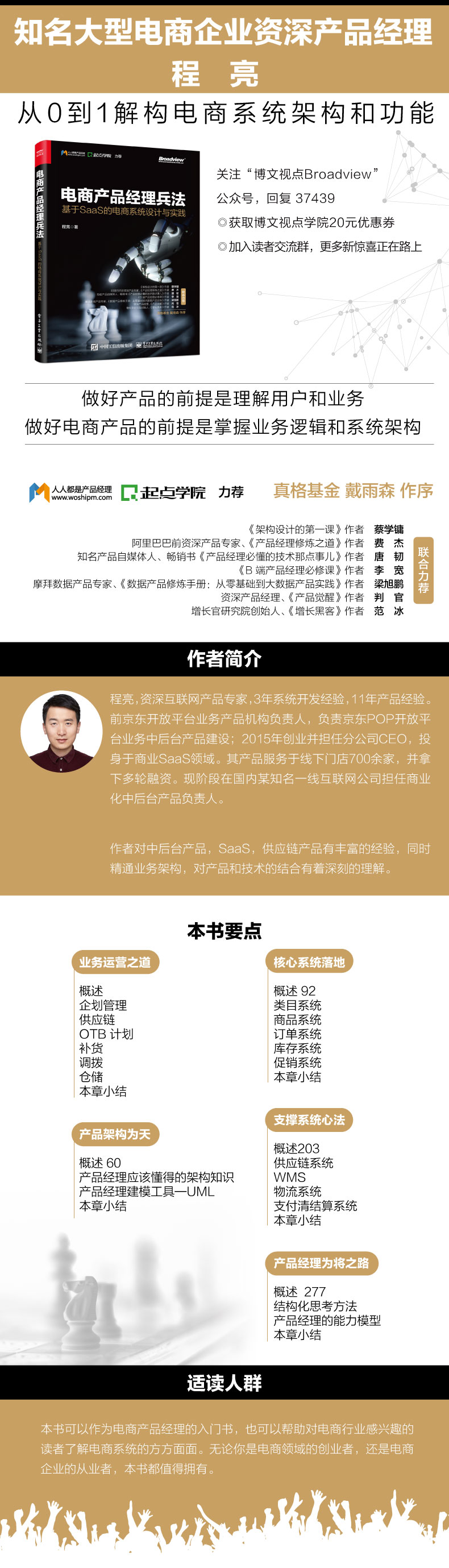 程亮,资深互联网产品专家,3年系统开发经验,11年产品经验。前京东开放平台业务产品机构负责人,负责京东POP开放平台业务中后台产品建设;2015年创业并担任分公司CEO,投身于商业SaaS领域。其产品服务于线下门店700余家,并拿下多轮融资。现阶段在国内某知名一线互联网公司担任商业化中后台产品负责人。作者对中后台产品,SaaS,供应链产品有丰富的经验,同时精通业务架构,对产品和技术的结合有着深刻的理解。