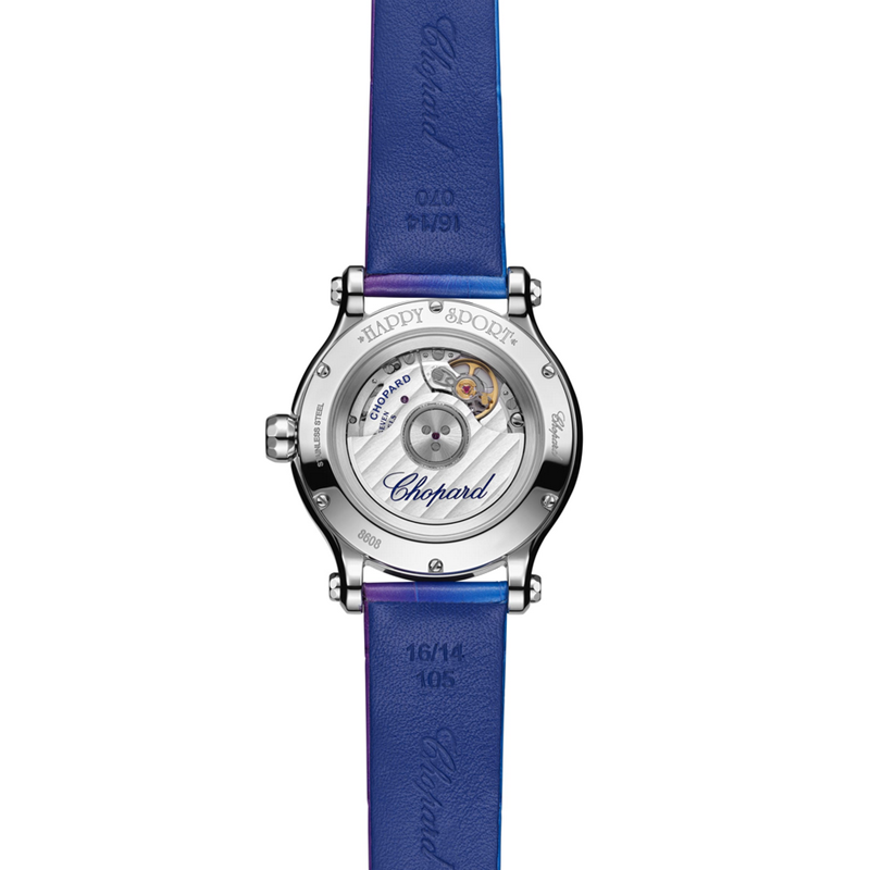 镜面材质 | 蓝宝石水晶玻璃 | 表盘 | 精钢表壳,镶钻表圈 PVD镀层玑镂午夜紫表盘,白色移印,五颗灵动钻石,镀铑罗马数字和时标,镀铑锥形时针和分针,镀铑棒形秒针 精钢刻面表冠,镶嵌1颗蓝色蓝宝石 透底,饰有Happy Sport标志 |