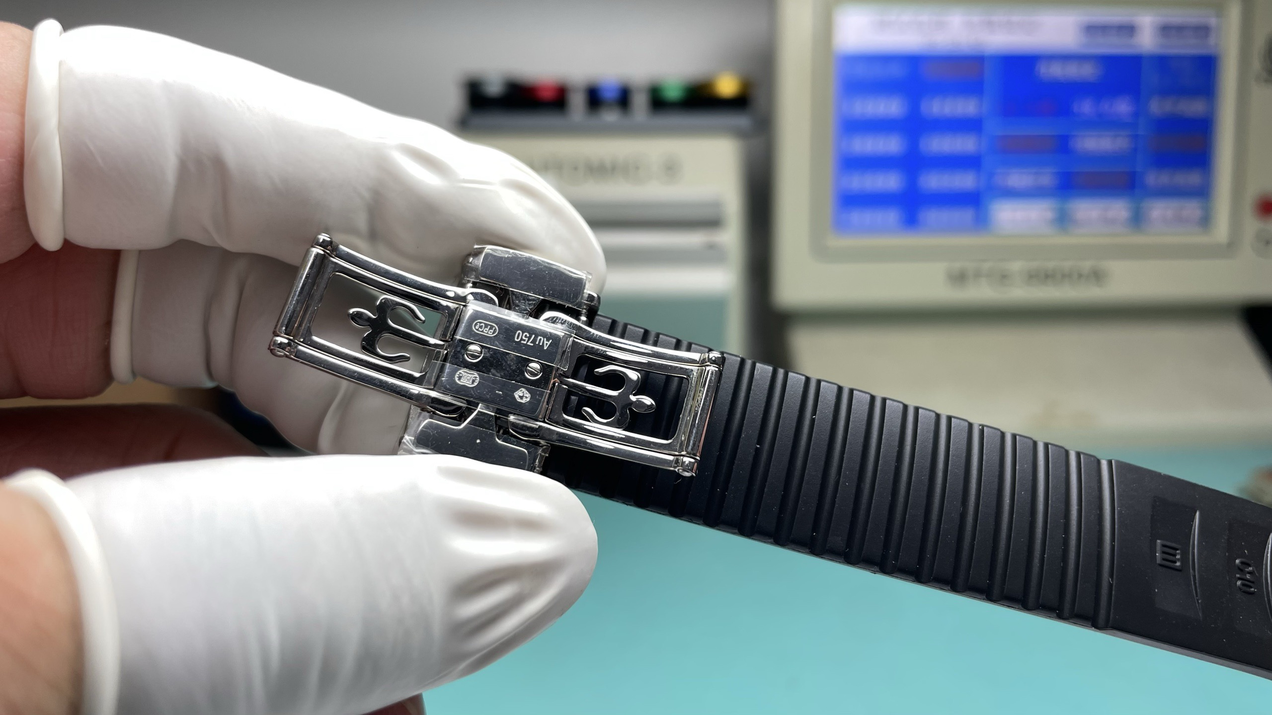 1️⃣ 原装对版氟橡胶带开模,舒适佩戴,全天适配,定制氟橡胶表带柔软亲肤,抗磨耐用性升级;折叠式表扣一键调节,扣子背面打印贵金属清晰标识印记,圣伯纳狗头🐶轮廓内天平⚖️标识.Au750数字.PPC标志,蓝宝石玻璃,商务休闲无缝切换,诠释“优雅随行”的佩戴哲学。