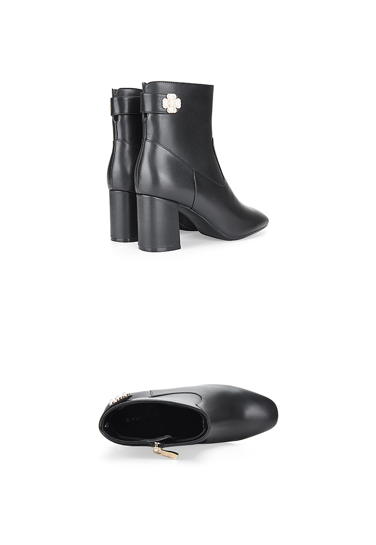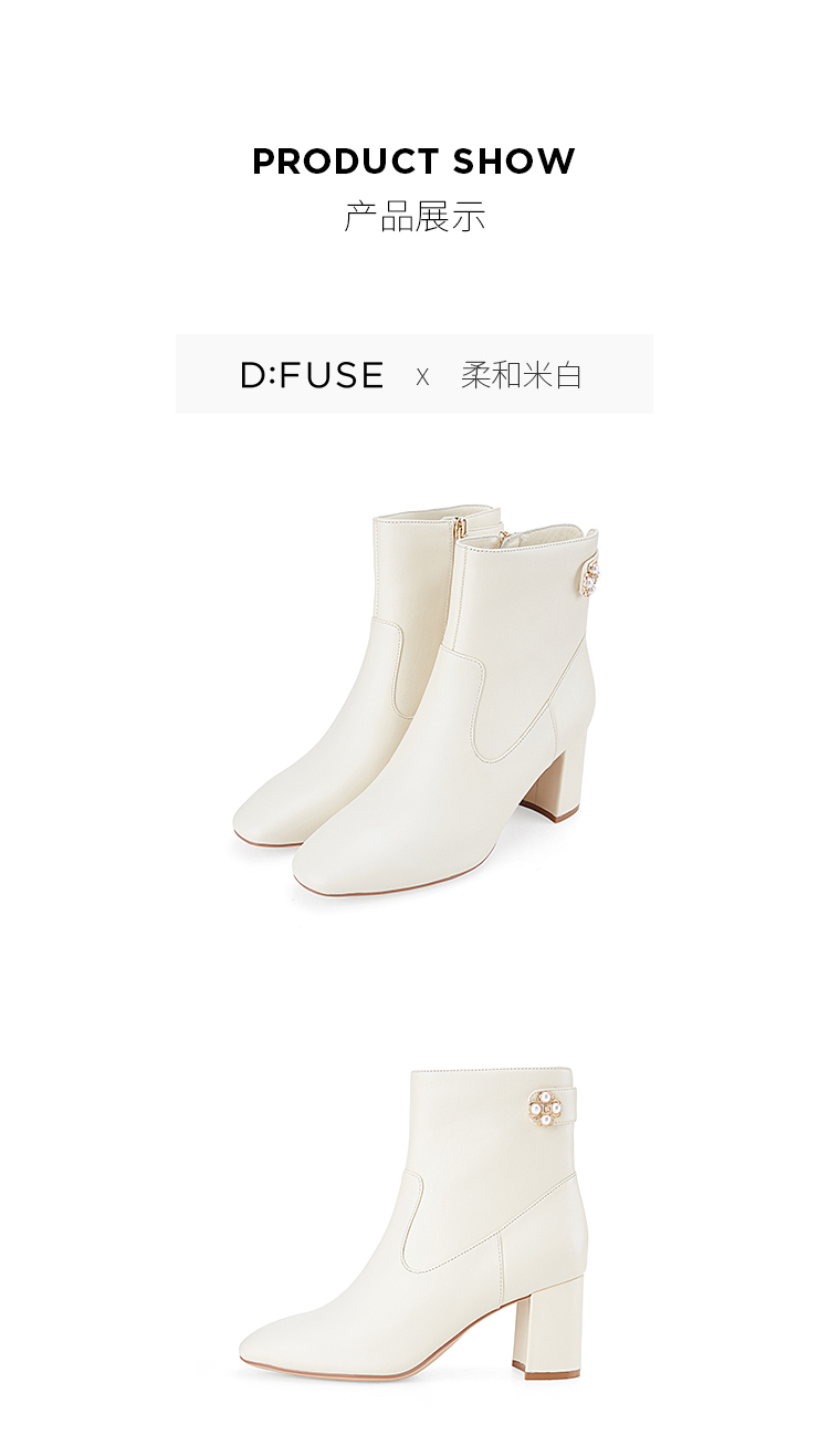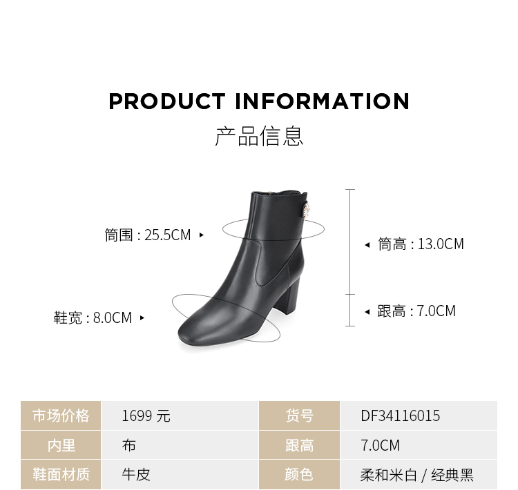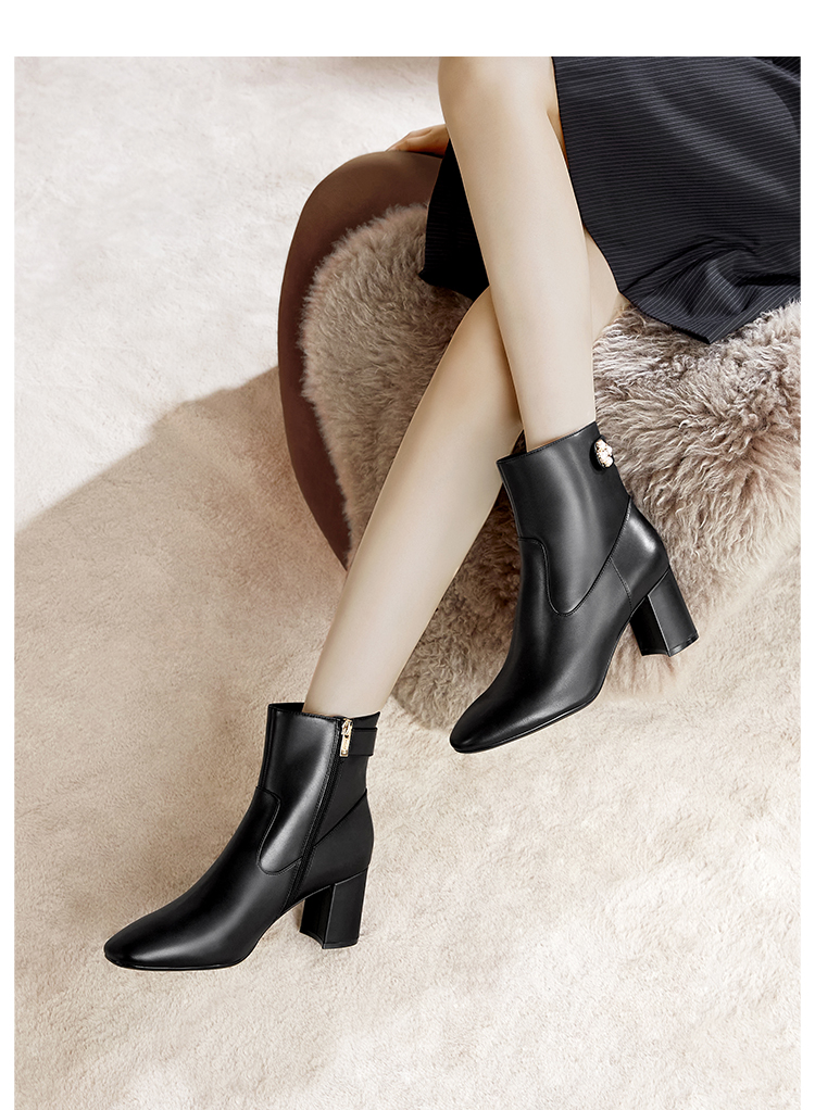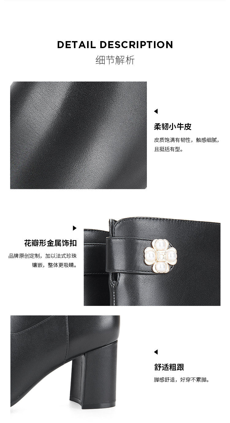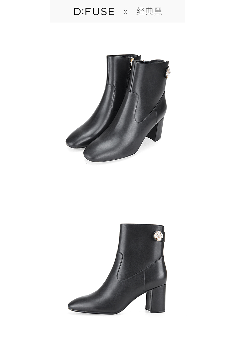Dfuse迪芙斯冬季新款牛皮方头优雅花扣粗跟短靴女DF34116015