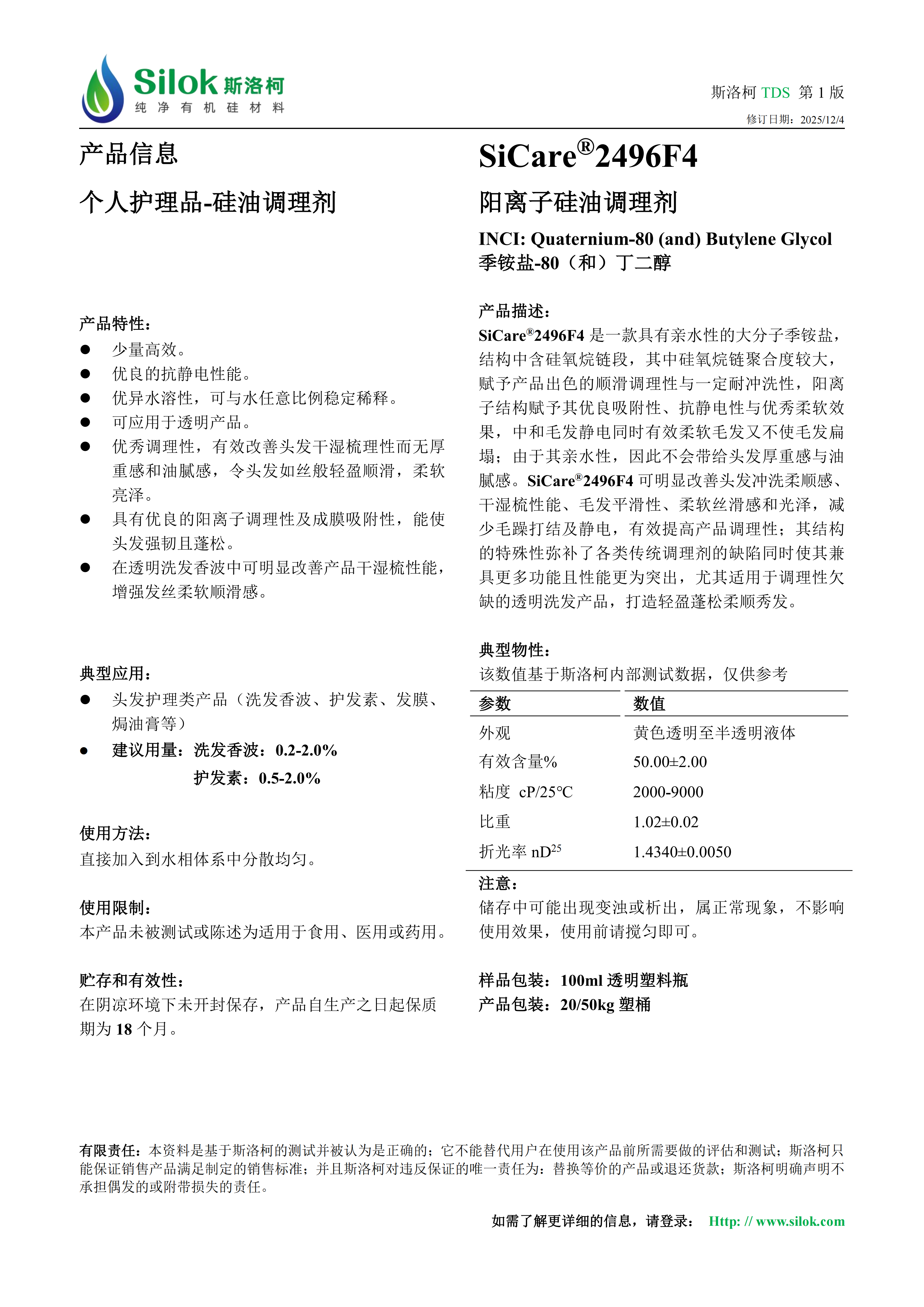 SiCare®2496F4 阳离子硅油调理剂