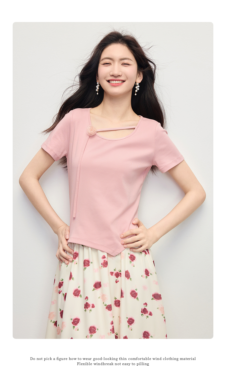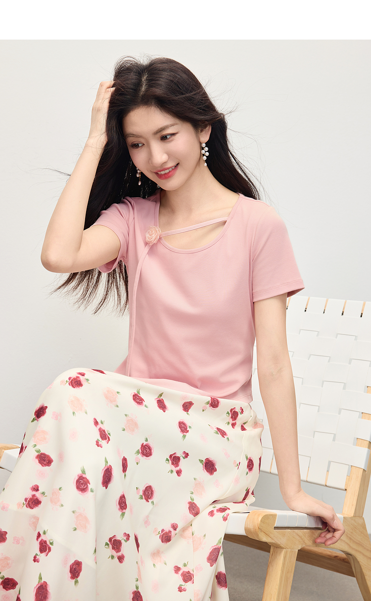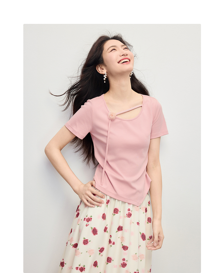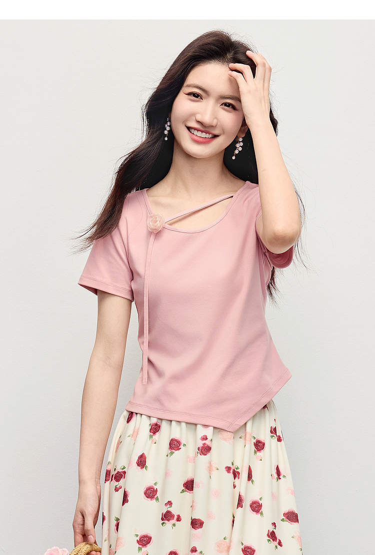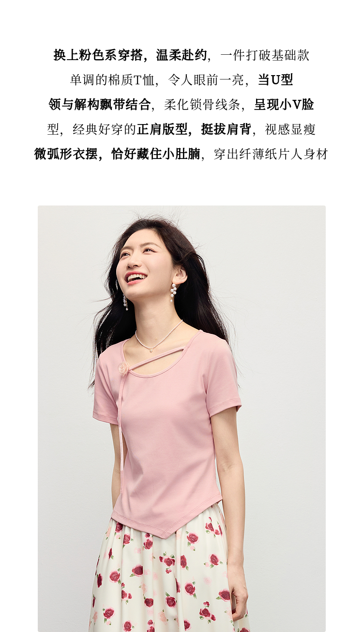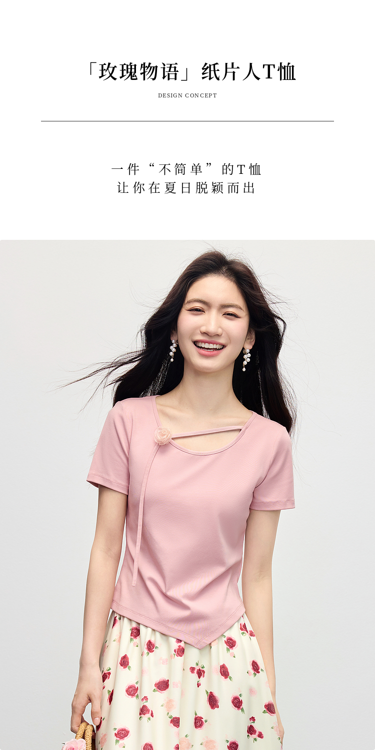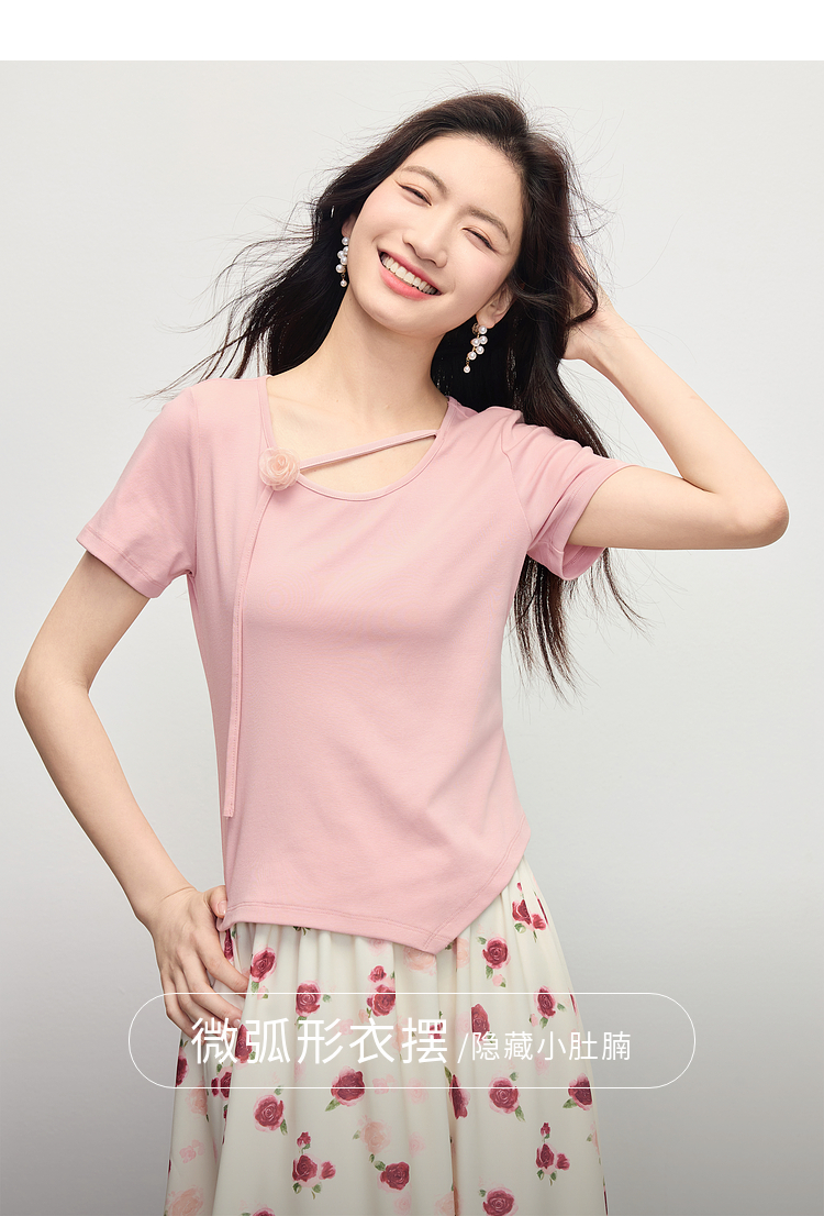 【专属特价】熙世界甜美风玫瑰粉抽绳短袖T恤女设计感正肩显瘦上衣2025夏新款