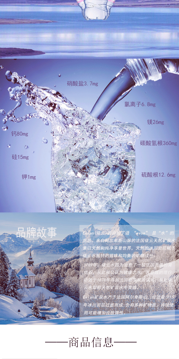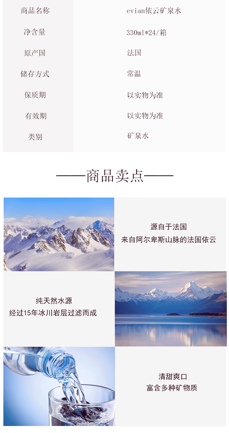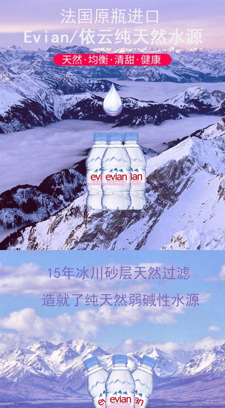 法国进口Evian/依云高端矿泉水天然弱碱性水源24*330ml/箱