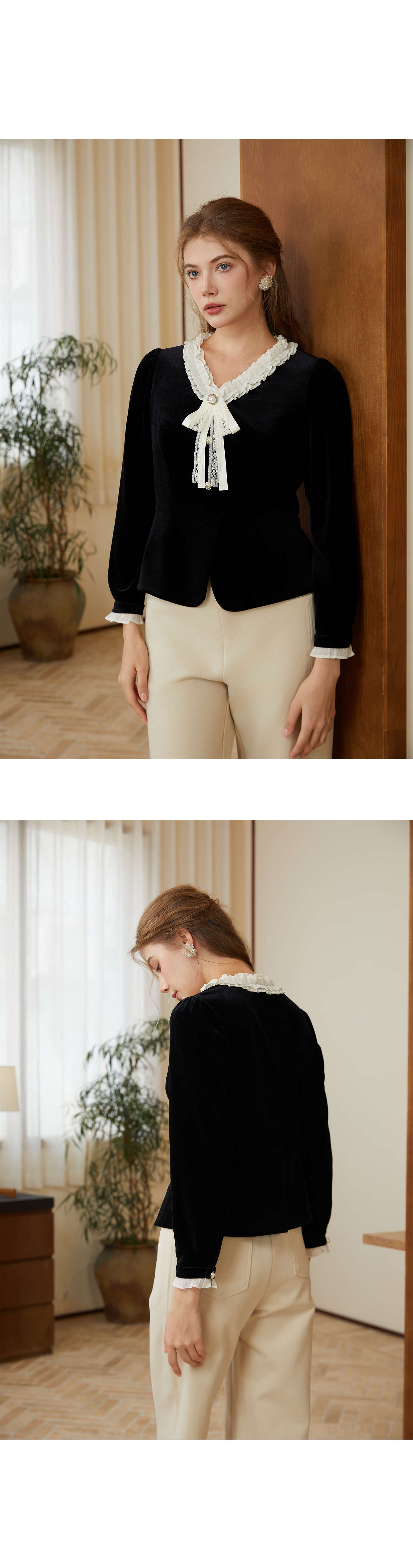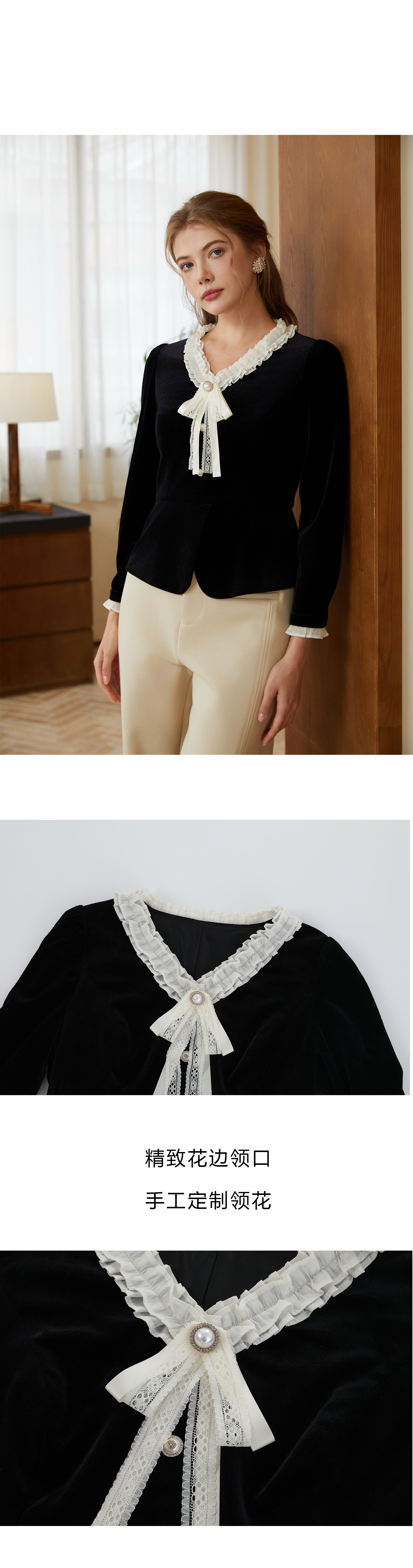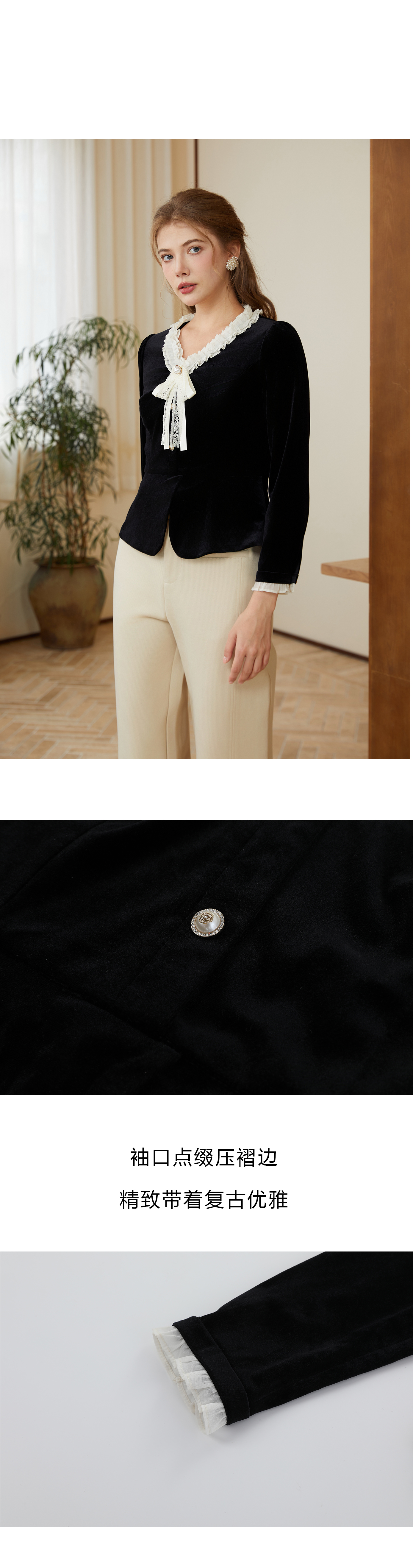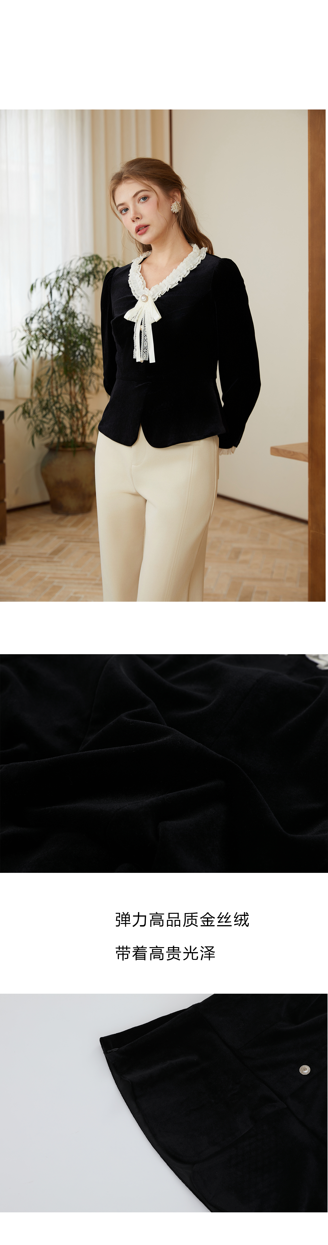 司歌丝绒弹力v领长袖上衣收腰秋冬B921280X
