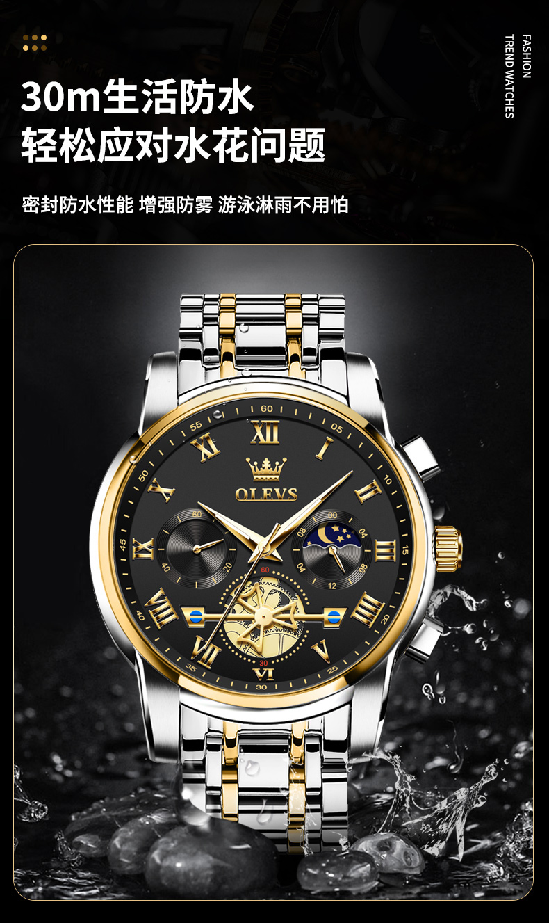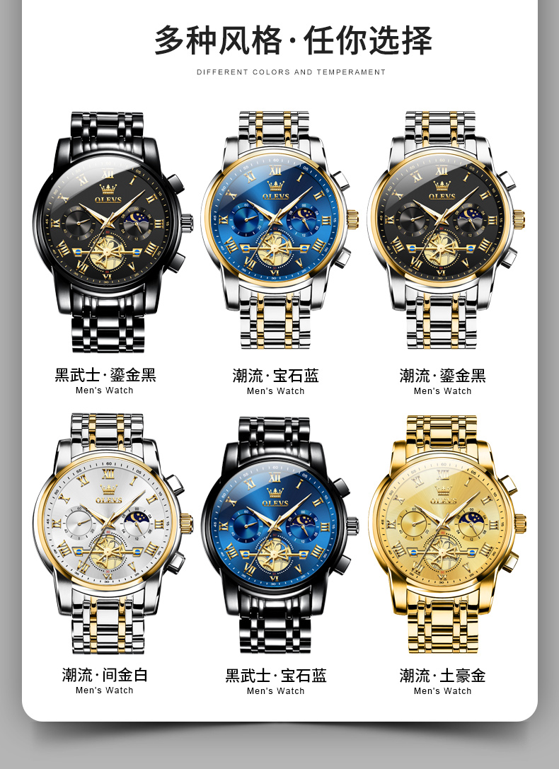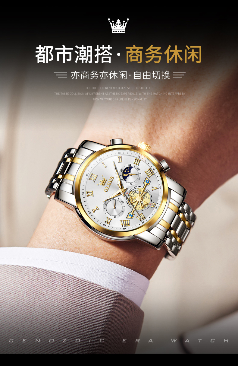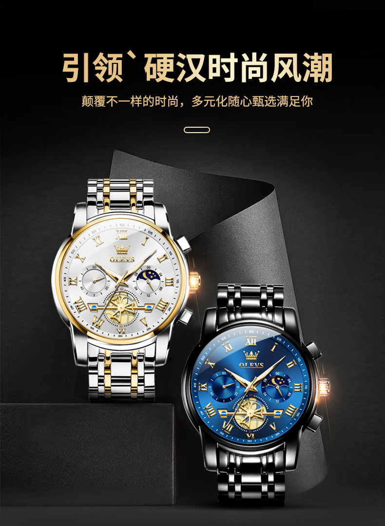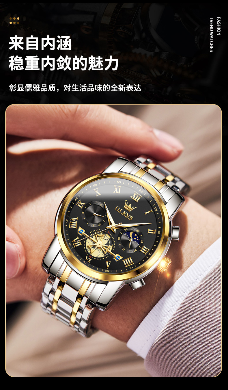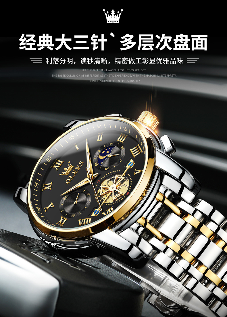 欧利时OLEVS 石英表 2859 新款 全自动机械表镂空防水 瑞士认证品牌 商务多功能全自动男士手表防水石英腕表