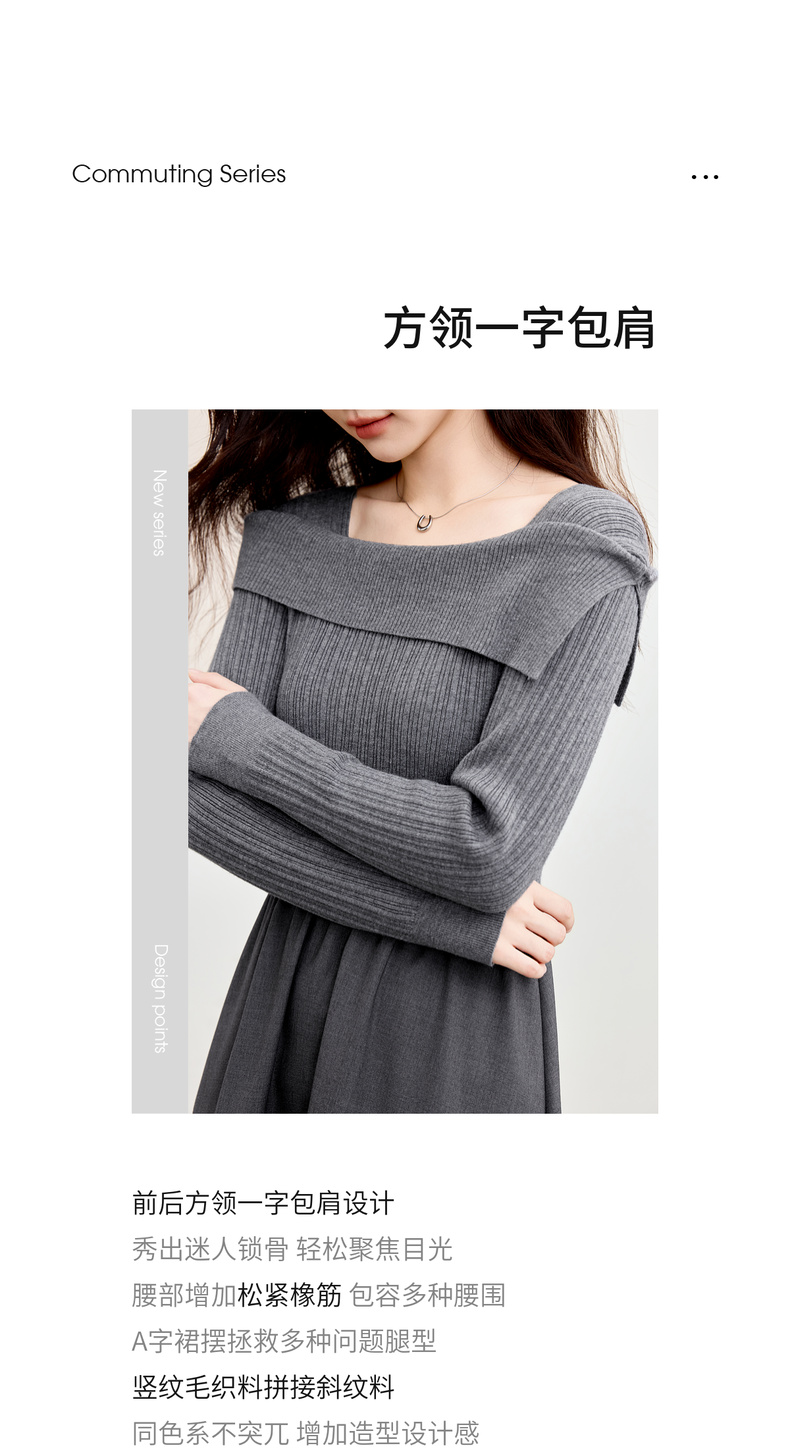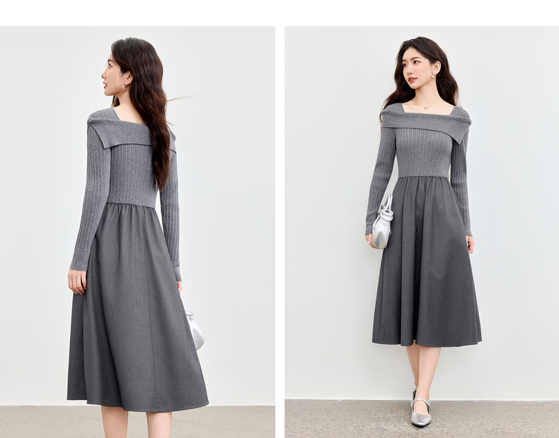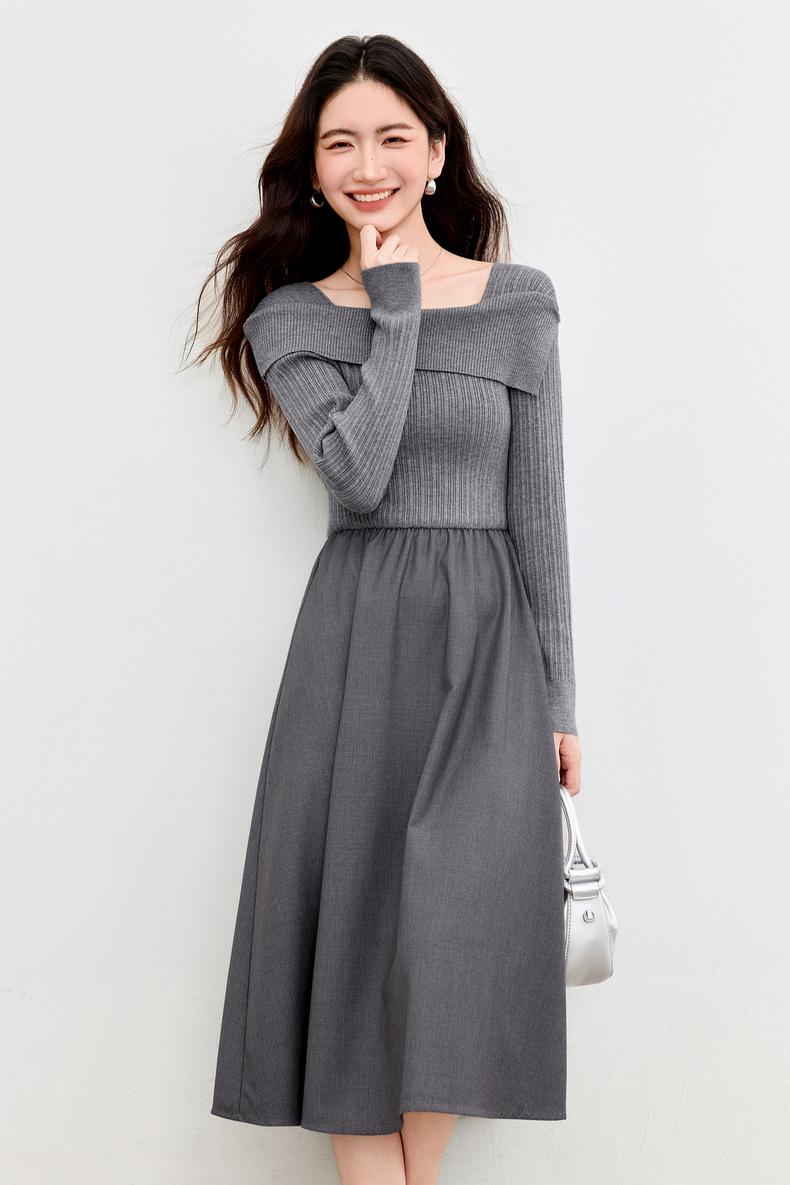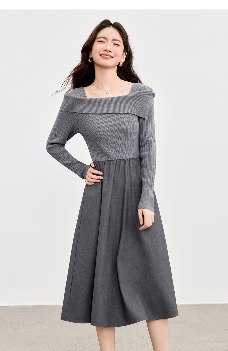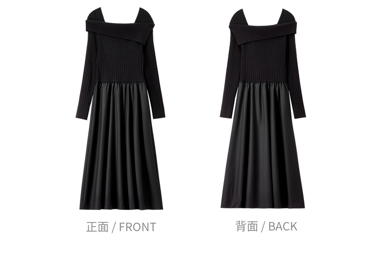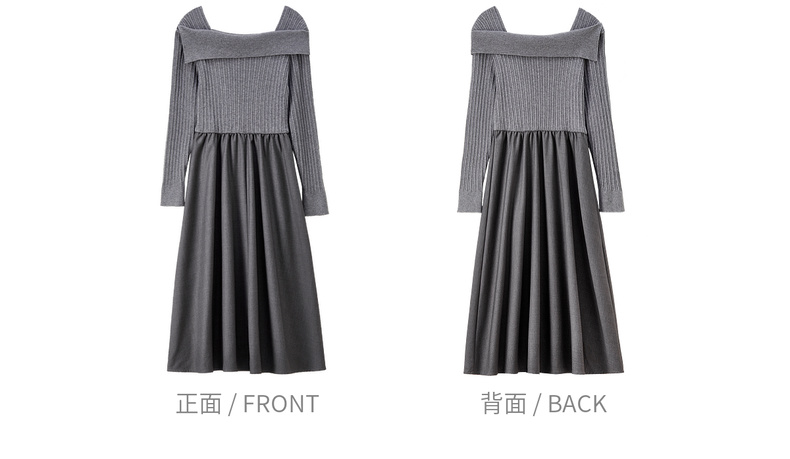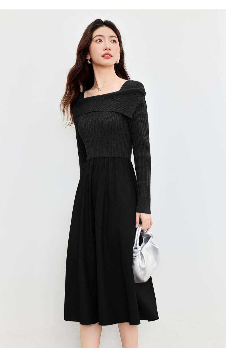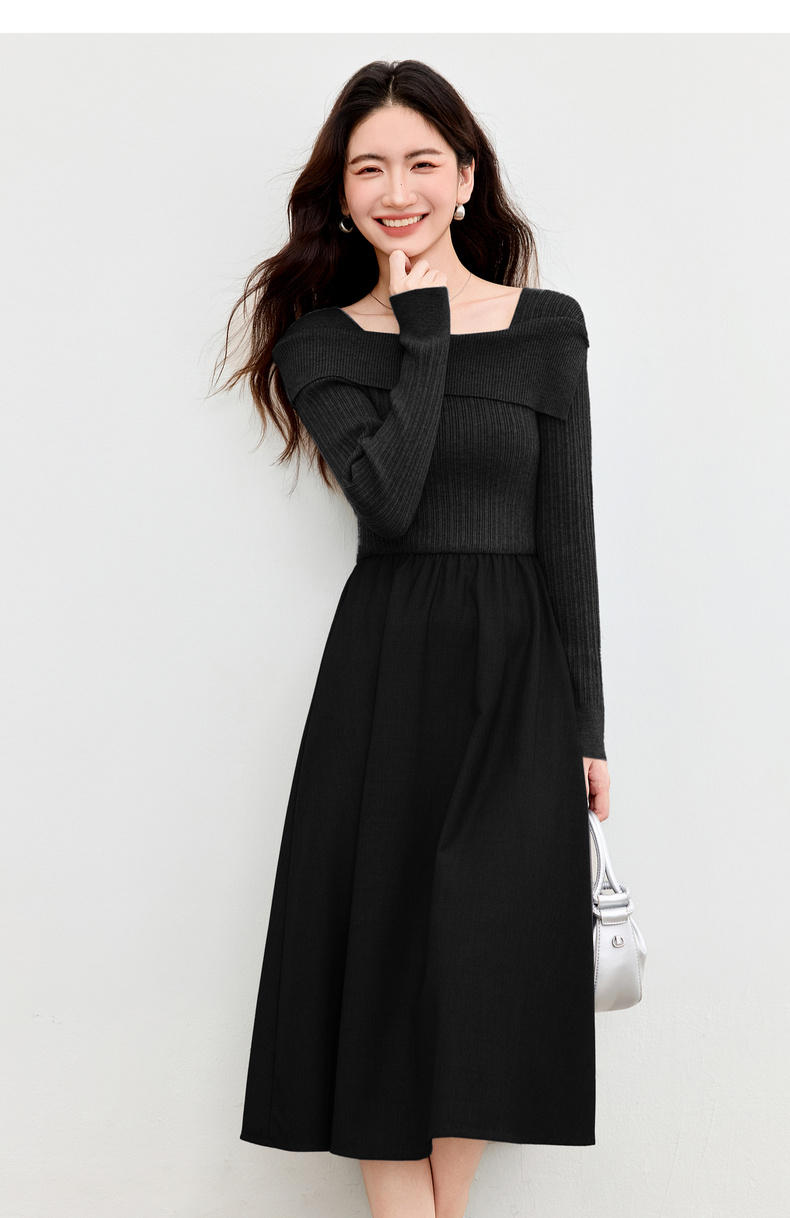 【内购】【拼接设计】优雅方领一字包肩松紧收腰遮肉显瘦A字连衣裙-753LI3100