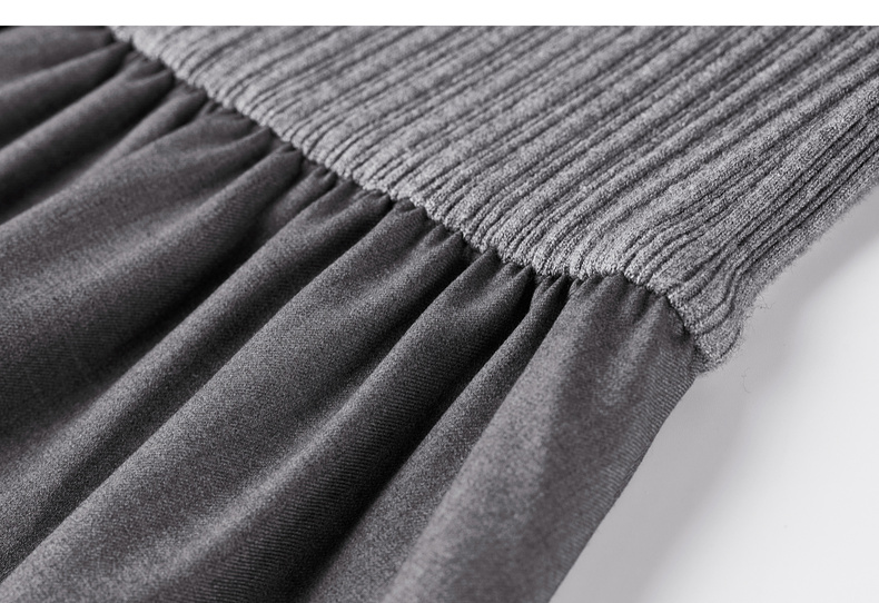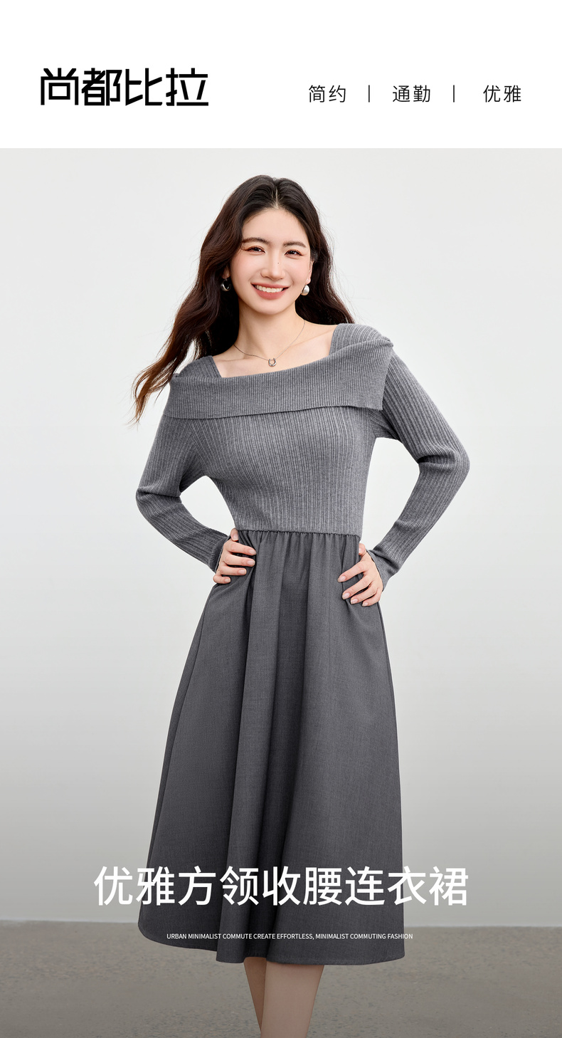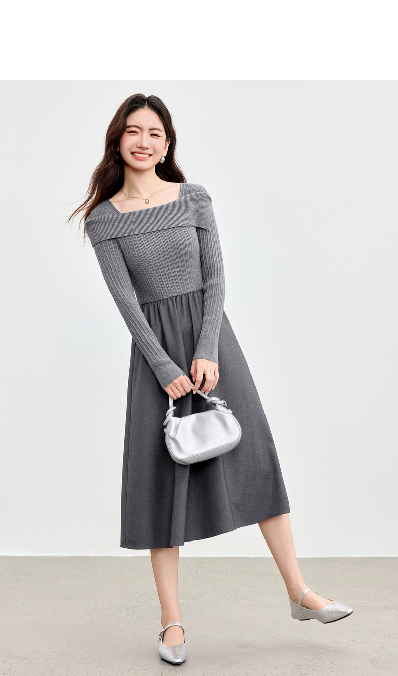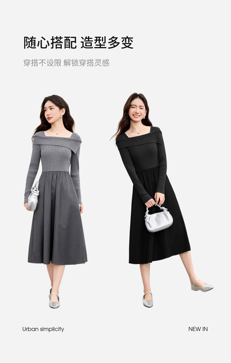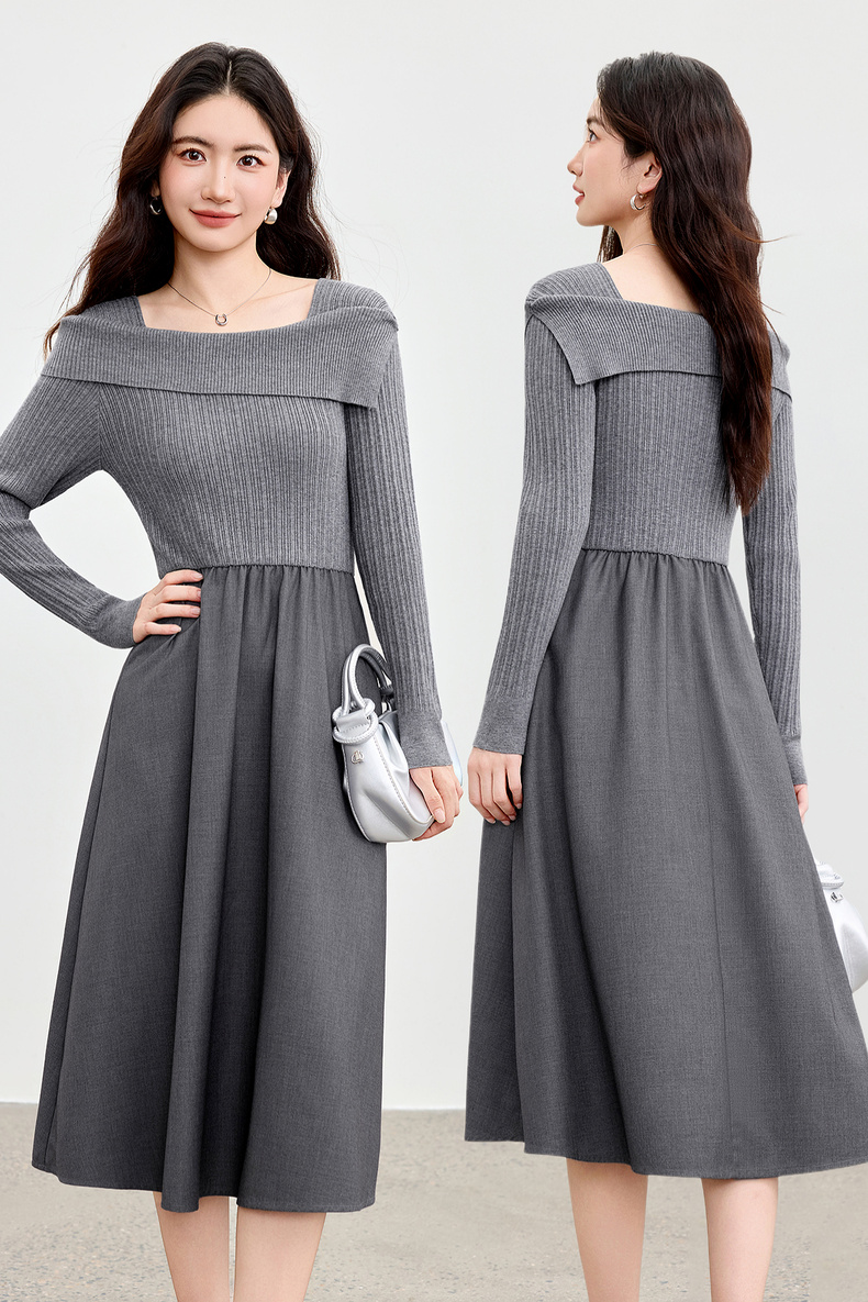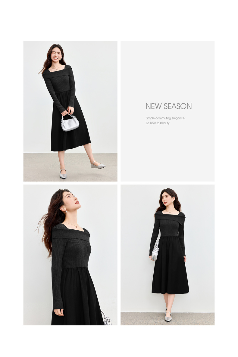 【内购】【拼接设计】优雅方领一字包肩松紧收腰遮肉显瘦A字连衣裙-753LI3100