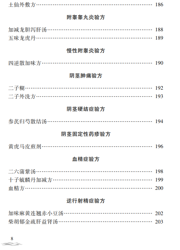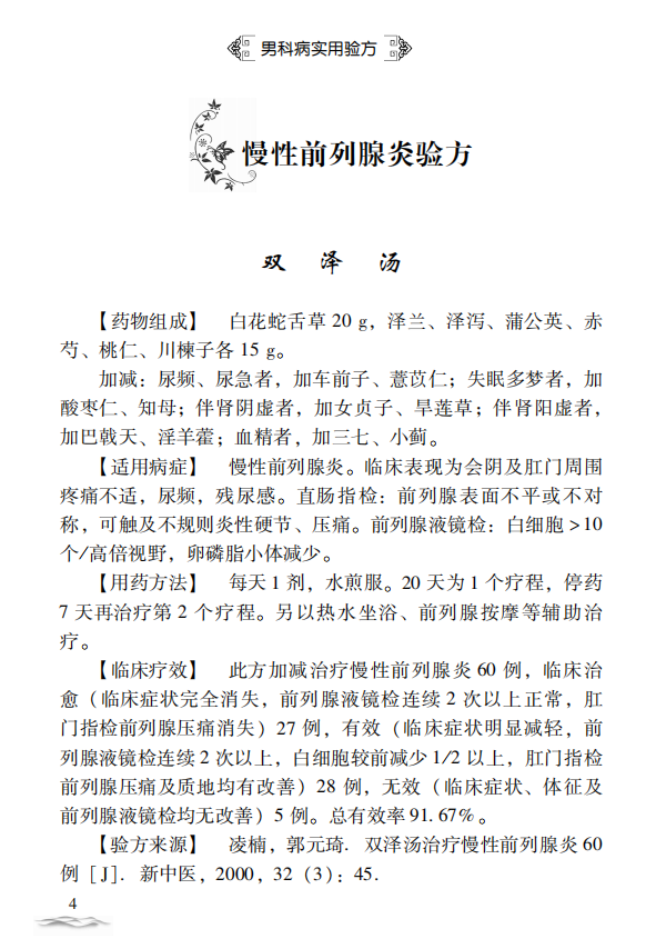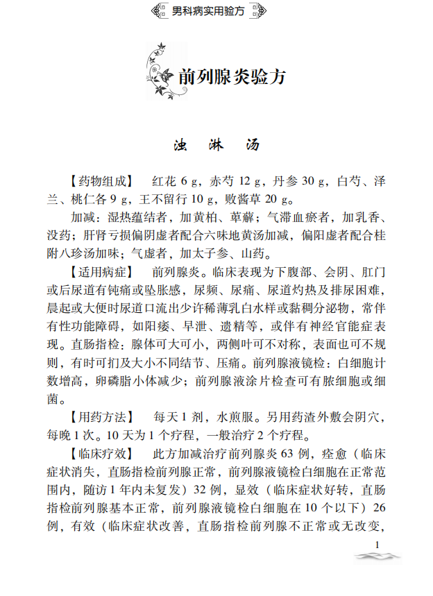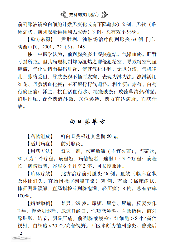 主要介绍慢性前列腺炎、慢性非细菌性前列腺炎、前列腺增生症、前列腺增生症致尿潴留、阳痿、精液不液化症、男性不育症等46种疾病,验方174首。