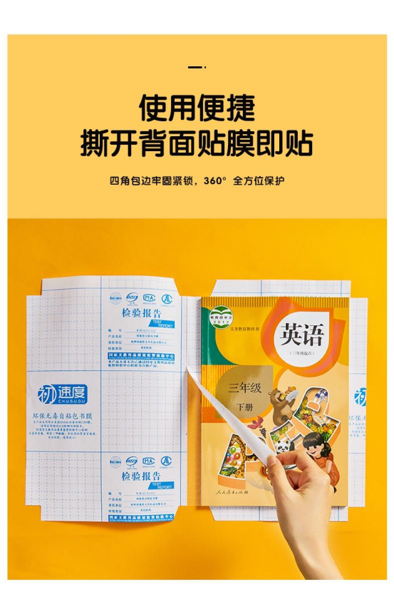 环保加厚磨砂包书皮耐磨,防污,防水,食品级PP材质,不会移动脱落,一学期下来书还是崭新的,人教版适合高初中小学生。◇教科书、字典、课堂笔记等经常使用,容易损坏,其他保护方法,通常一学期要包几次书!◇一体化书皮保护效果好,保持书本原有漂亮外观,可长达5年保护书籍!◇省事又省钱!!!◇一体化书皮?是透明的、单面带胶的高分子材料,粘贴在整个书的封面,与书一体,加厚保护!◇一体化可以保护书籍不被损坏!