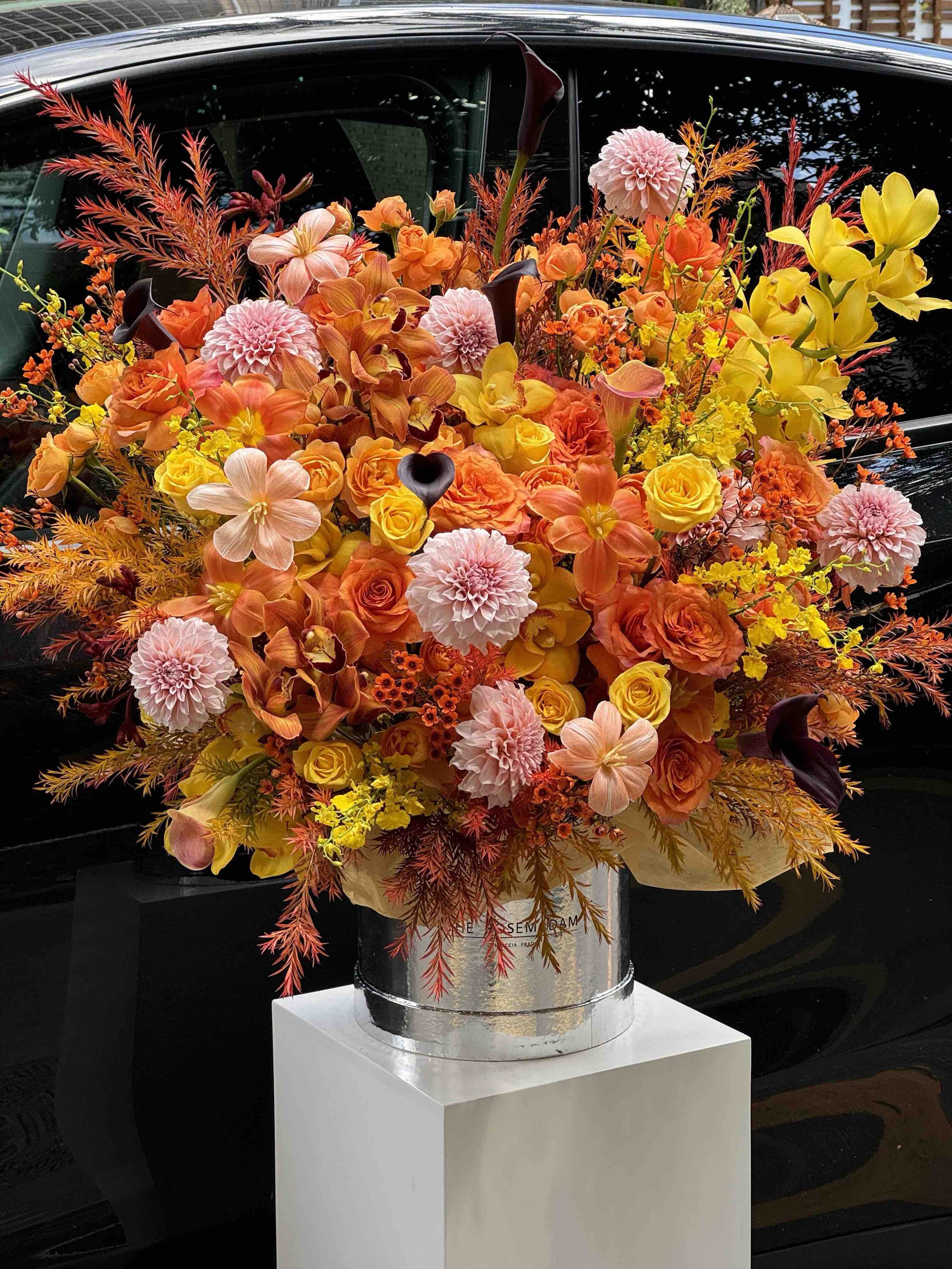 《心想事成》橙色系奶油桃子大花蕙兰抱抱桶