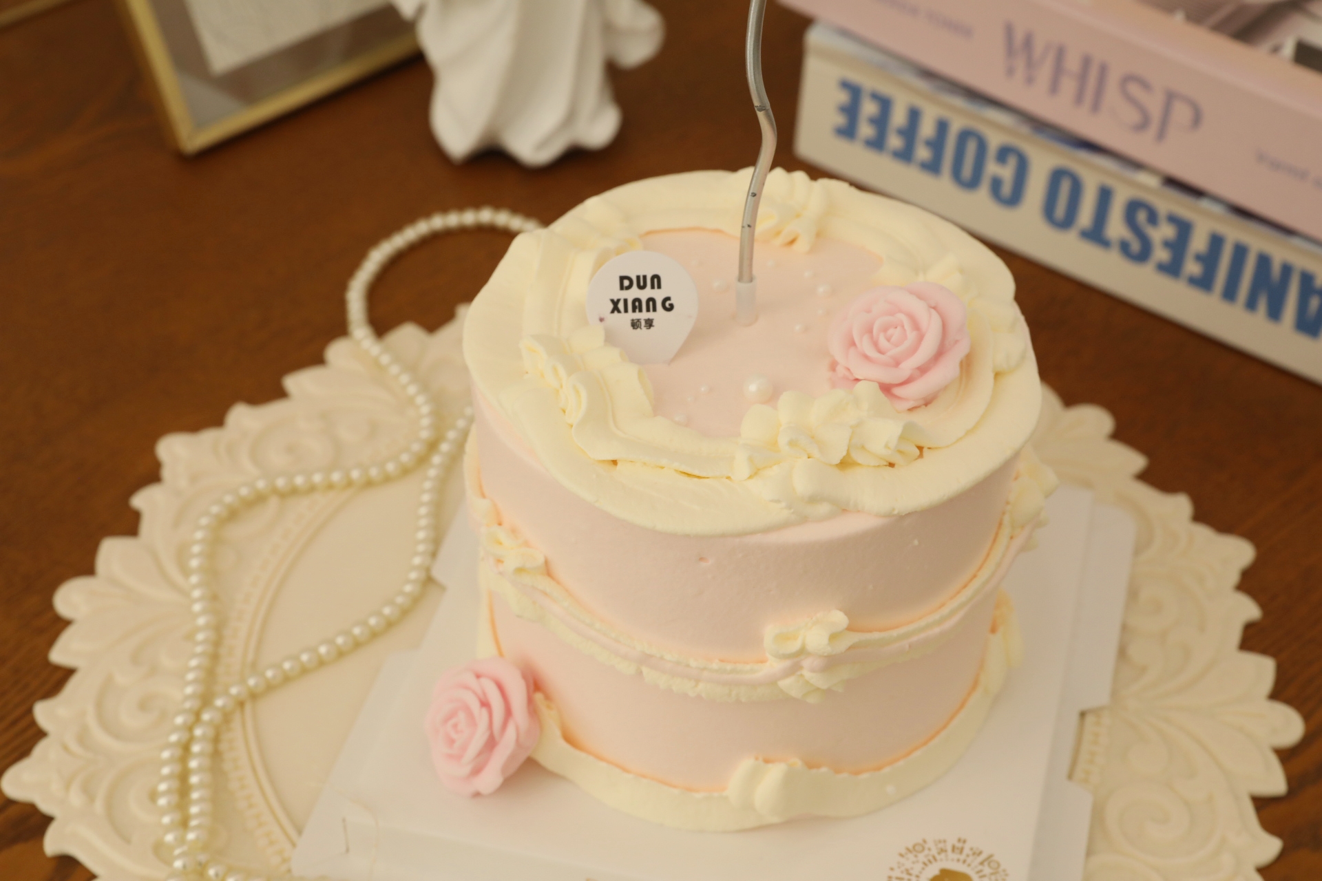 此款蛋糕玫瑰花装饰为巧克力制作