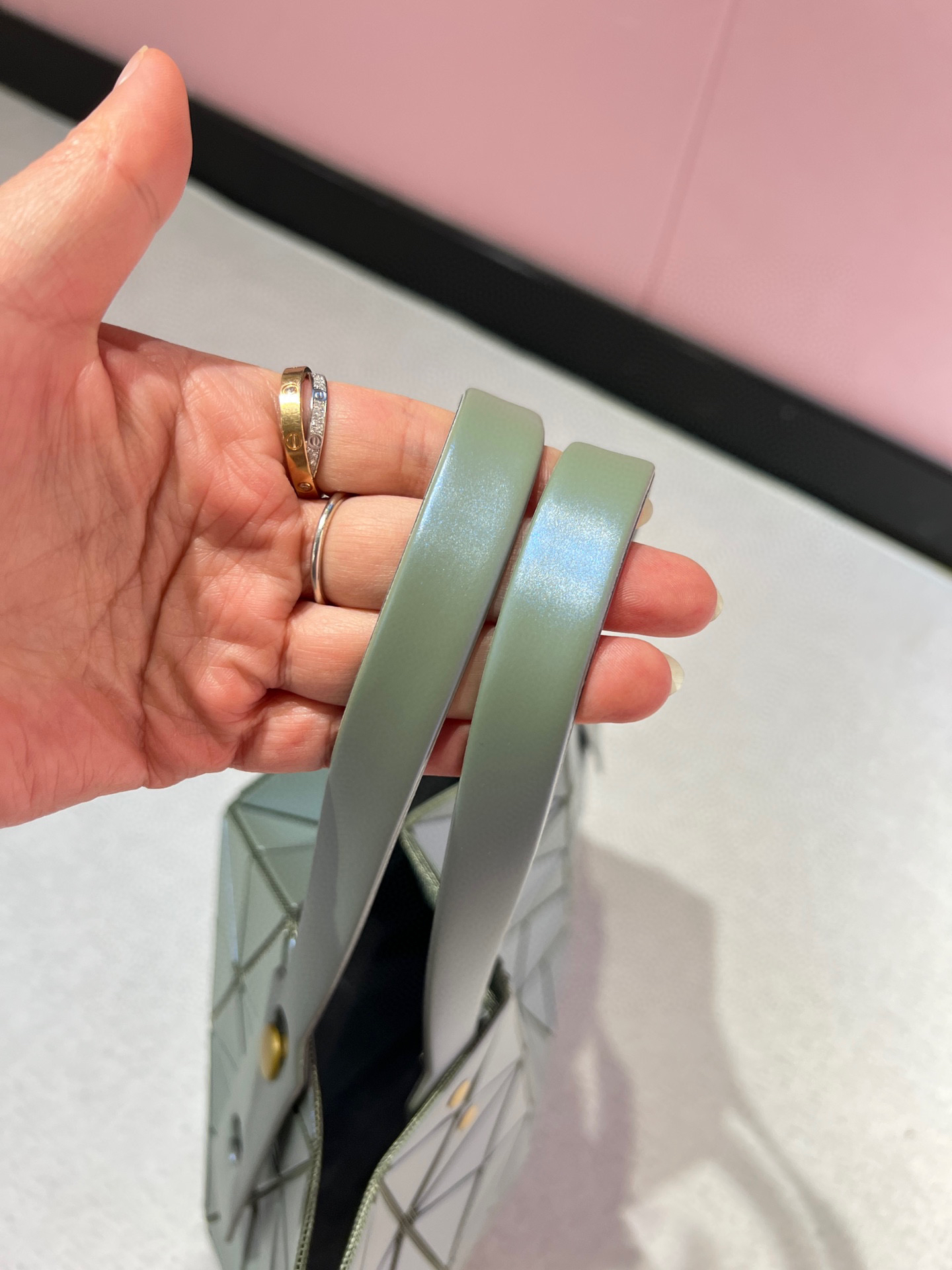 同步专柜五色~~简单的几何图案却能勾勒出无限的遐想空间 极简的设计风格 对称的美感 总能给我们一种~“原来包包还可以这个样子”这就是三宅~五色:浅绿/蓝紫/奶白/灰绿/粉橙