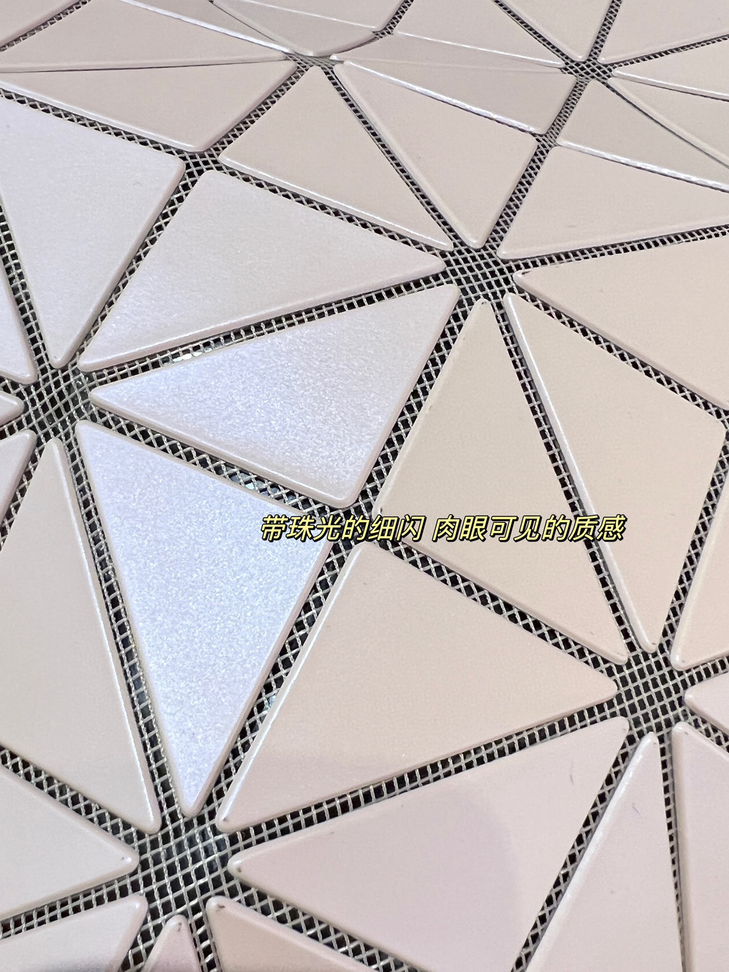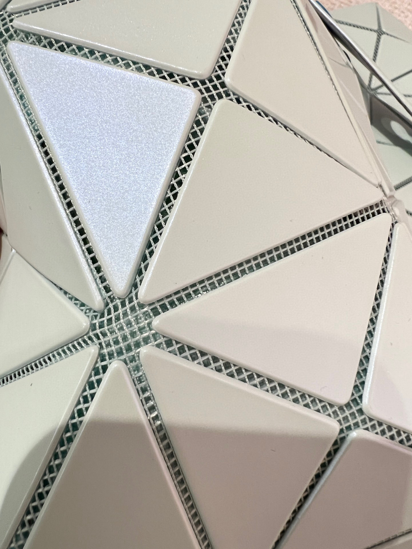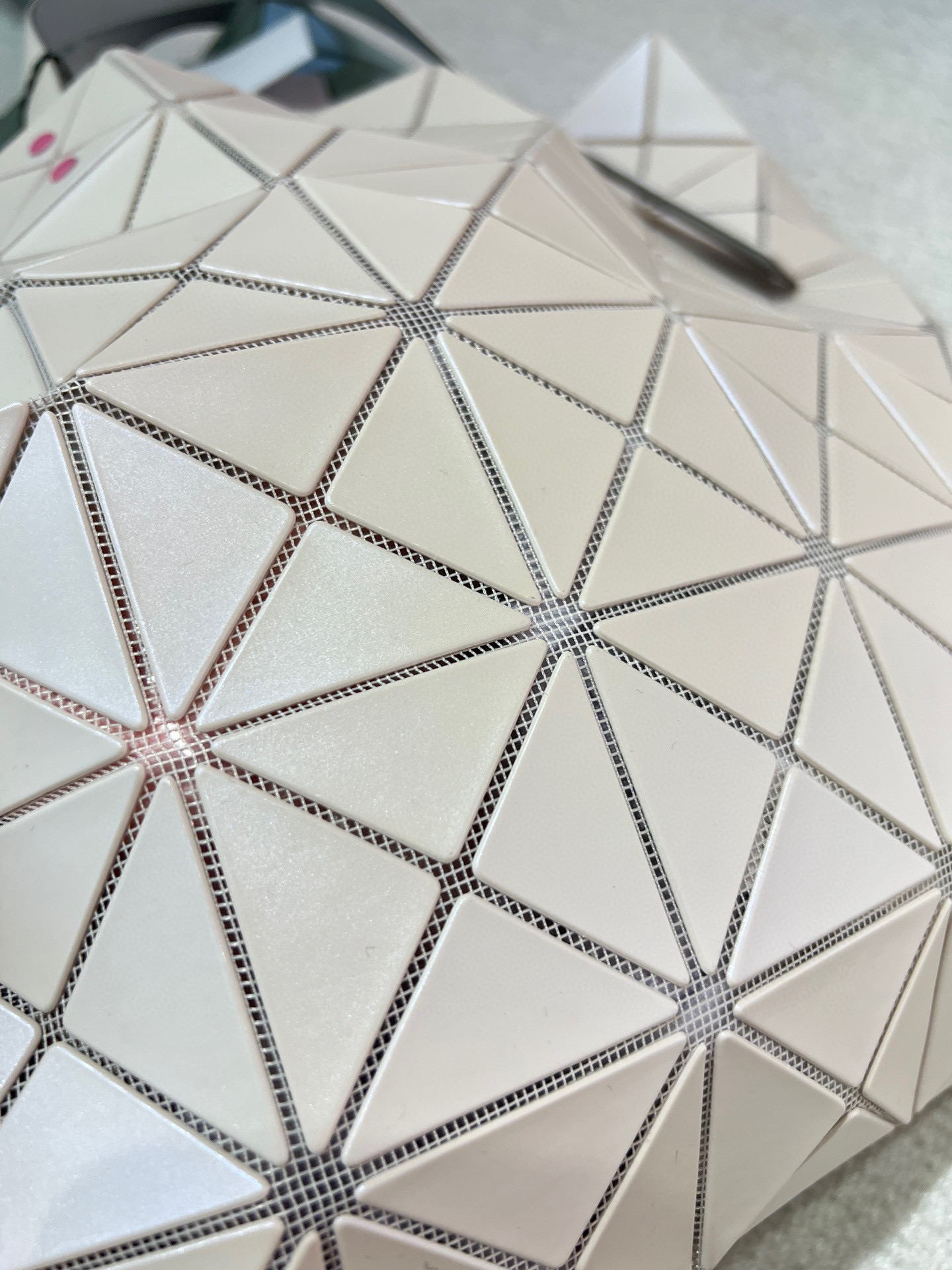 三宅三角雾面磨砂裁片无痕成型 带珠光的细闪 灯光或者阳光下更好看 裁片成型面积大 三角形片多容易产生各片成型率低下 报废率高 这也是新款款几何面料柜上价格高昂且稀少的原由 光材质就无法解决 国内只负责代工 没有过硬的渠道关系真心抢不到!三角片切割极精细 没有一丝毛糙感 市面也有 到手就不忍直视那种 还没用就都是毛刺 根本背不了几天 贴合紧密 进口料的优点~