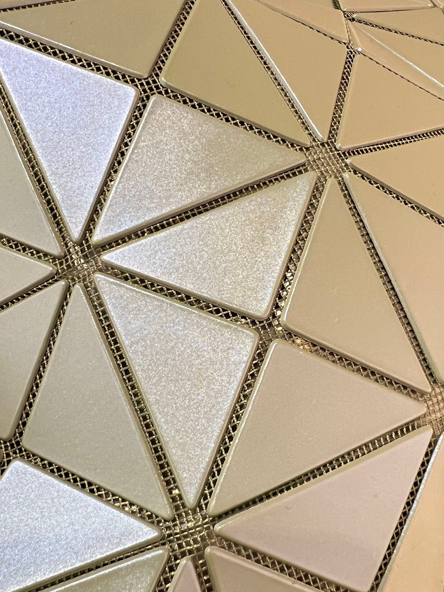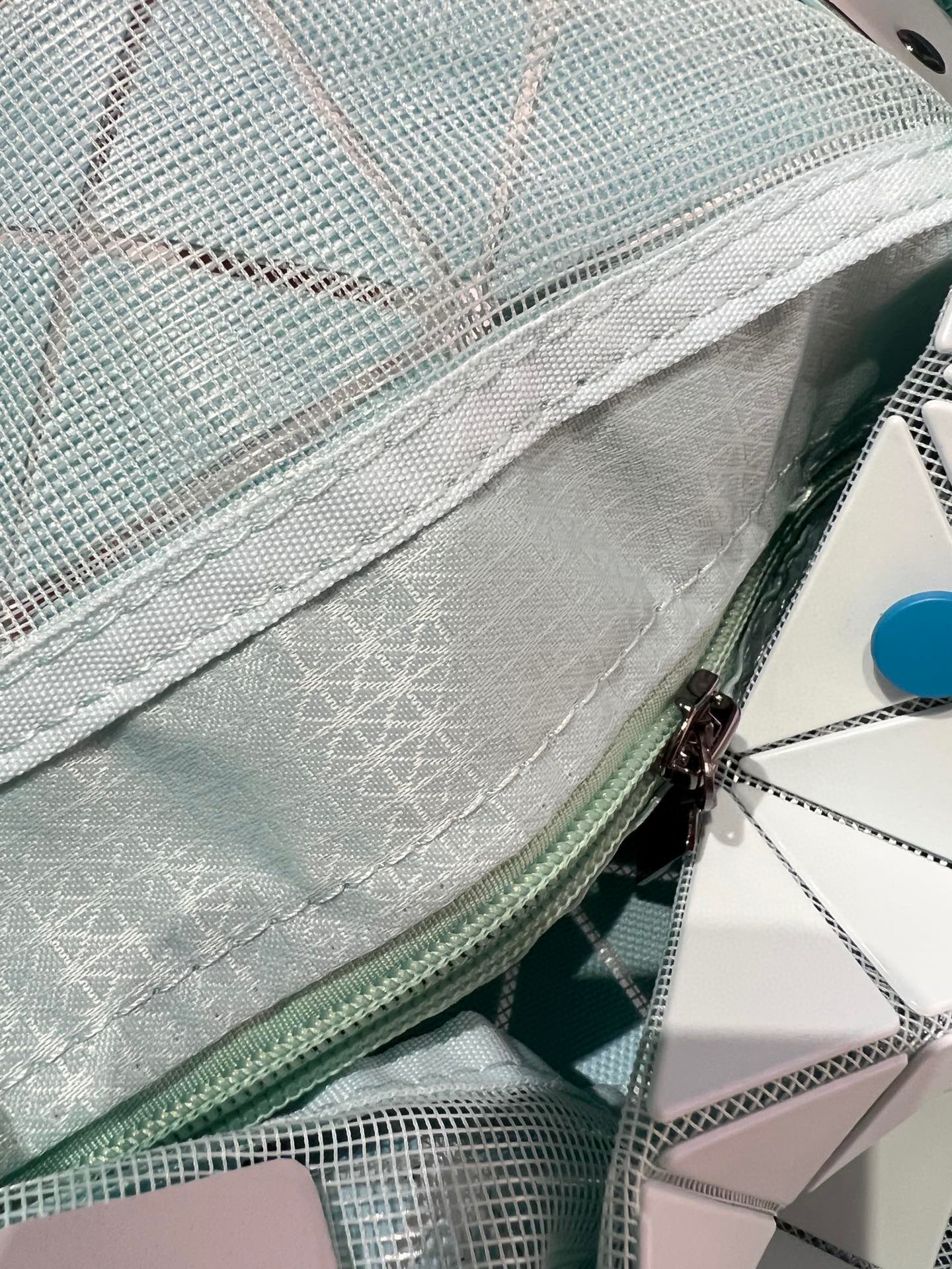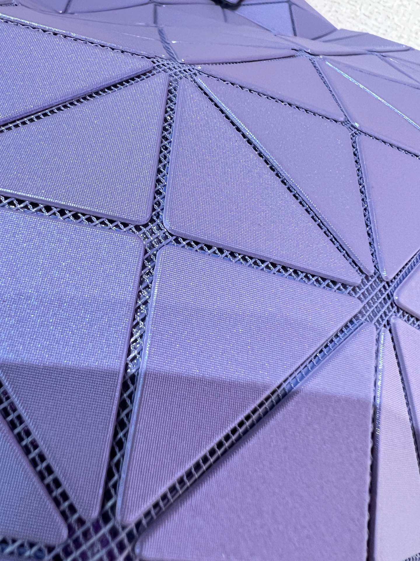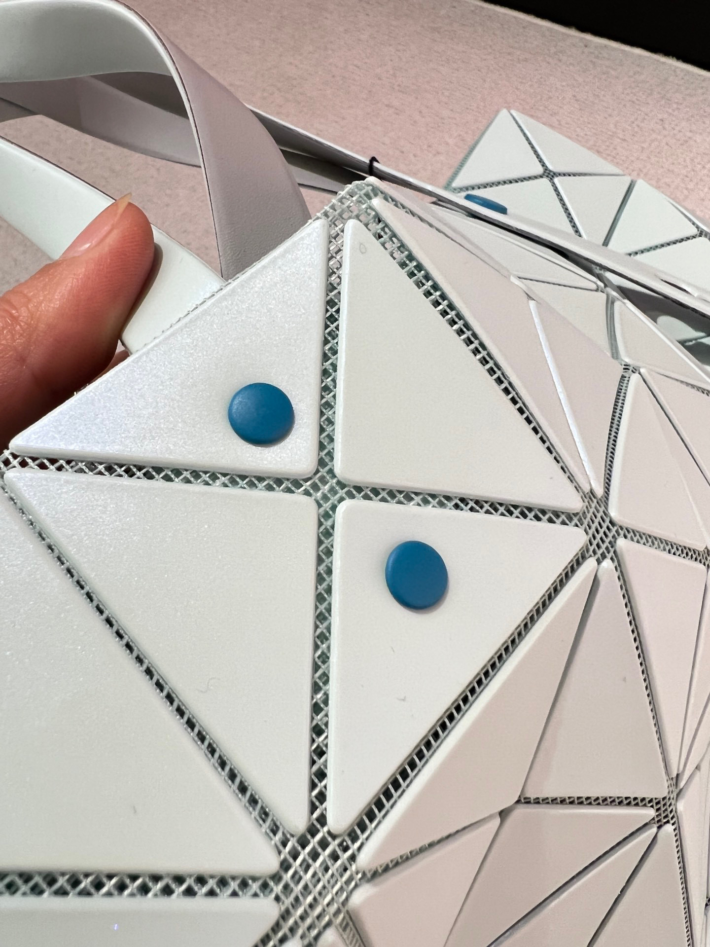 三宅三角雾面磨砂裁片无痕成型 带珠光的细闪 灯光或者阳光下更好看 裁片成型面积大 三角形片多容易产生各片成型率低下 报废率高 这也是新款款几何面料柜上价格高昂且稀少的原由 光材质就无法解决 国内只负责代工 没有过硬的渠道关系真心抢不到!三角片切割极精细 没有一丝毛糙感 市面也有 到手就不忍直视那种 还没用就都是毛刺 根本背不了几天 贴合紧密 进口料的优点~