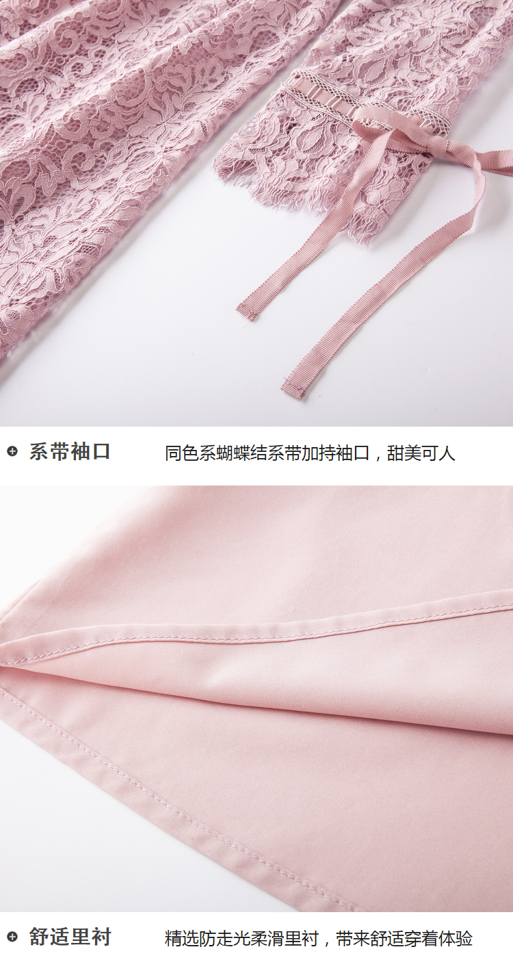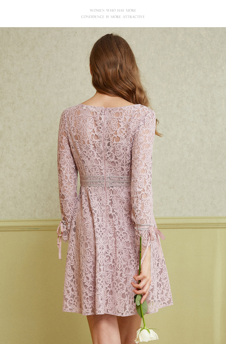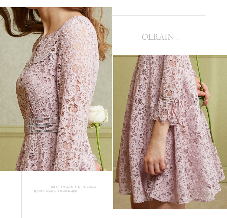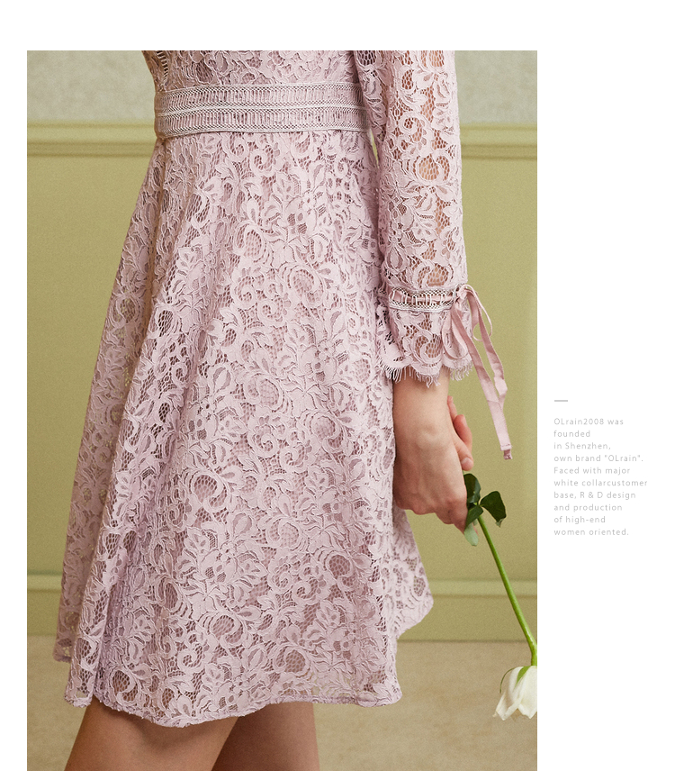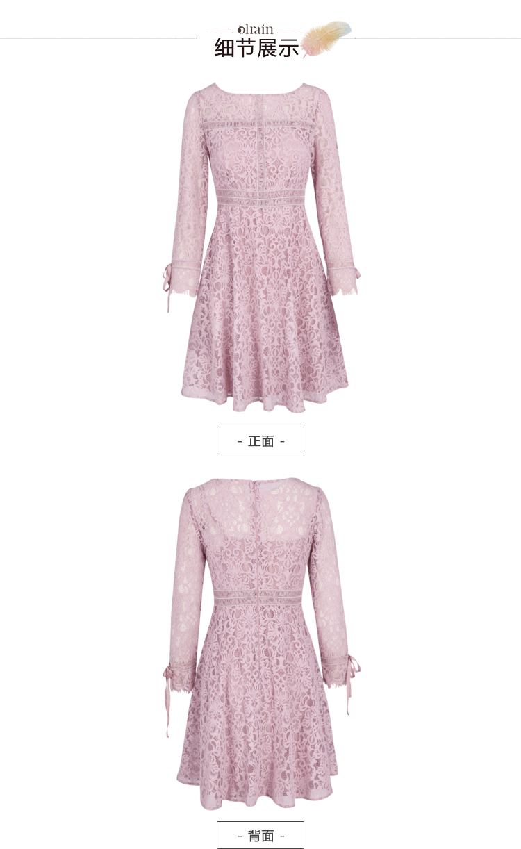 欧芮儿2019春 蝴蝶结收腰a字裙女长袖粉色蕾丝连衣裙中长款