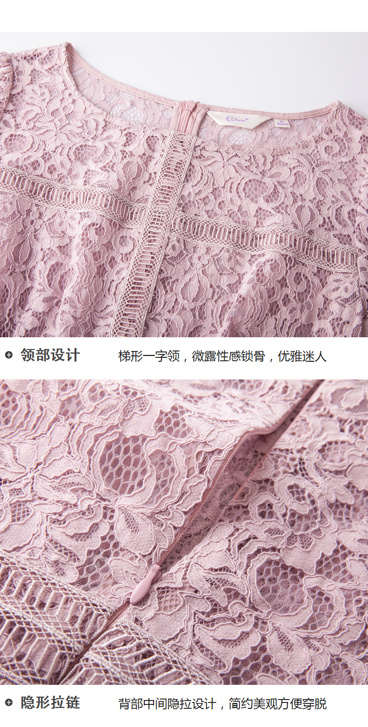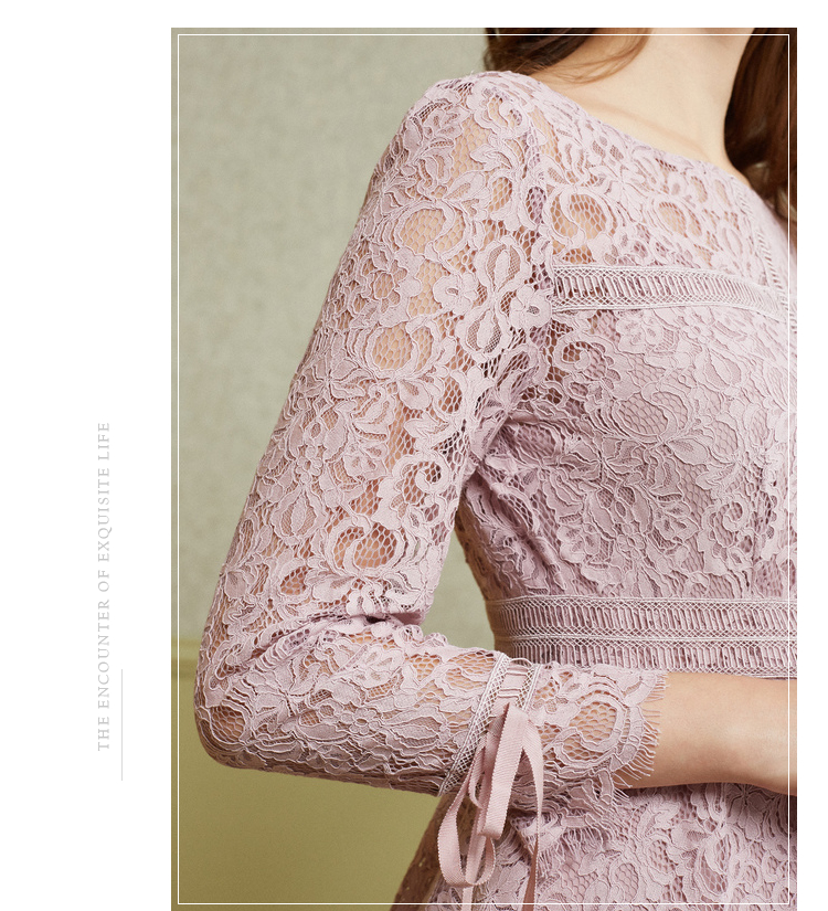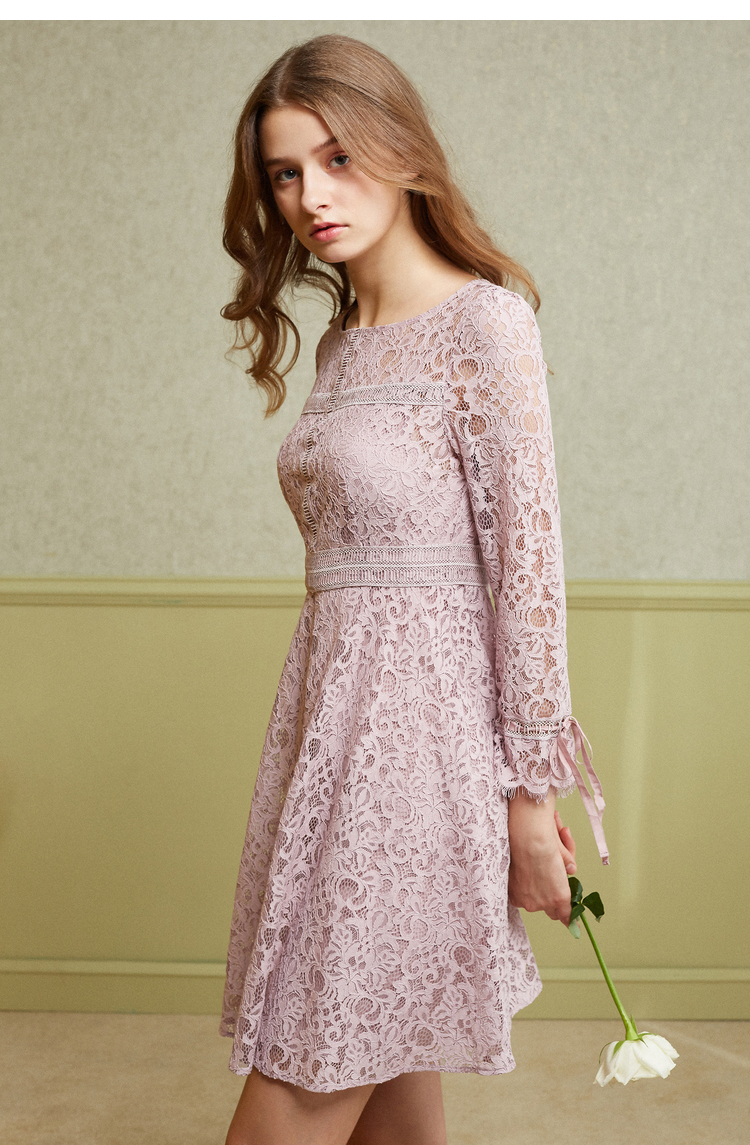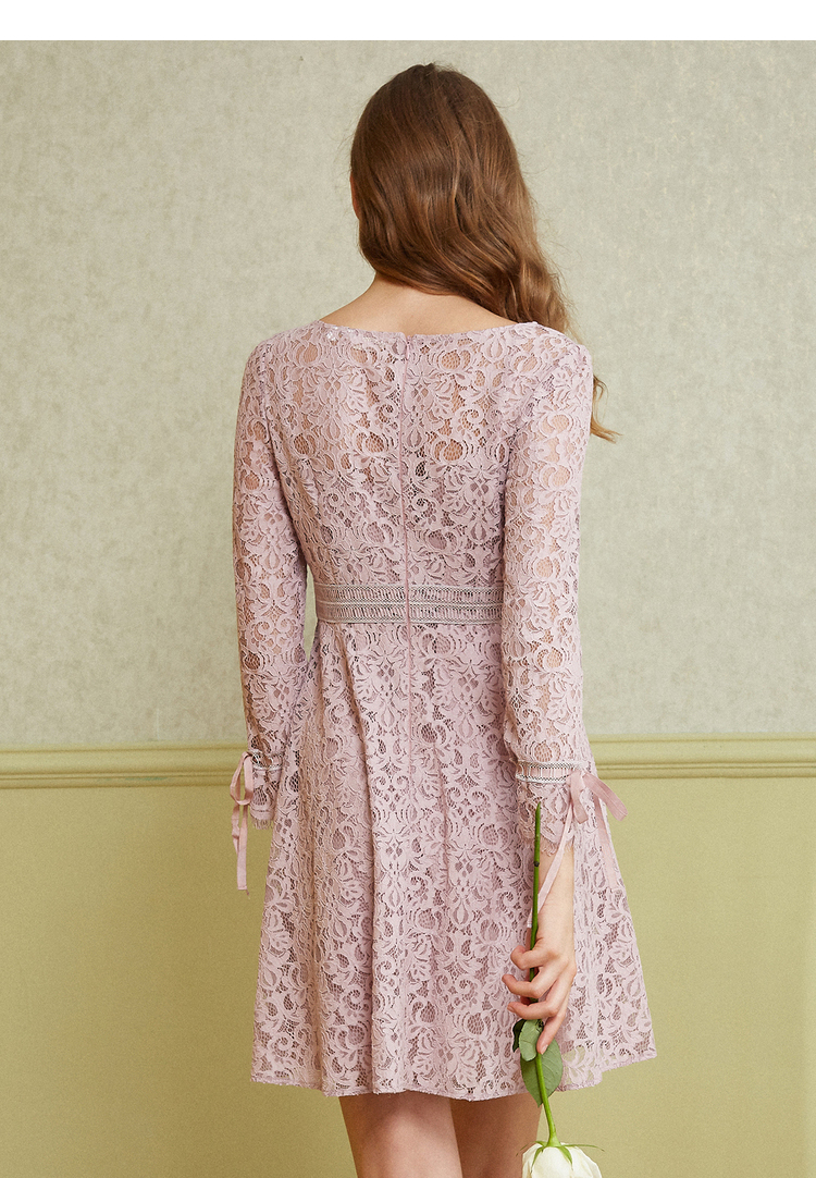 欧芮儿2019春 蝴蝶结收腰a字裙女长袖粉色蕾丝连衣裙中长款
