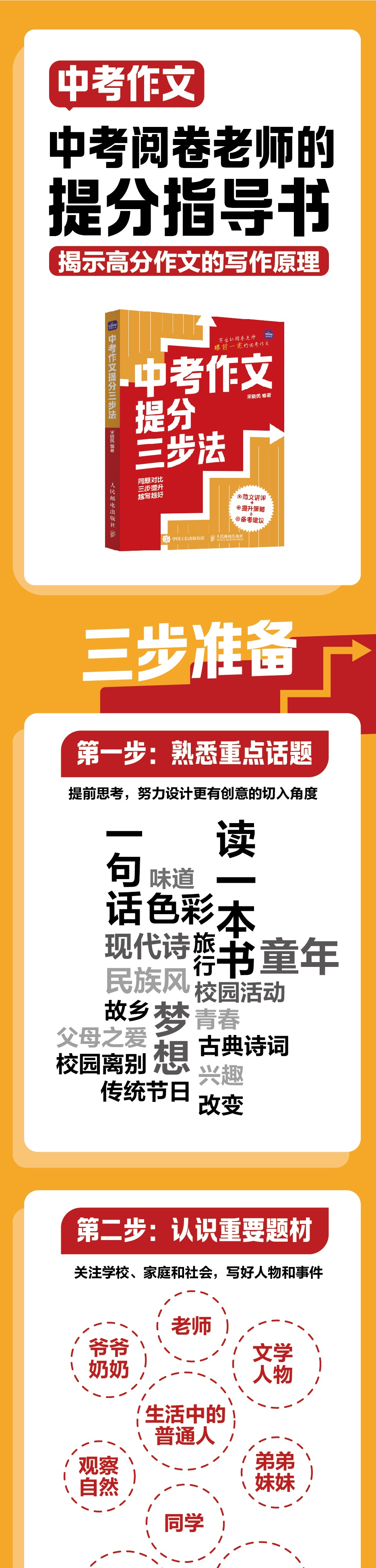 本书选取了近年来中考作文题的36个关键主题和核心词,用三步法展示不好的作文是什么样的,好的作文是什么样的,对比之下,学生会对如何写好作文理解得更加深刻,从而写出能让阅卷老师眼前一亮、得高分甚*满分的中考作文。 全书布局应用了三步法:*步,熟悉重点话题;*步,认识重要题材;第三步,了解常见文体和写法。每一节在主题阐释之后,也采用了三步法:*步,讲评;*步,给出提升策略;第三步,给出备考建议。 本书适合初中学生及其家长,以及中学语文教师阅读。