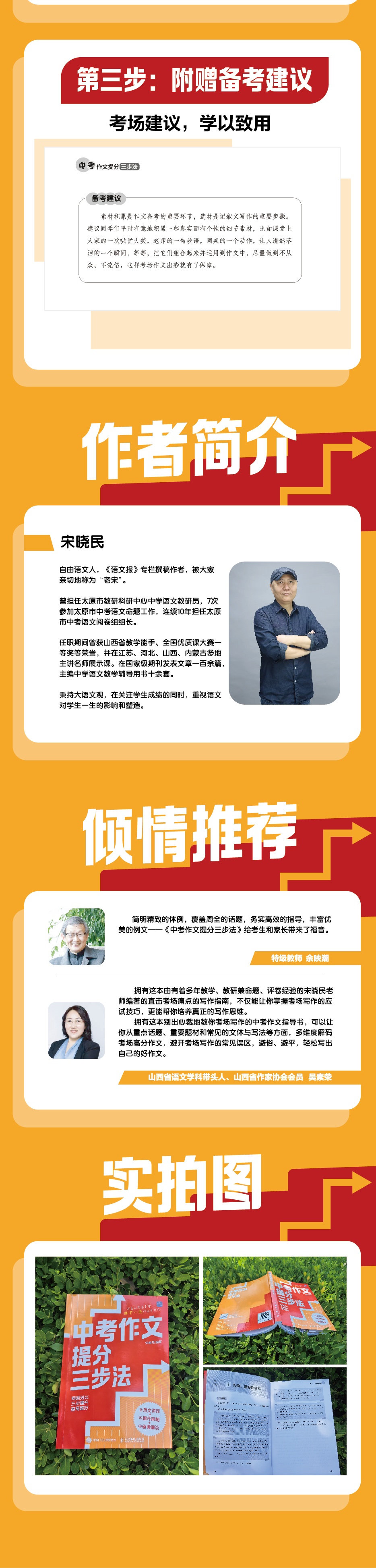 宋晓民 自由语文人,《语文报》专栏撰稿作者,被大家*切地称为“老宋”。 曾担任太原市教研科研中心中学语文教研员,7次参加太原市中考语文命题工作,连续10年担任太原市中考语文阅卷组组长。 任职期间曾获山西省教学能手、优质课大赛一等奖等荣誉,并在江苏、河北、山西、内蒙古多地主讲名师展示课。在期刊发表文章一百余篇,主编中学语文教学辅导用书十余套。 秉持大语文观,在关注学生成绩的同时,重视语文对学生一生的影响和塑造。