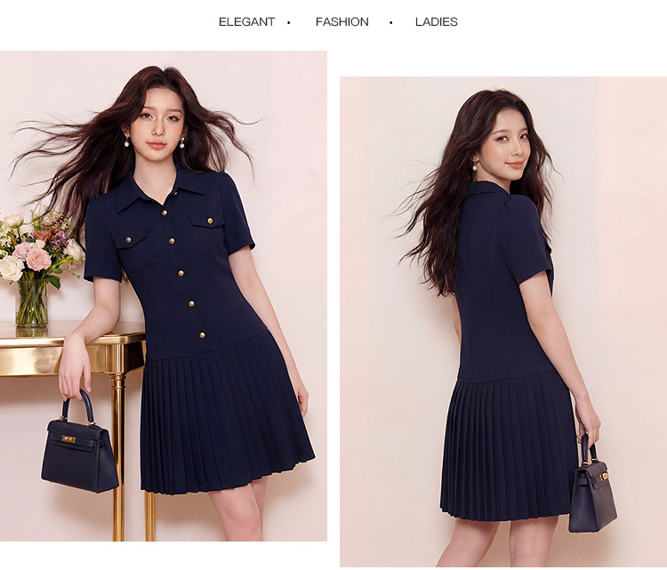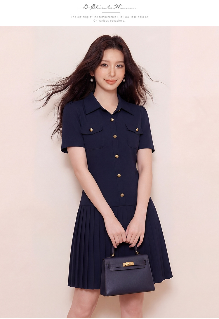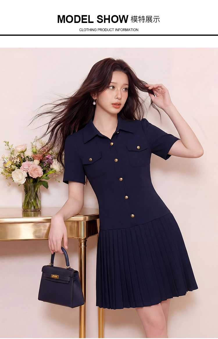 奢姿大码女装2026夏季翻领设计气质连衣裙假口袋百褶时尚轻奢裙子9962860019