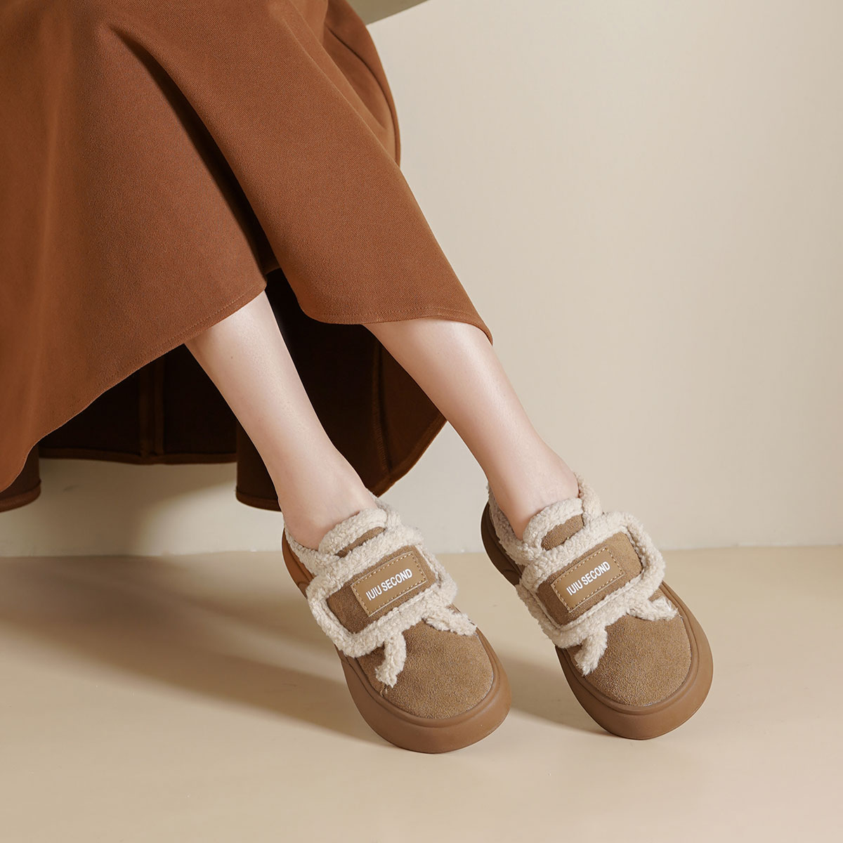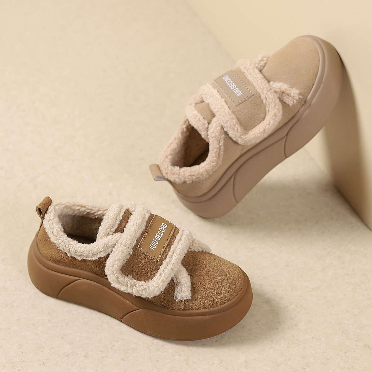 西村名物2025年春季新款绒毛保暖超轻厚底防滑魔术贴板鞋T24DM48401