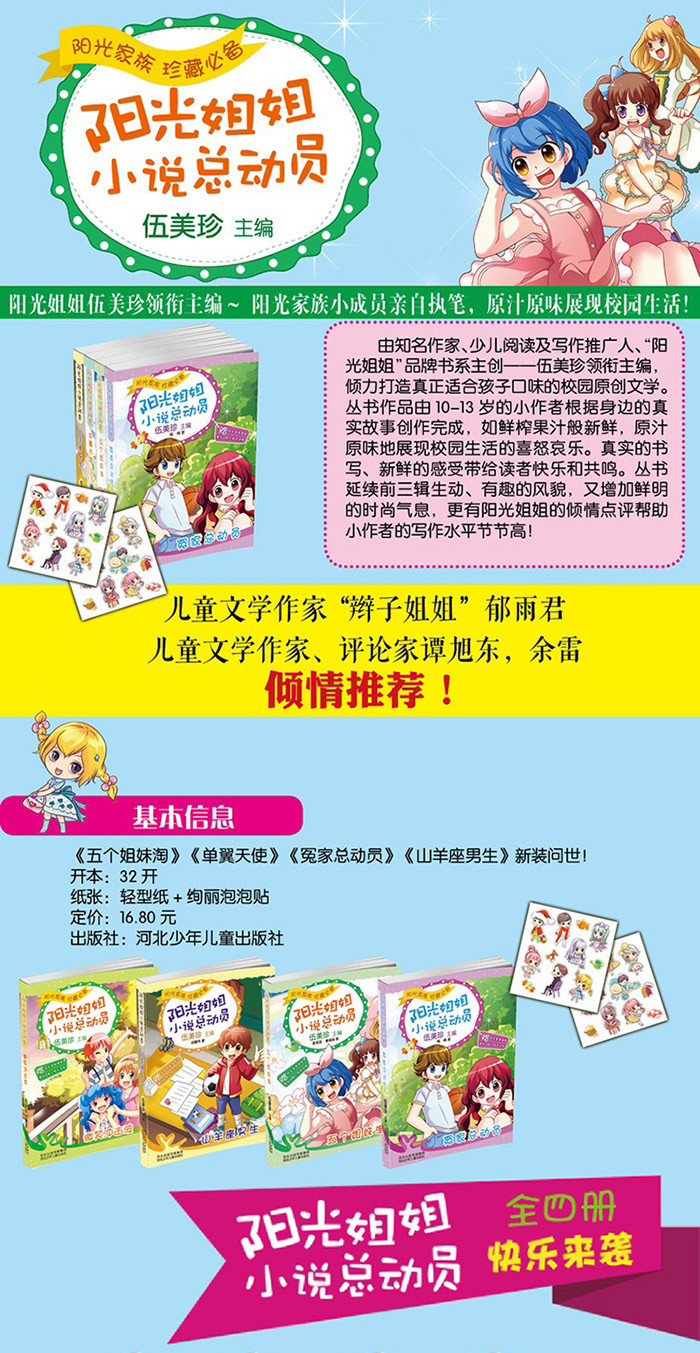 由知名作家、少儿阅读及写作推广人、“阳光姐姐”品牌书系主创――伍美珍领衔主编,倾力打造真正适合孩子口味的校园原创文学。丛书作品由10-13岁的小作者根据身边的真实故事创作完成,如鲜榨果汁般新鲜,原汁原味地展现校园生活的喜怒哀乐。真实的书写、新鲜的感受带给读者快乐和共鸣。丛书延续前三辑生动、有趣的风貌,又增加鲜明的时尚气息,更有阳光姐姐的倾情点评帮助小作者的写作水平节节高! 丛书包括《单翼天使》《山羊座男生》《冤家总动员》《五个姐妹淘》四册。