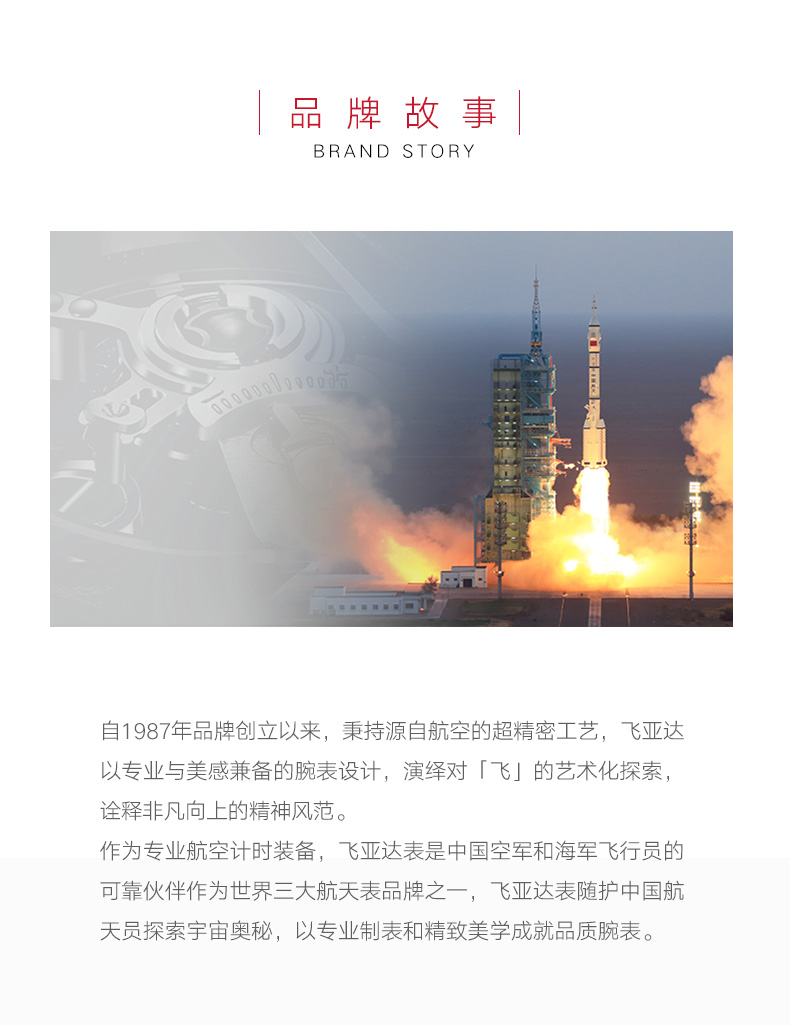 飞亚达表秉持源自航空的超精密工艺,飞亚达以专业与美感兼具的腕表设计,演绎对“飞”的艺术化探索,诠释非凡向上的品牌风范,讲述“一旦拥有,别无所求”的故事。