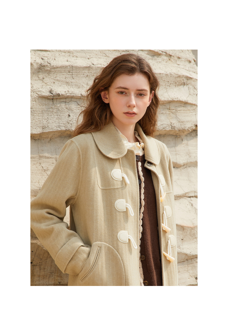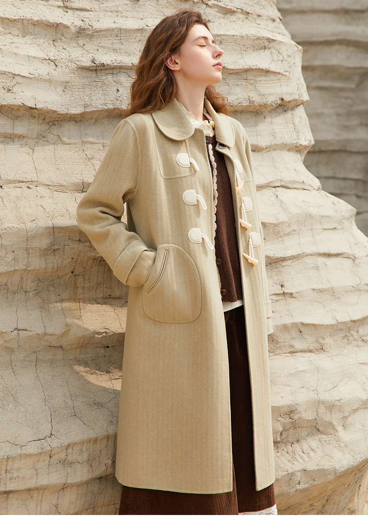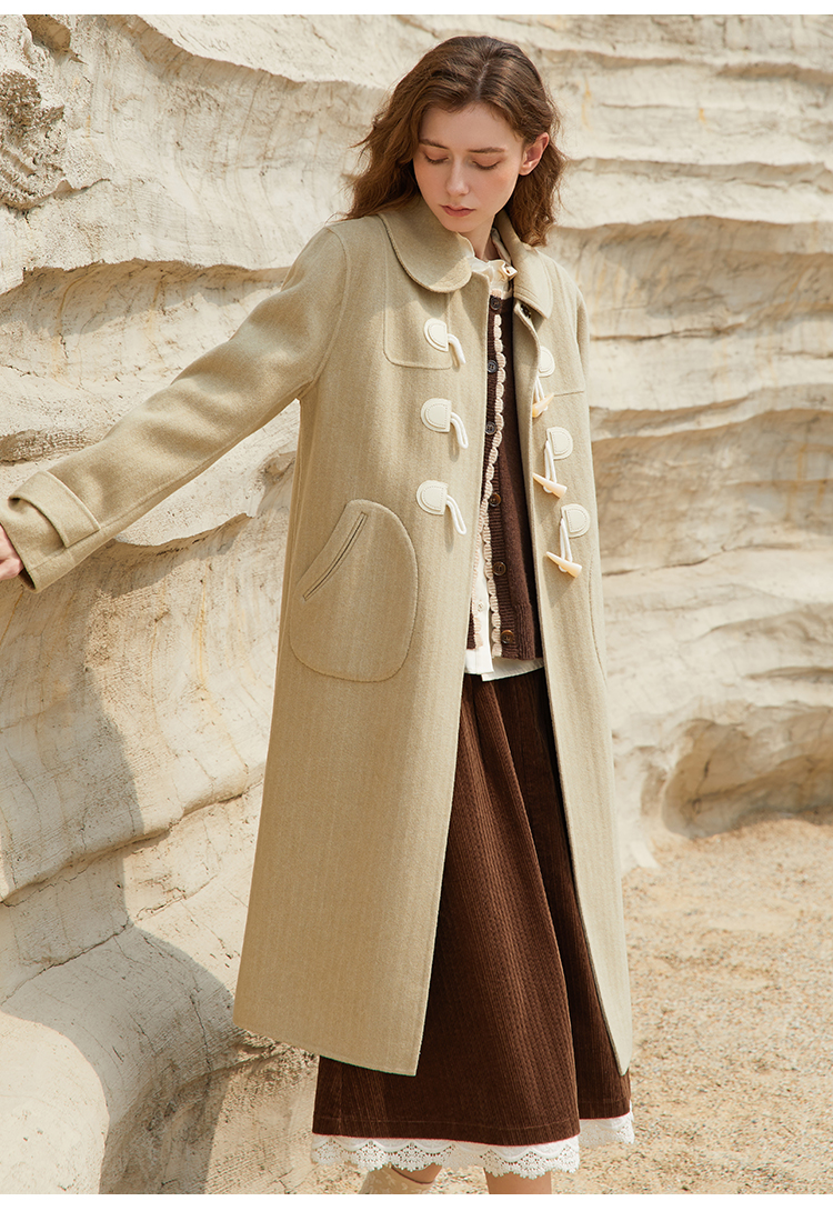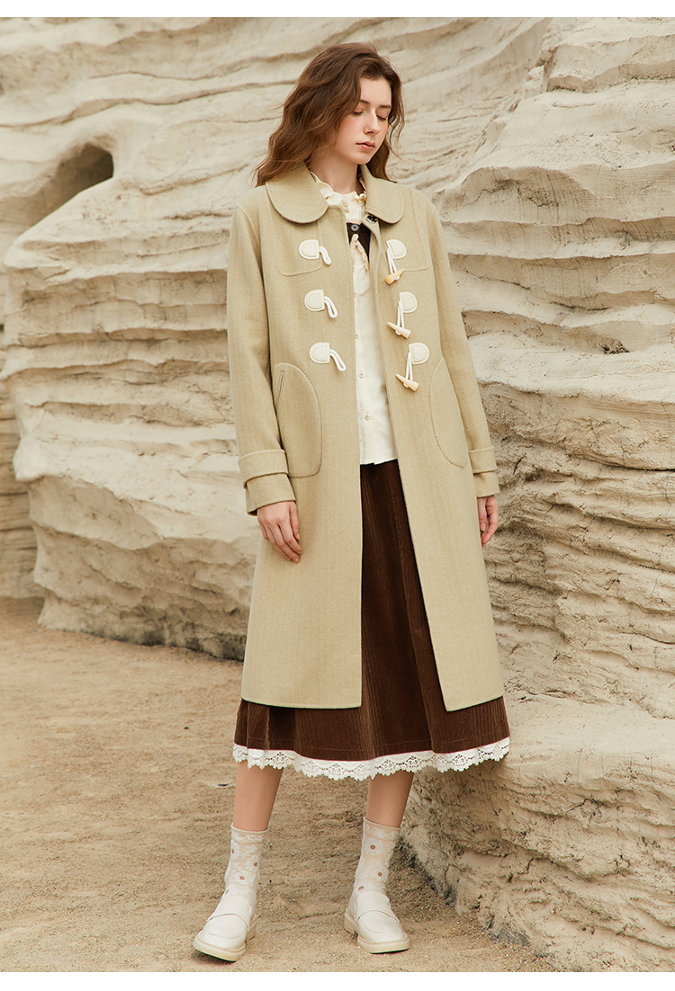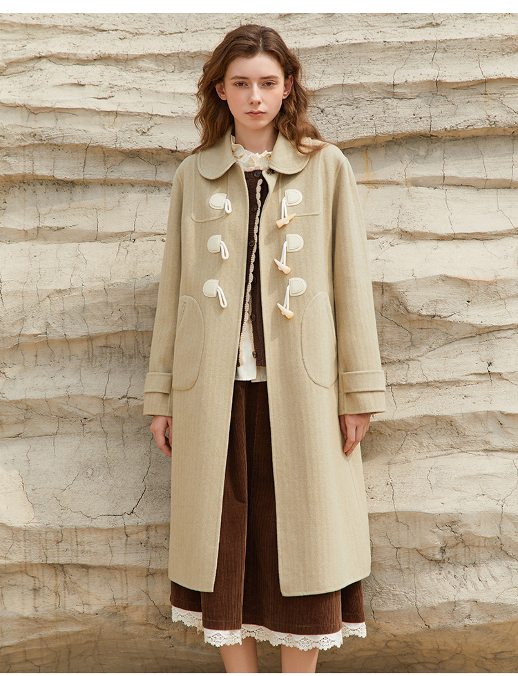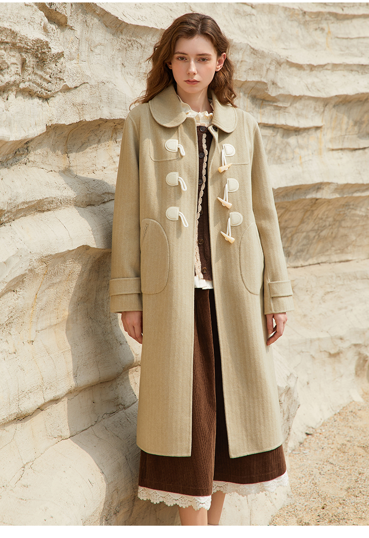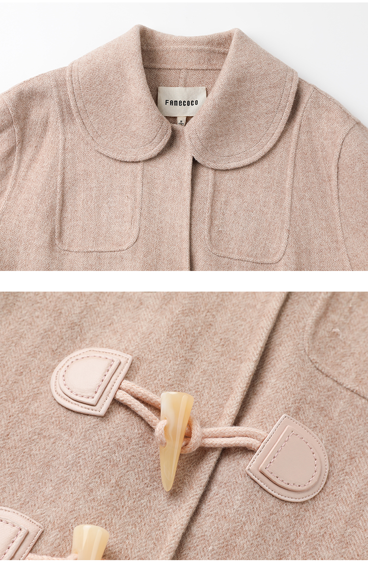 Famecoco长款牛角扣呢子大衣女冬毛呢外套FAB8AQ005