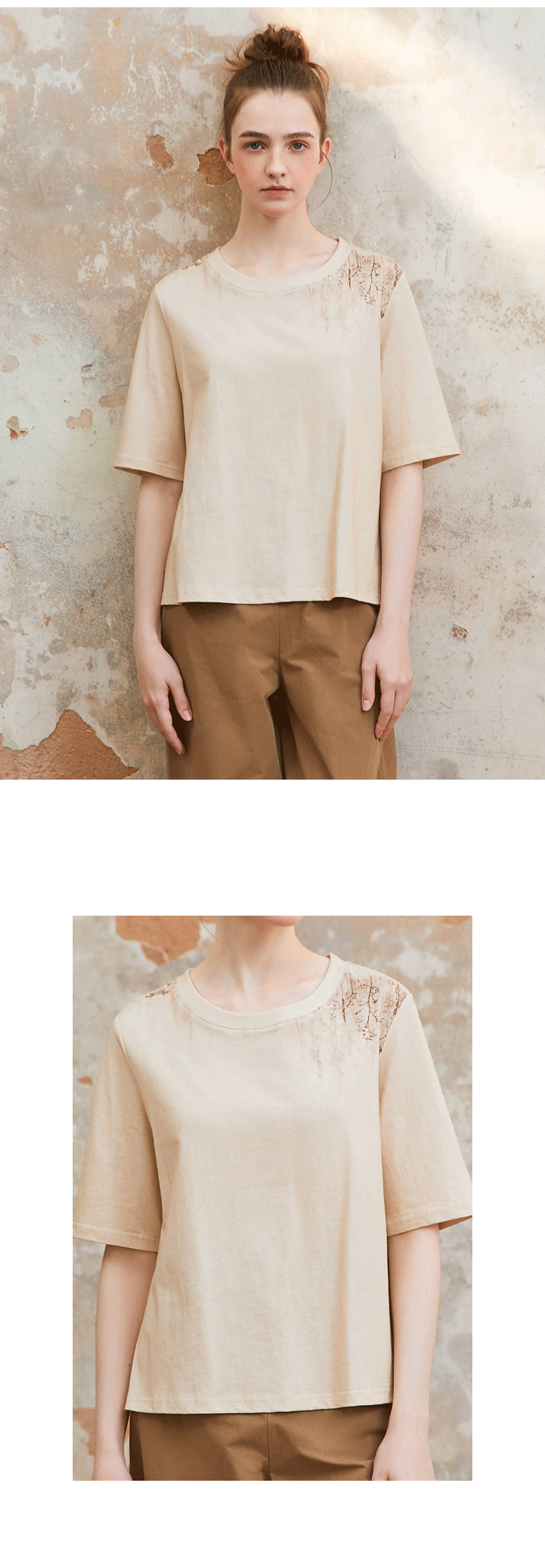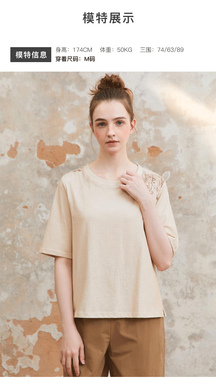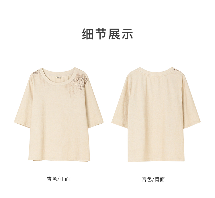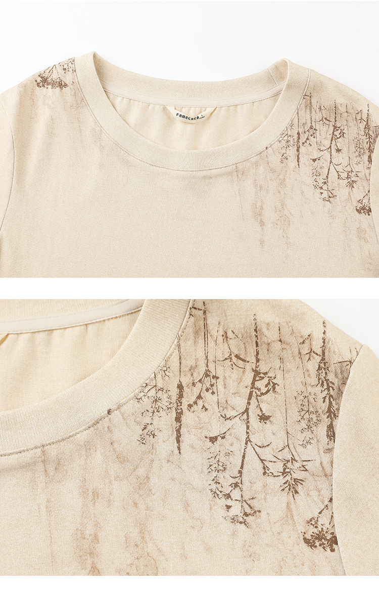 Famecoco复古双色蜡染全棉t恤女植物印花五分袖上衣FAC1BB005