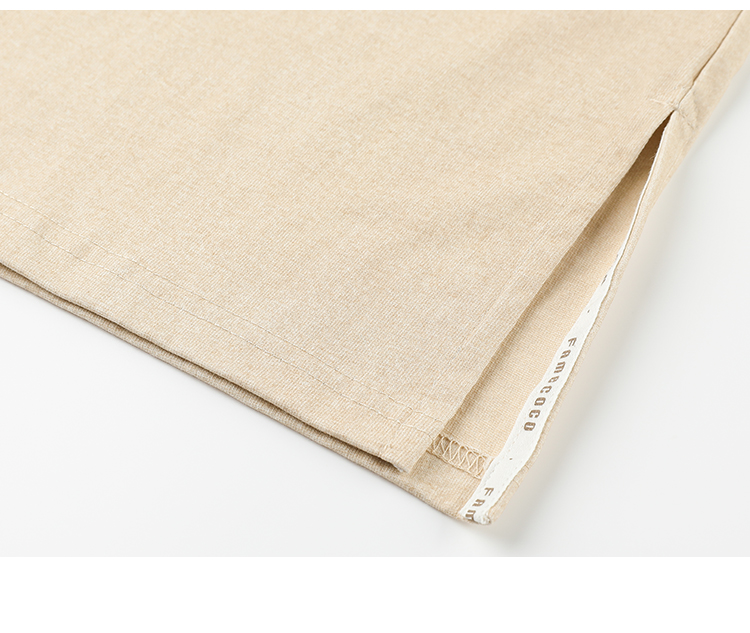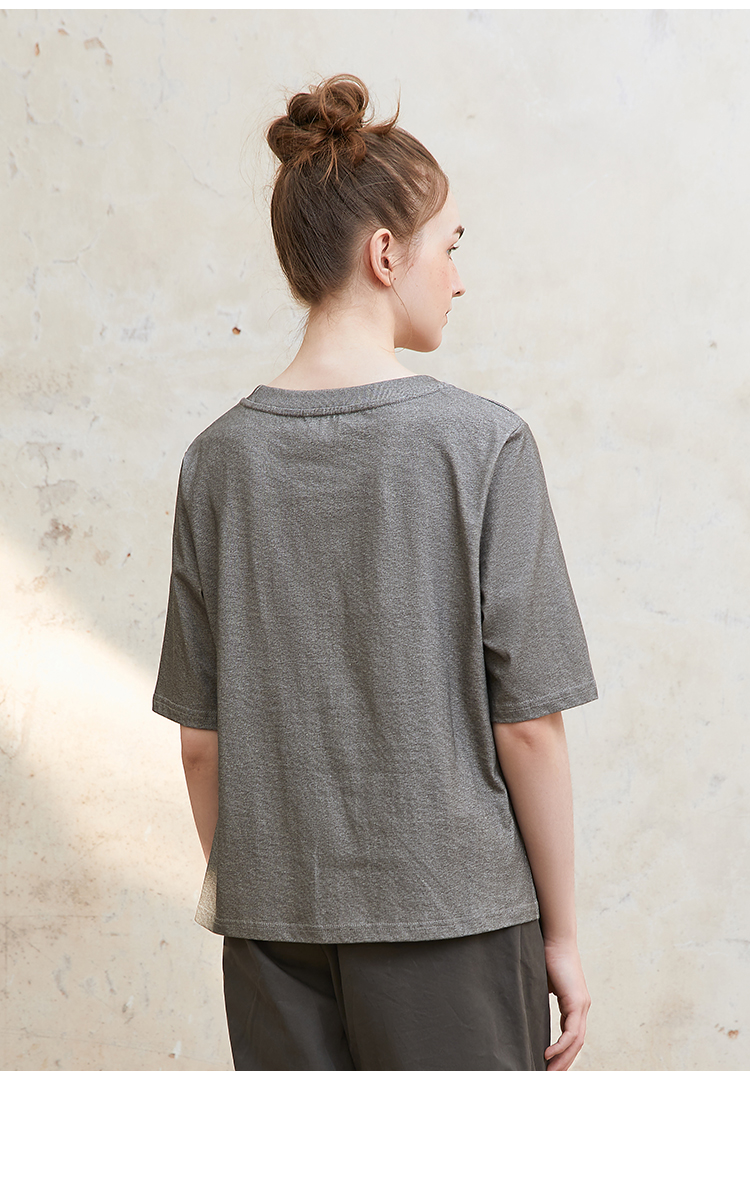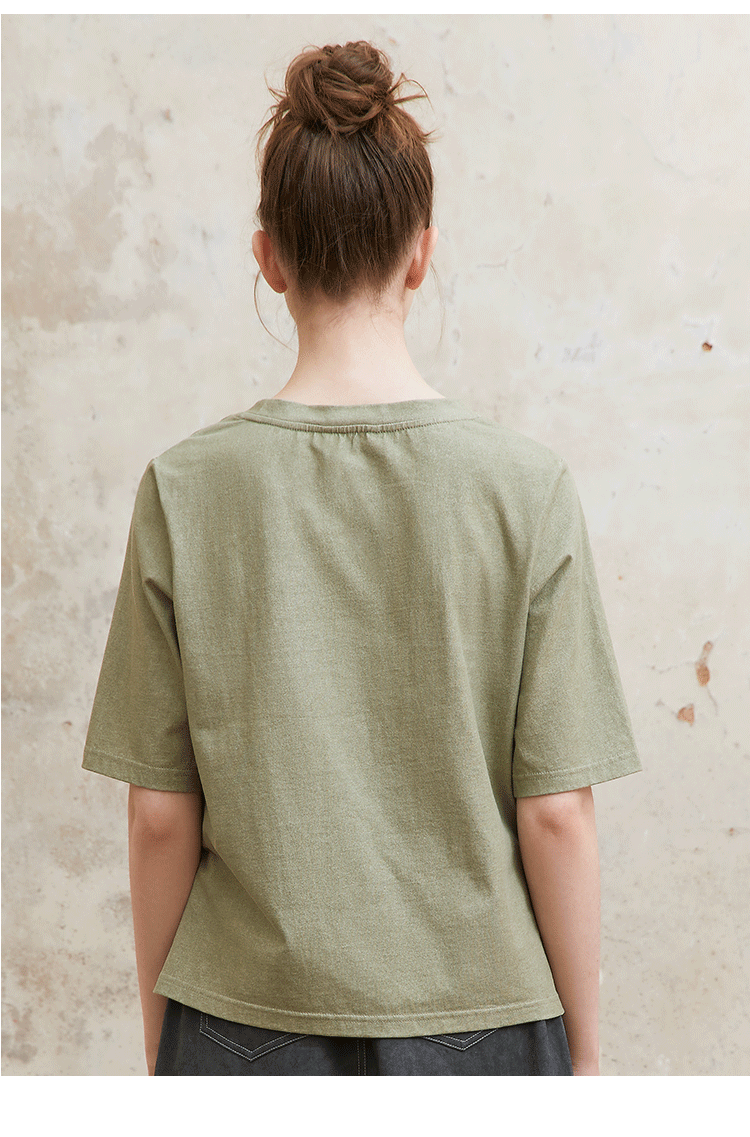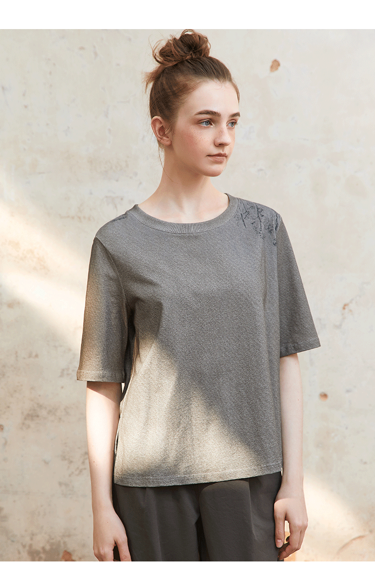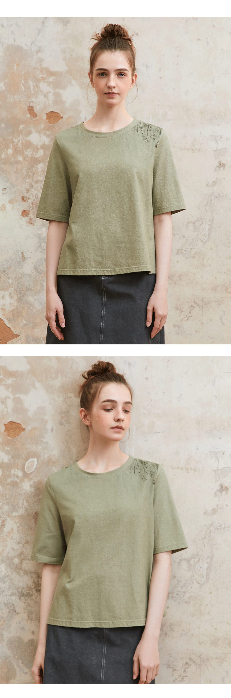 Famecoco复古双色蜡染全棉t恤女植物印花五分袖上衣FAC1BB005