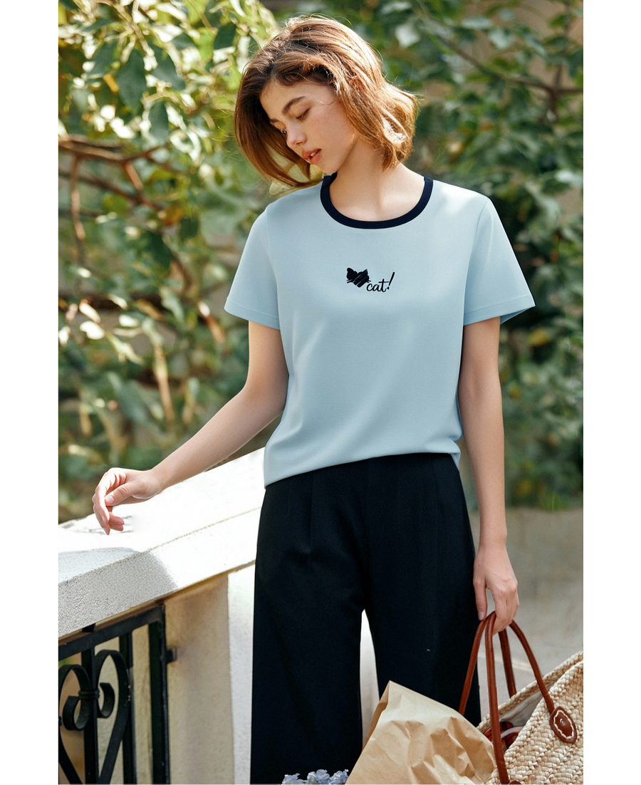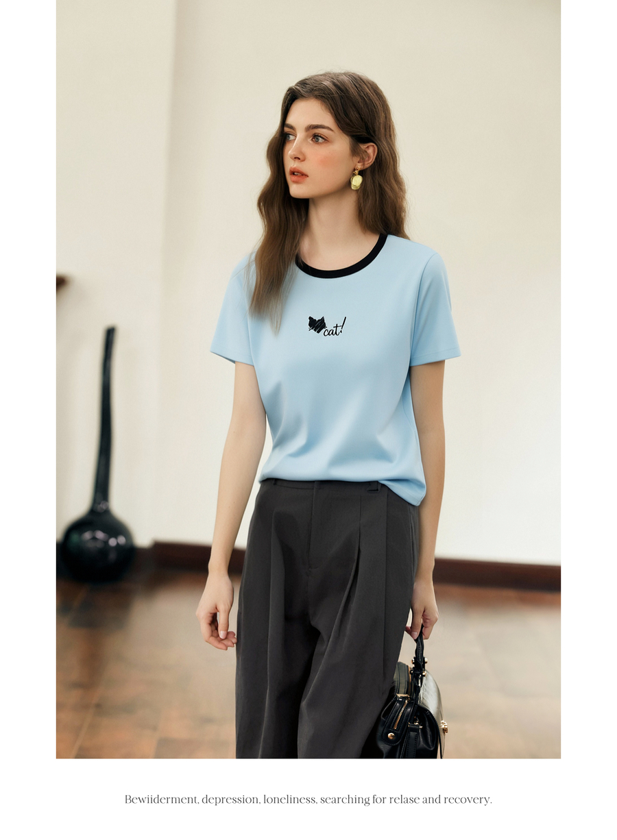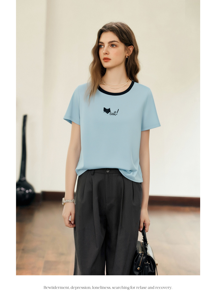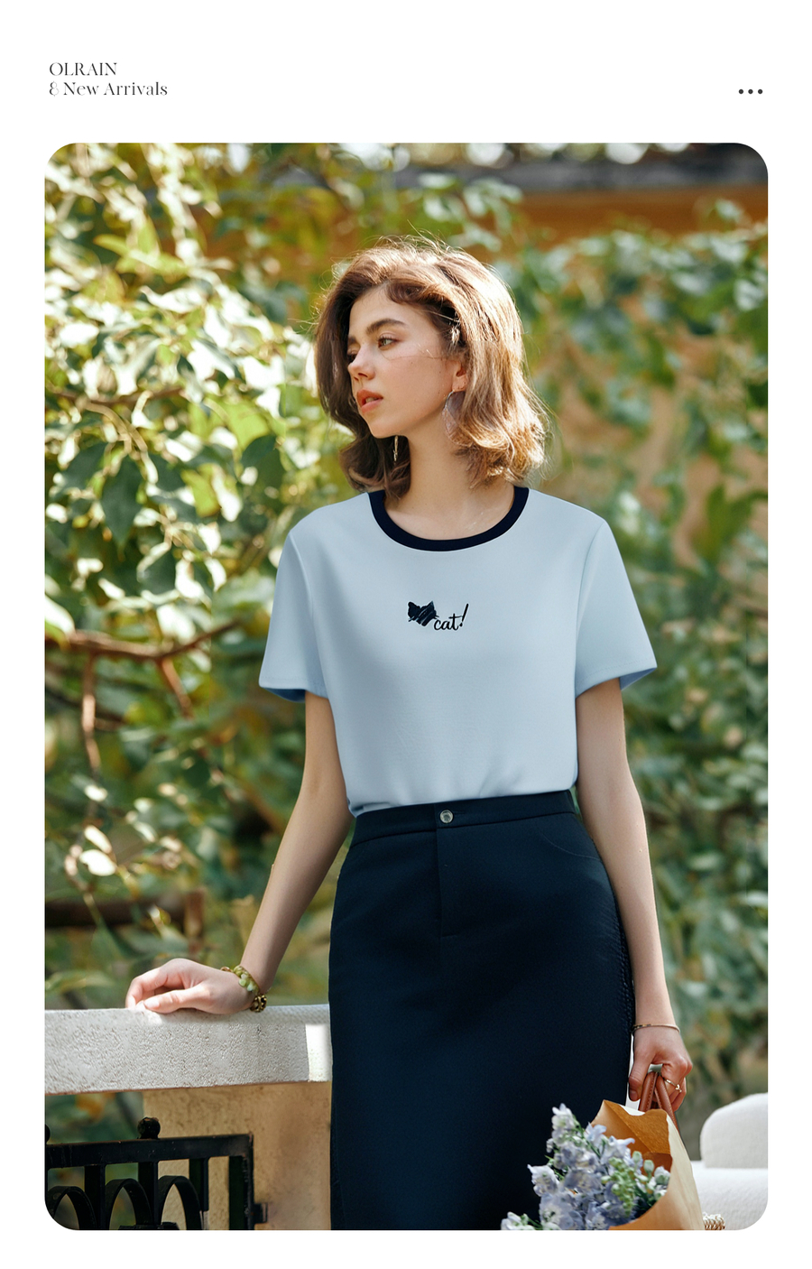 OLrain欧芮儿蓝色撞色领短袖T恤女夏季2025新款简约休闲圆领上衣