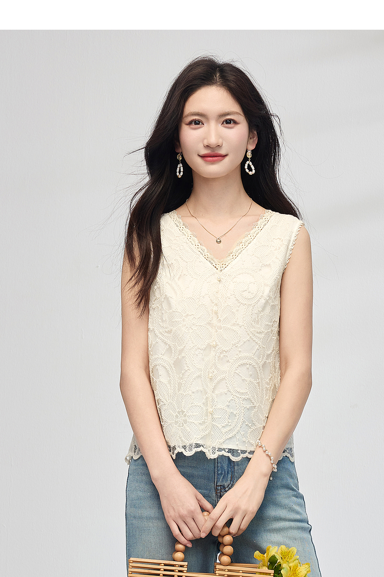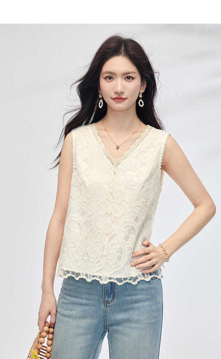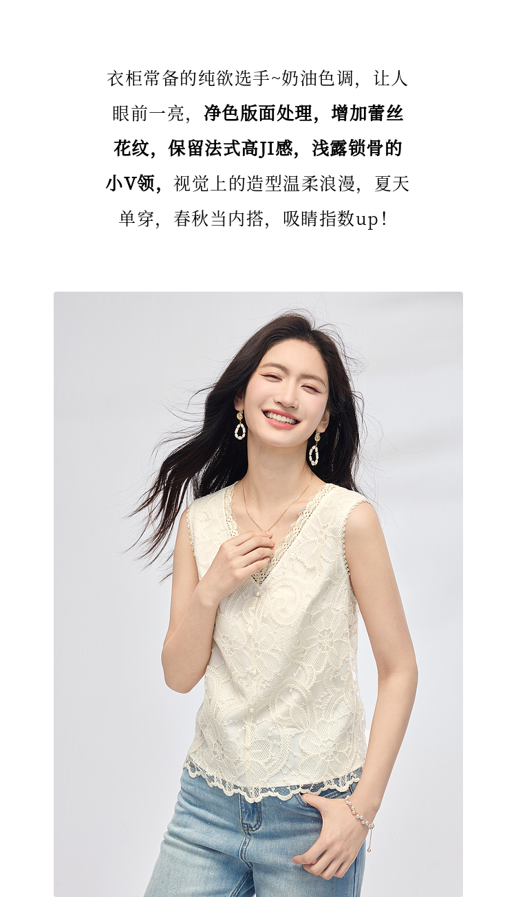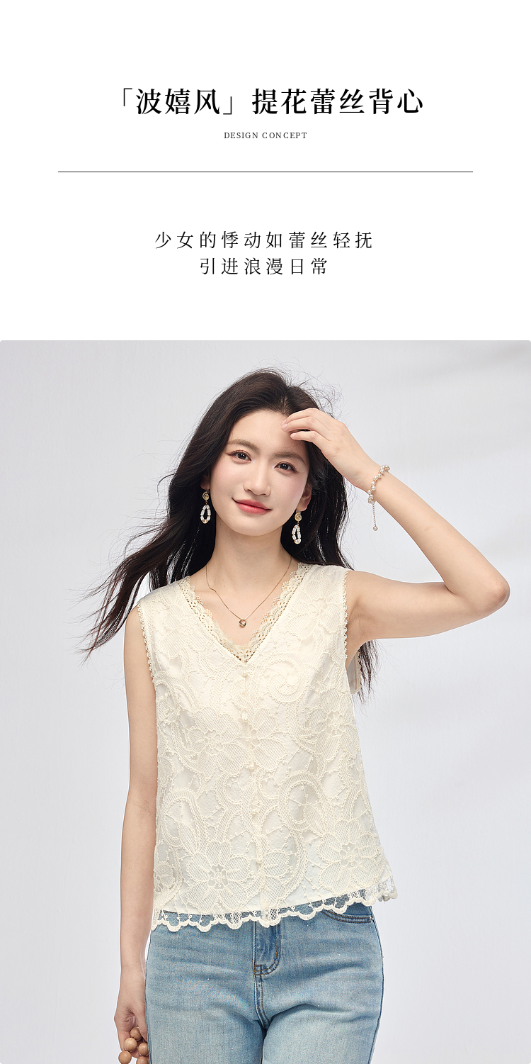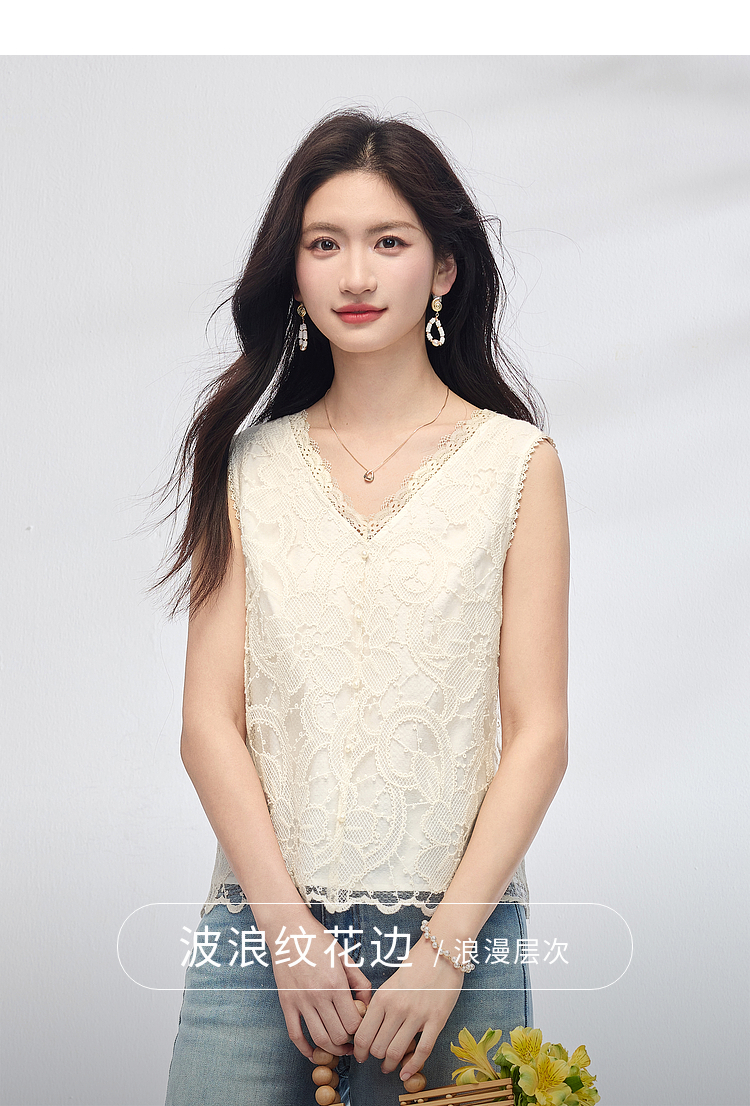 熙世界法式V领蕾丝背心女夏2025新款高级感刺绣外穿无袖马甲上衣
