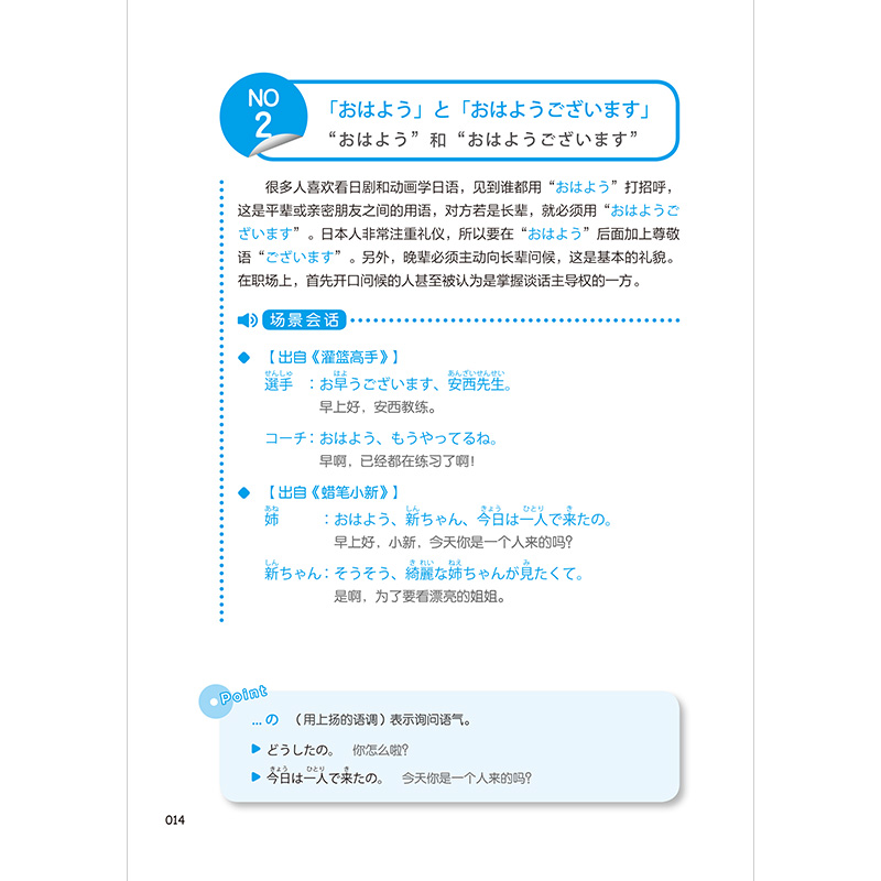 问候语是最基本的人类交往语言。就算是没有正式学过日语,我们从电影、电视上也常听到日本人打招呼的常用语:“おはよう”“こんにちは”“こんばんは”,这些都是“你好”的意思。听到这些问候语时,不用想怎么回答,只要重复对方说的话就可以了。一天内的不同时段使用不同的问候语。一般早上11点以前用“おはよう(ございます)”,即“早上好”,而白天的时间都可以用“こんにちは”来表示“你好”之意。