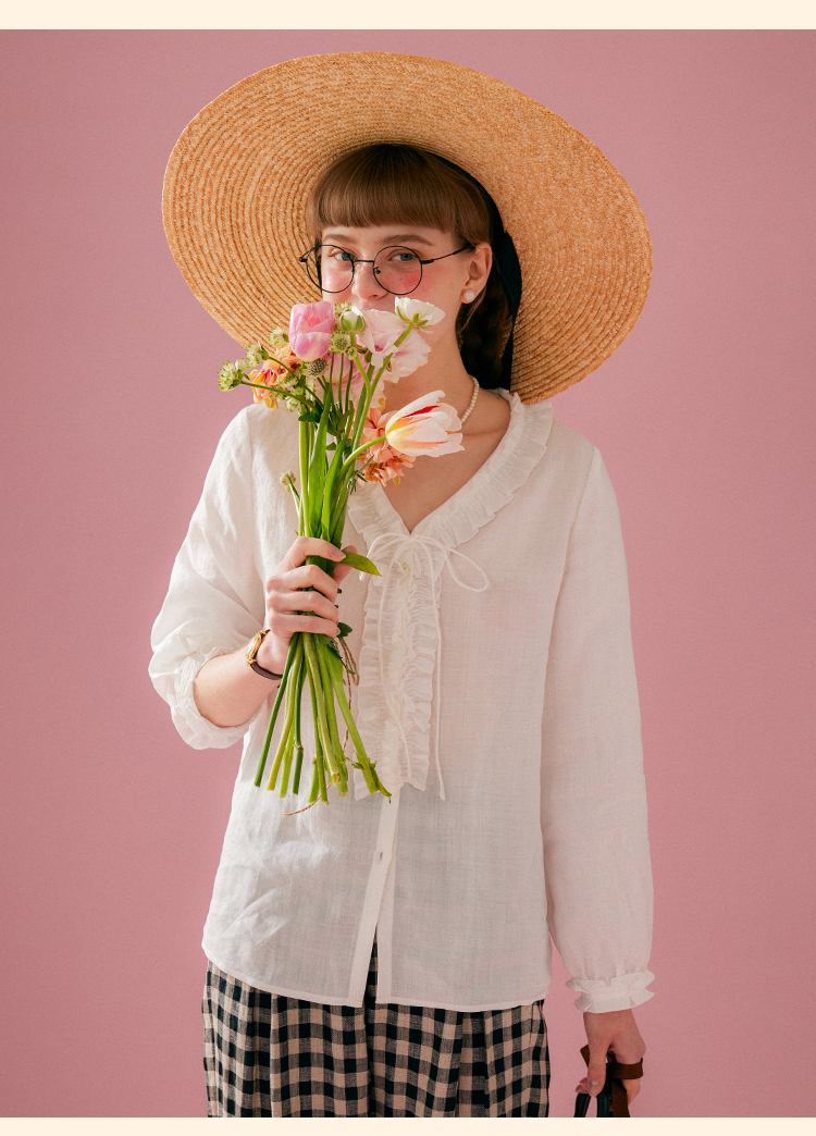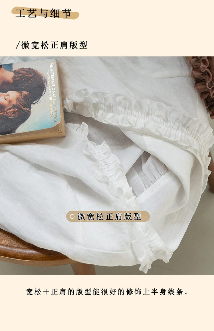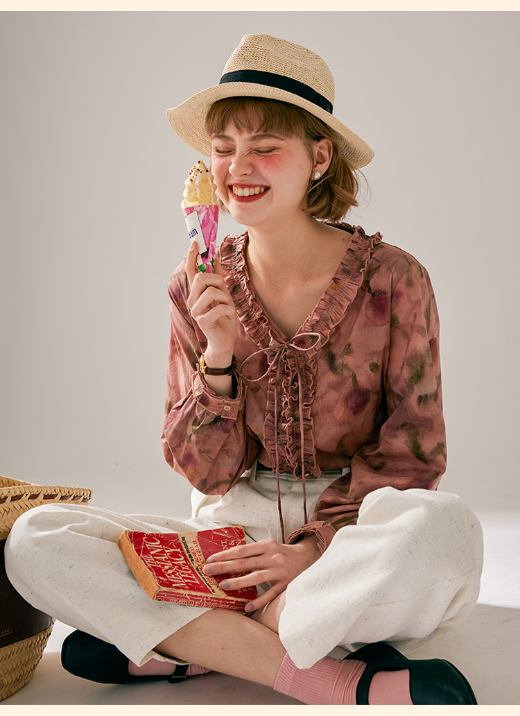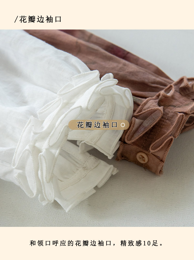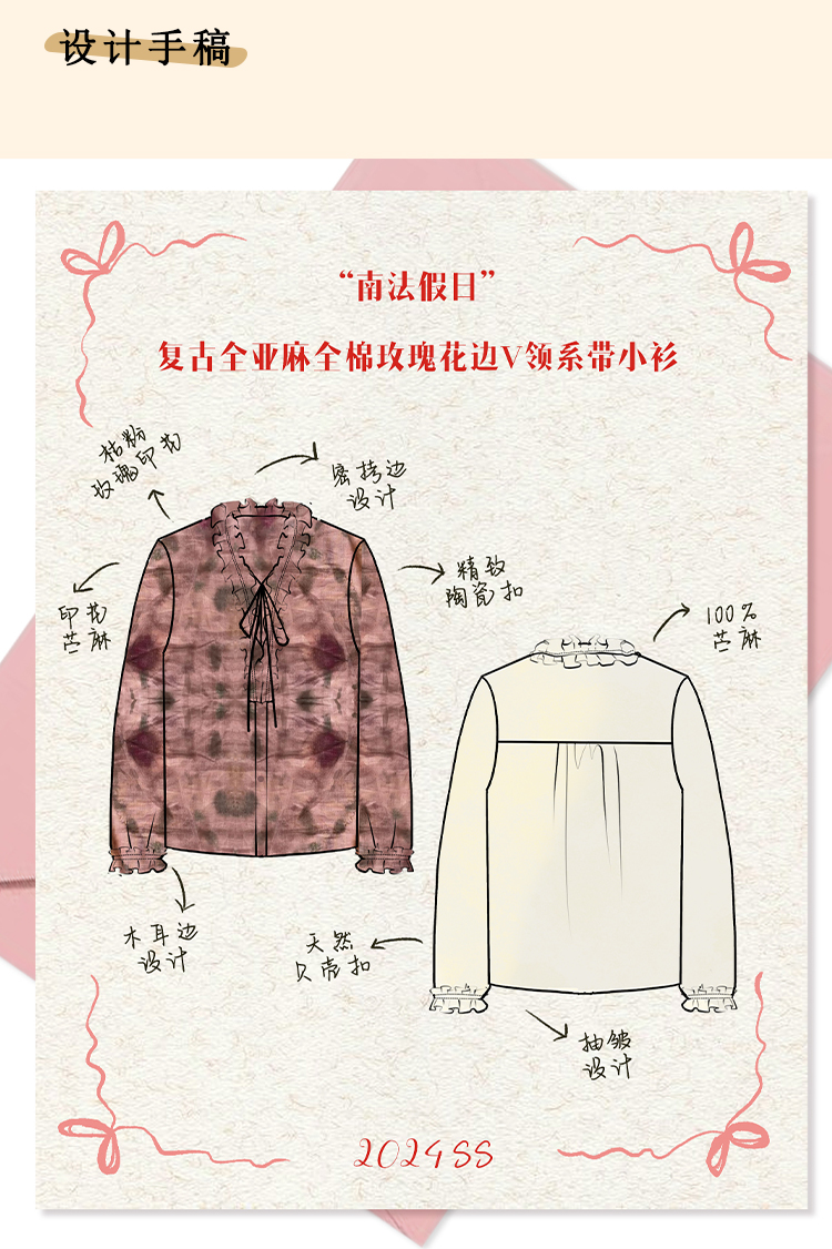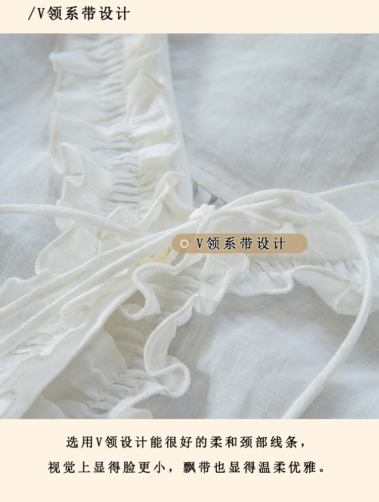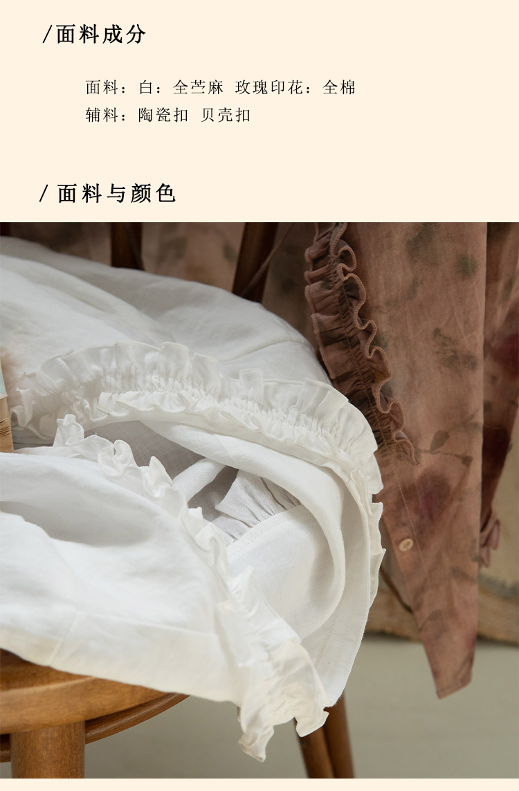 浮生八记/24A008/复古全亚麻全棉玫瑰花边V领系带小衫