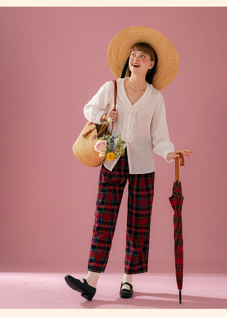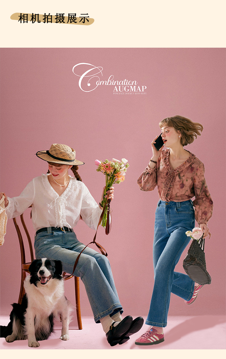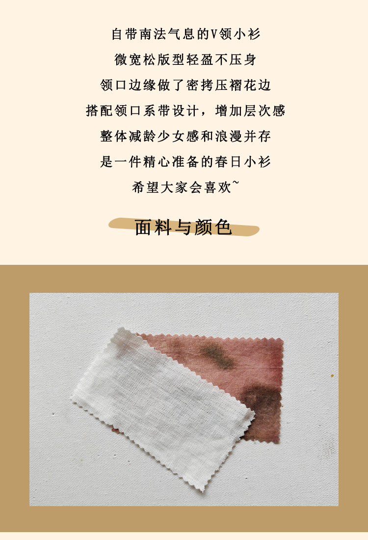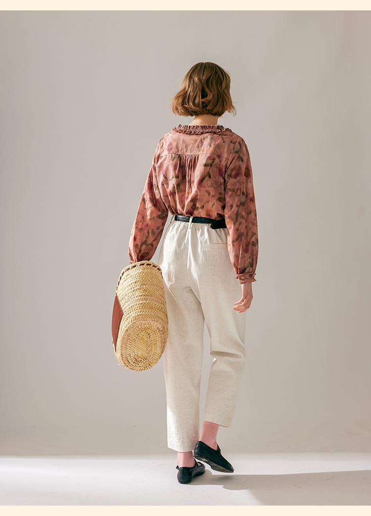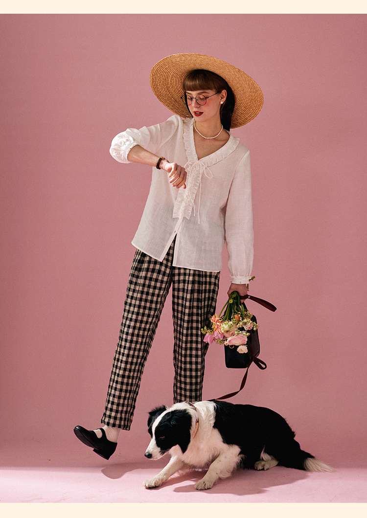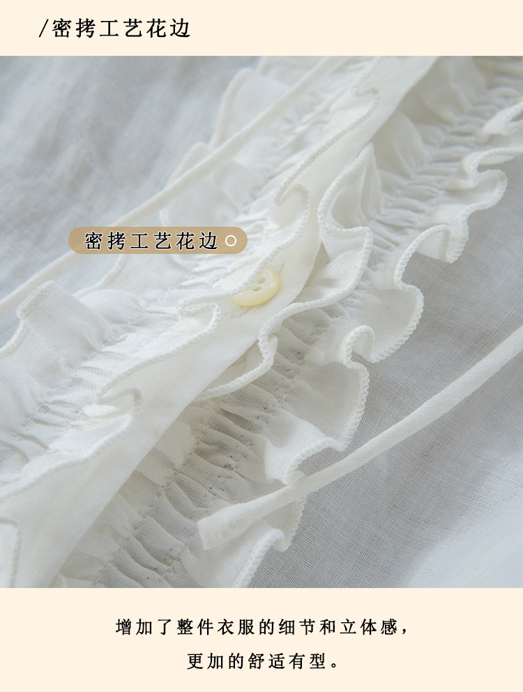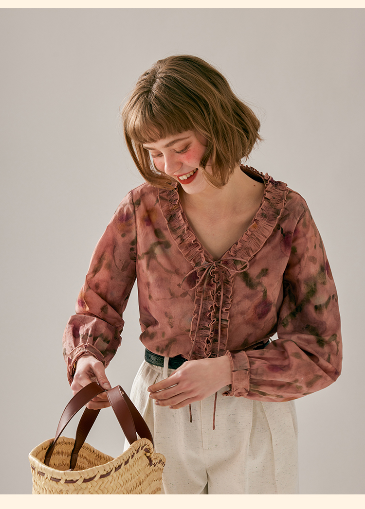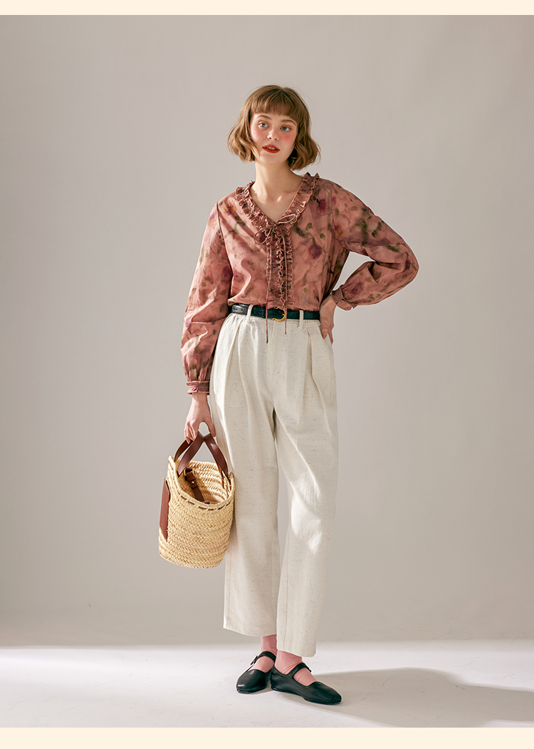 浮生八记/24A008/复古全亚麻全棉玫瑰花边V领系带小衫